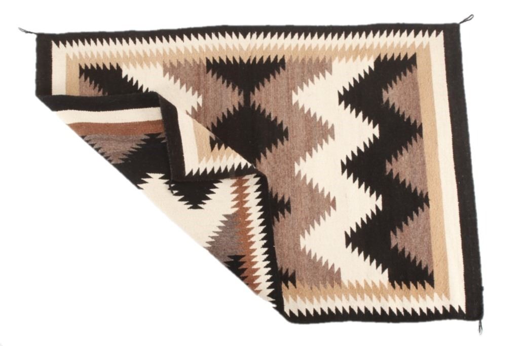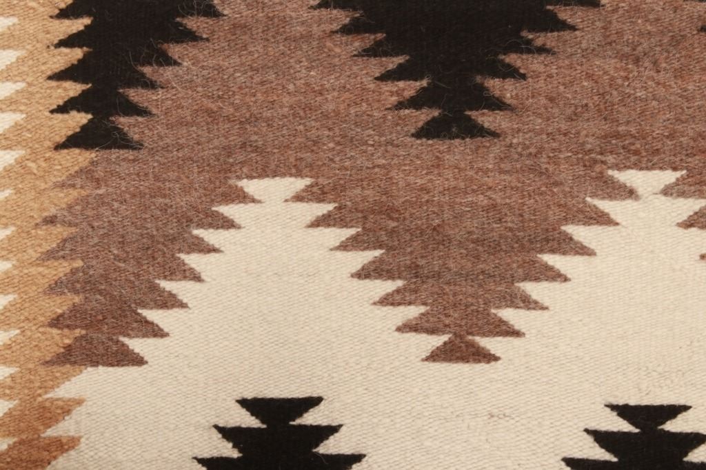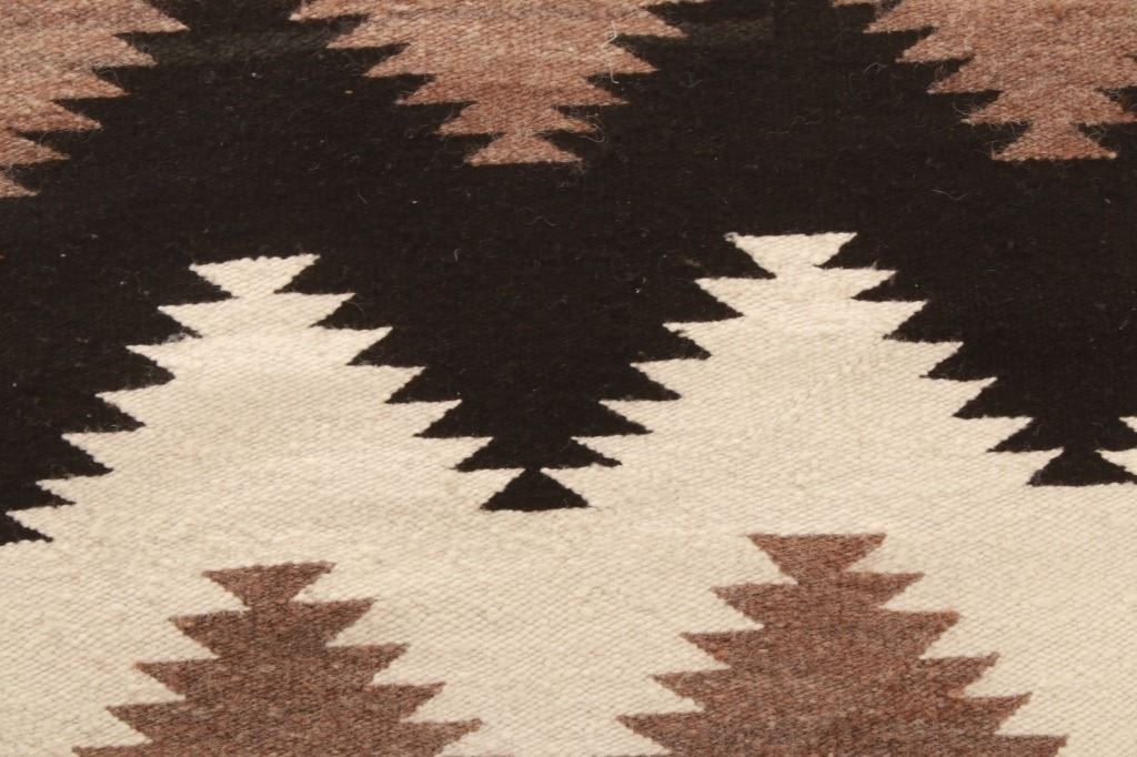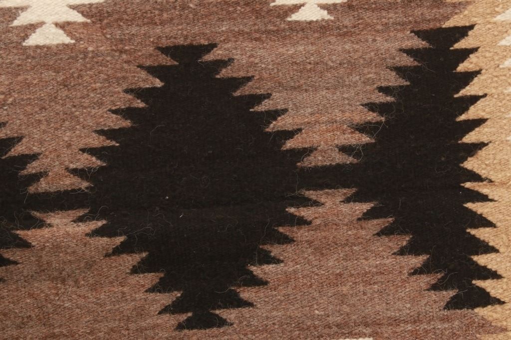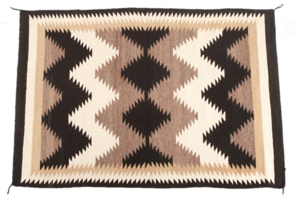 Featured in this lot is this Navajo crystal eye dazzler hand woven rug c. 1940's. This rug shows a beautiful design of traditional eye dazzler decoration with a black border and eye dazzler design with coloration of light brown, off white, brown and black. Originally, the Old Crystal trading post was established in 1894 in a remote part of the Navajo Reservation, southwest of Two Grey Hills and northwest of Gallup. In 1896, J.B. Moore purchased an interest in the trading post and re-named it Crystal after a pure sparkling mountain spring that was in the area. Due to the remoteness of the Trading Post, he started using a mail order catalog to sell his rugs to the Eastern market. The first catalog came out in 1903, with another in 1911. He left the reservation in 1911. During his stay at Crystal, he greatly influenced the change in styles of Navajo rugs produced at the Crystal Trading Post. The condition of this rug is good with no obvious signs of damage and in good overall condition. The measurements of this rug are 48 1/2" x 34".