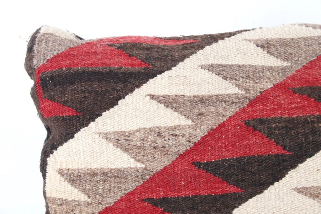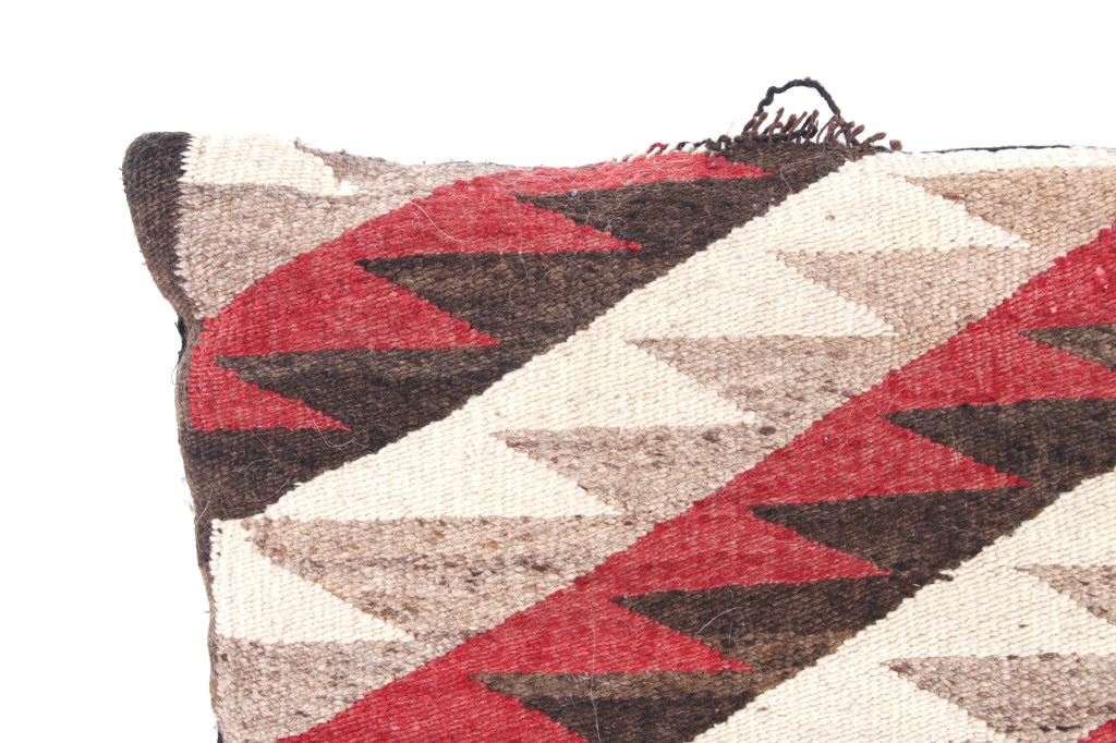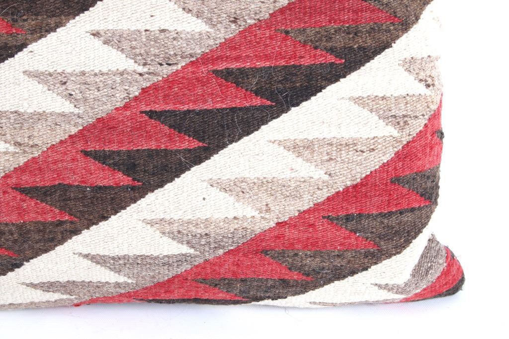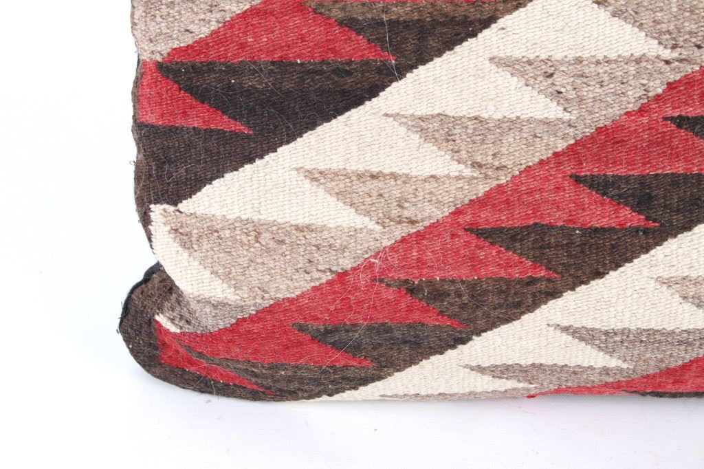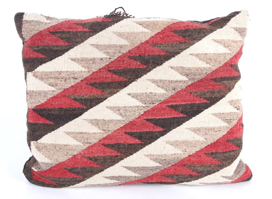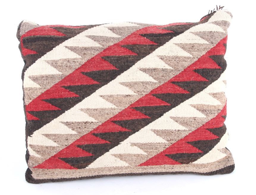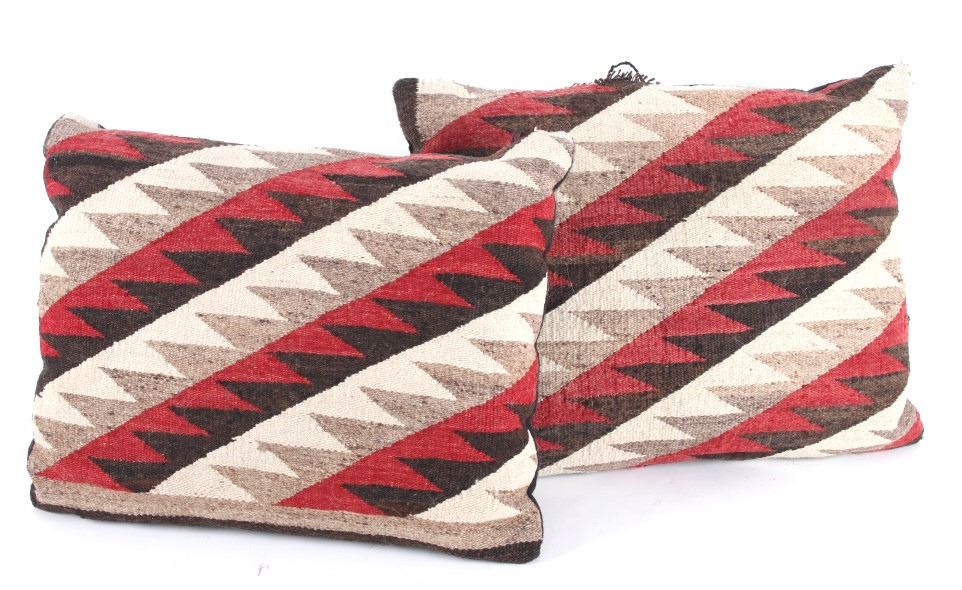 Featured in this lot is this Navajo Crystal Eye Dazzler lumbar pillow set. The pillows feature a wonderfully and professionally crafted wool construction that features a traditionally crafted eye dazzler construction that shows coloration of dark brown, light brown, black, red all set to a off white field. The condition of this pair of pillows is fair to good with some slight damage to the weave of the pillows towards the top of the pillows but shows fair to good overall condition. The measurements of this pair of pillows is 14 1/2" x 18 1/2" x 5". Provenance: From the renowned Sundog Fine Art Bozeman, Montana collection and collected by Bruce VanLandingham. Bruce VanLandingham was a pillar in the American Indian collecting community and a respected expert. Along with being an avid collector, Bruce also was the sole owner of Sundog Fine Art Gallery in Bozeman, which was both part museum and gallery.