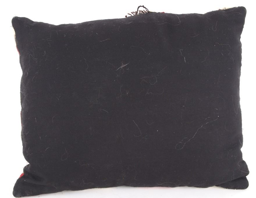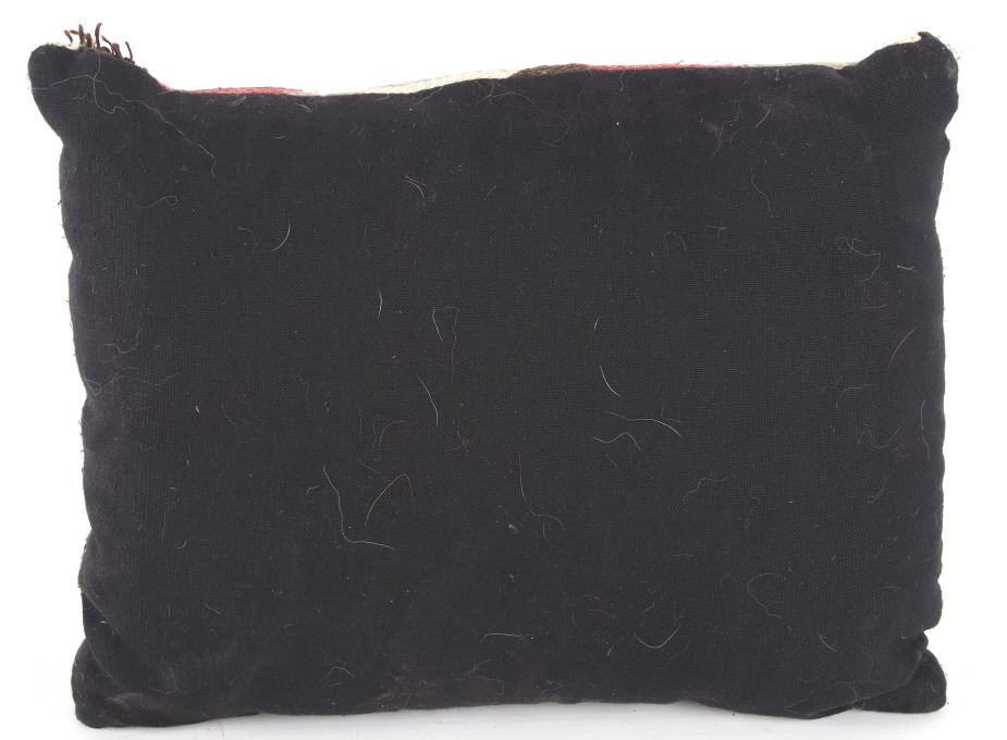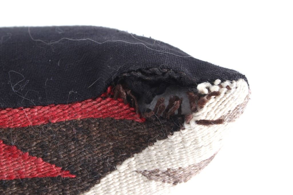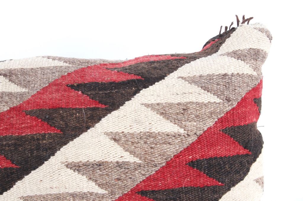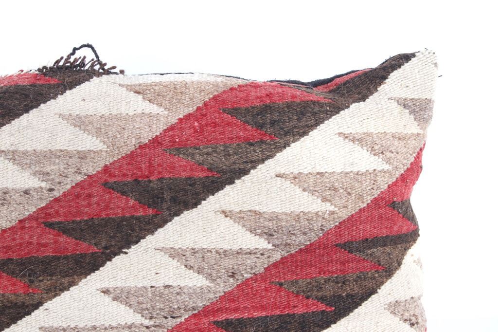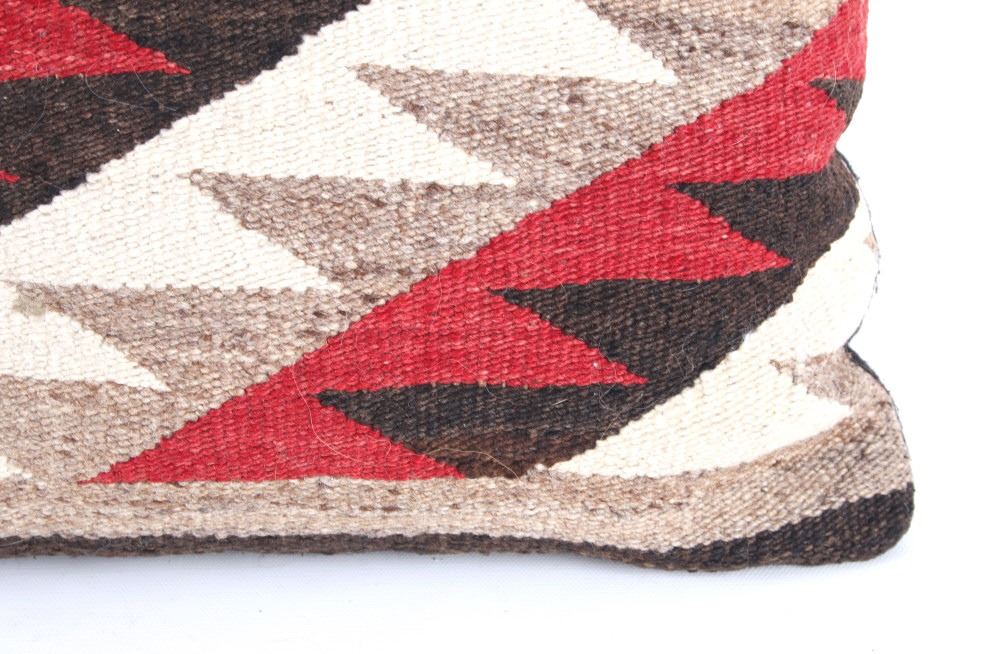 Featured in this lot is this Navajo Crystal Eye Dazzler lumbar pillow set. The pillows feature a wonderfully and professionally crafted wool construction that features a traditionally crafted eye dazzler construction that shows coloration of dark brown, light brown, black, red all set to a off white field. The condition of this pair of pillows is fair to good with some slight damage to the weave of the pillows towards the top of the pillows but shows fair to good overall condition. The measurements of this pair of pillows is 14 1/2" x 18 1/2" x 5". Provenance: From the renowned Sundog Fine Art Bozeman, Montana collection and collected by Bruce VanLandingham. Bruce VanLandingham was a pillar in the American Indian collecting community and a respected expert. Along with being an avid collector, Bruce also was the sole owner of Sundog Fine Art Gallery in Bozeman, which was both part museum and gallery.