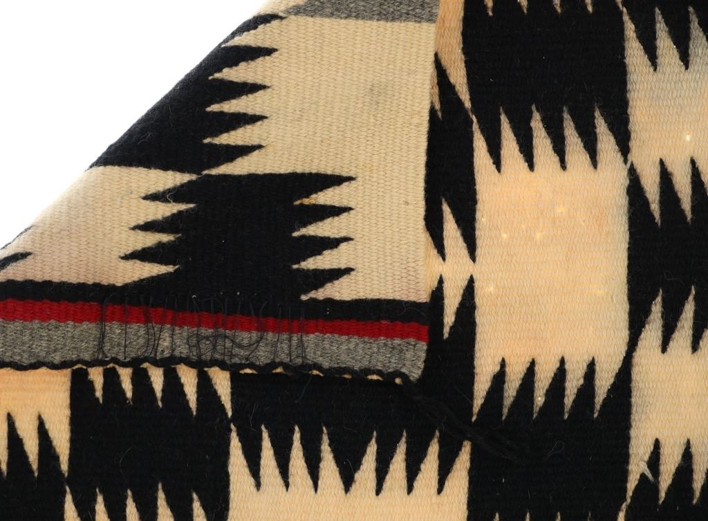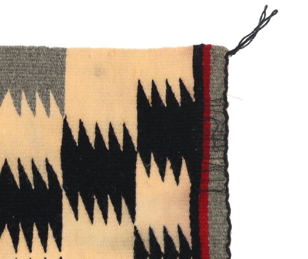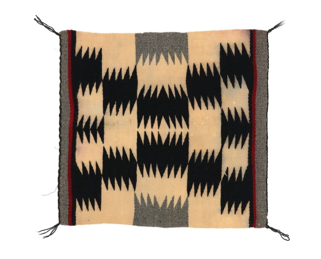 Featured in this lot is this Navajo Crystal Eye Dazzler salesman sample rug circa 1930's. The rug features a wonderfully and professionally crafted wool construction that shows sprits of crystal design with black and grey coloration set to the off white field with bands of red, black, and grey to either side of the rug. The condition of this Navajo rug is well preserved with some fading to the naturally dyed segments but otherwise is well preserved. The condition of this Navajo rug is 19" x 17 1/2". The thread count is 98 threads per square inch.