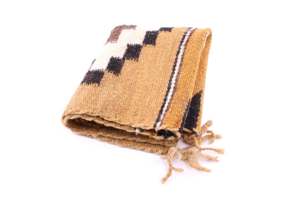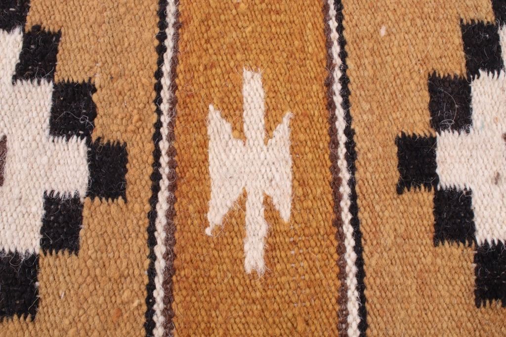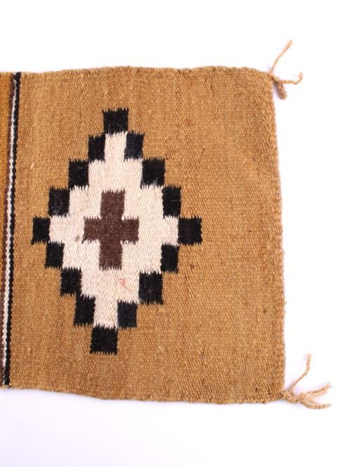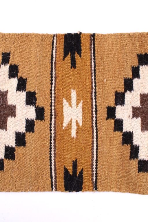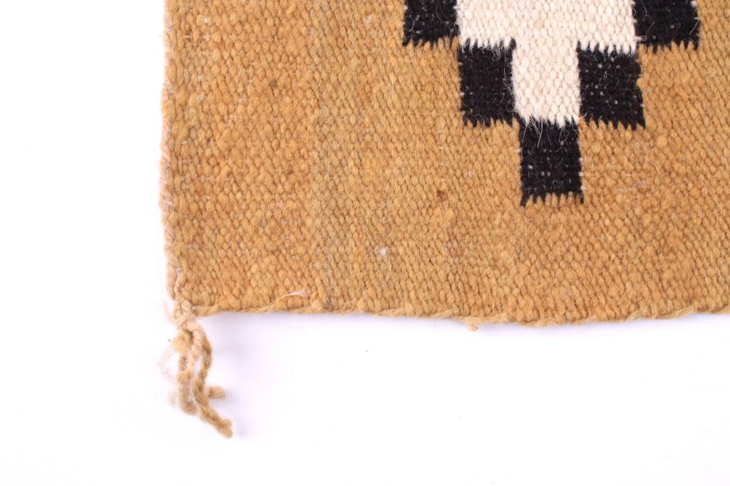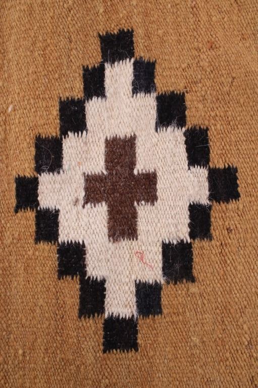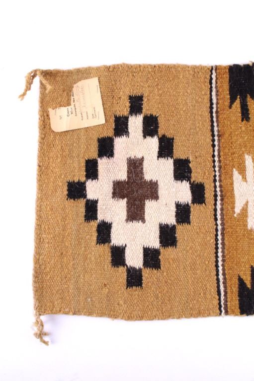 Included in this lot is a Navajo Native American crystal rug from Crownpoint made by Juanita King.   The rug dates to the mid-20th century and is from the Crownpoint Rug Weavers Association/ Trading Post. In circa 1950-1960’s, the Crownpoint Rug Weavers Association founded the Crownpoint Rug Auction, which is still in operation today. The piece comes with the original manila tag from Crownpoint Rug Weavers Assn. from Crownpoint, New Mexico, signed and marked by Juanita King. The rug is all soft wool and hand knitted, showing a tan background and crystal pattern of black, white, and brown. The rug is in good condition for its age and measures 25 1/2" by 14 1/4".