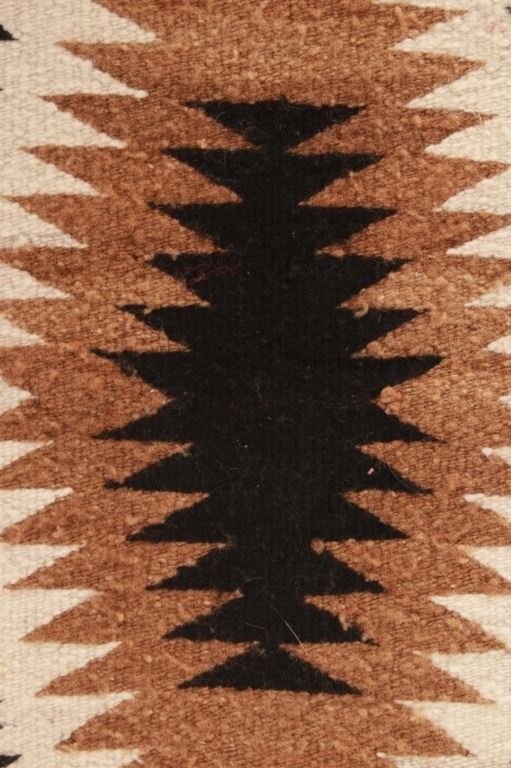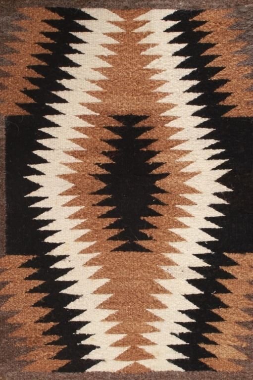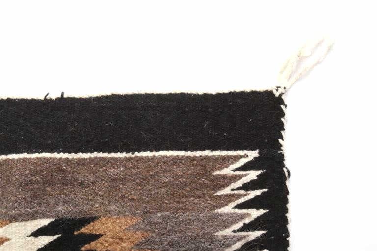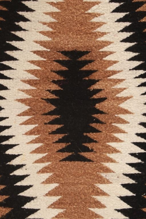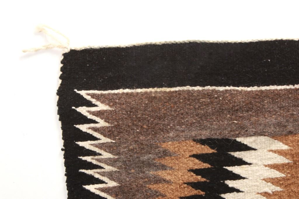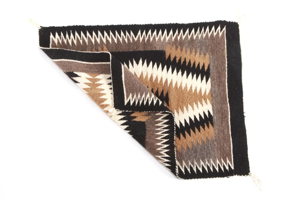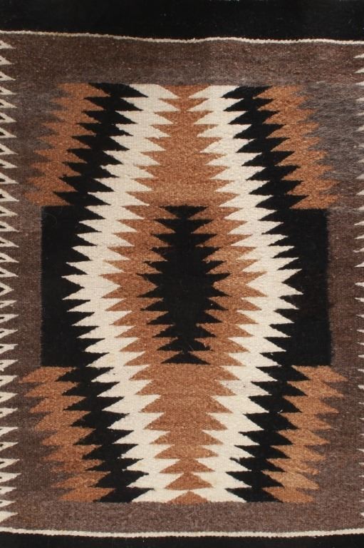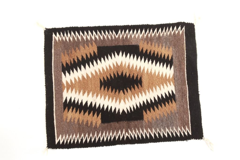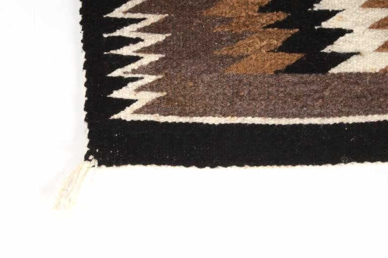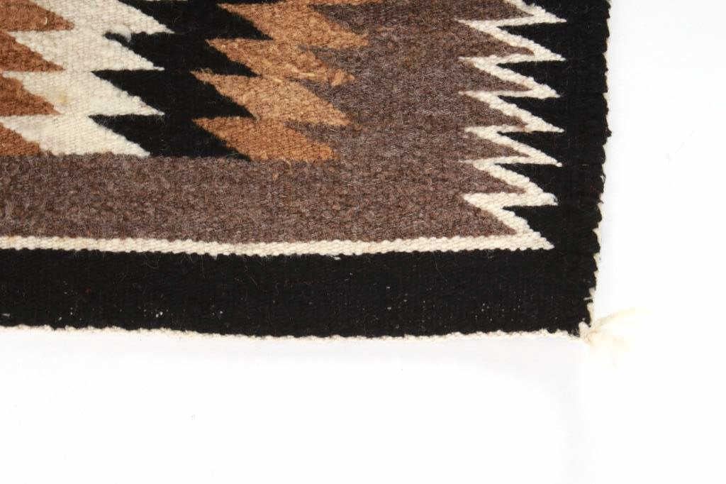 Featured in this lot is this Navajo Crystal Trading Post eye dazzler rug circa 1950's. The rug shows a wonderfully and professionally crafted Crystal Trading Post eye dazzler design with with a off white and black border and eye dazzler decoration with coloration of dark brown, light brown, black and off white. The condition of this rug is good with no obvious signs of damage and in good overall condition. The rug measures 29" x 22 1/2".