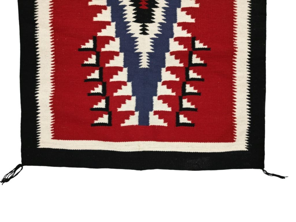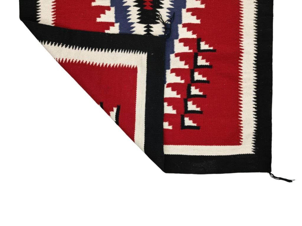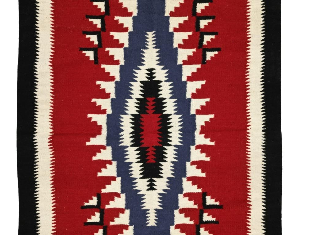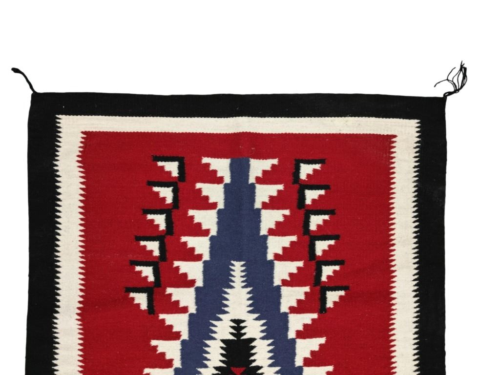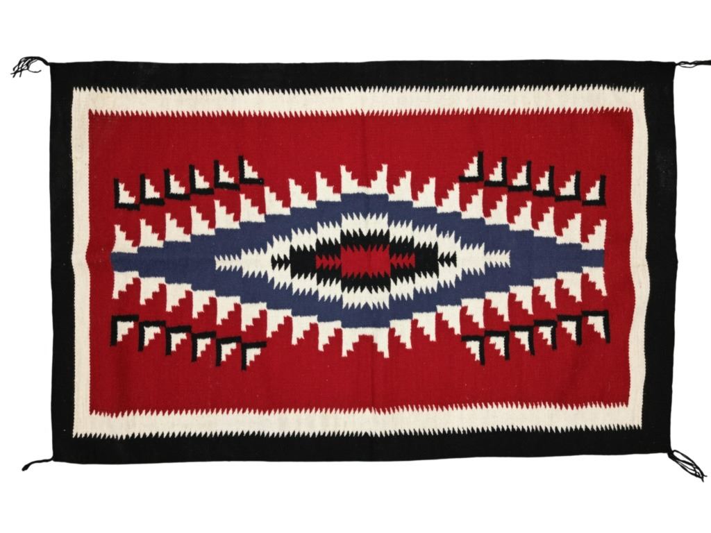 Featured in this lot is this Navajo Crystal Trading Post storm pattern rug circa 1960's. The rug features a wonderfully and professionally crafted wool construction that shows a crystal dazzler storm pattern design with two borders of white and black coloration and shows a red field with a dazzler central medallion with coloration of white and black. The condition of this Navajo rug is well preserved with no obvious signs of damage and shows a well preserved overall condition. The measurements of Navajo rug is 73 1/2" x 48".