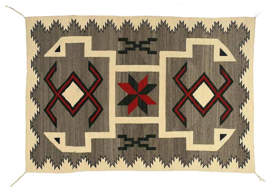 Navajo Crystal Weaving. 4'11" x 3'4" storm pattern in grey, white, black & red with spider, water bug & Valero star elements. Circa 1940. (est. $1,500-2,000). CONDITION REPORTS: www.auctioninsantafe.com/docs/cr2012.pdf