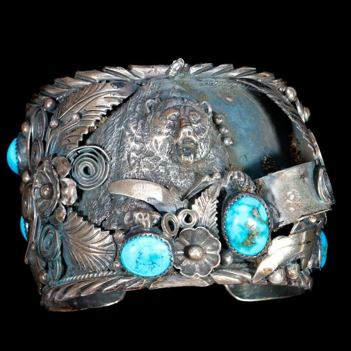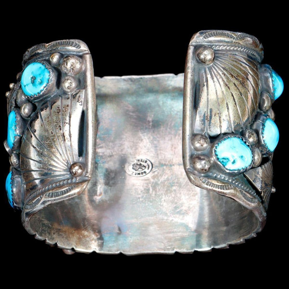 An old pawn turquoise and silver cuff bracelet. Largest example is approximately: 2 inches wide. Approximate size: 6 3/4 inches, which includes the additional wrist gap. Approximate total weight: 149 g. With maker's mark.