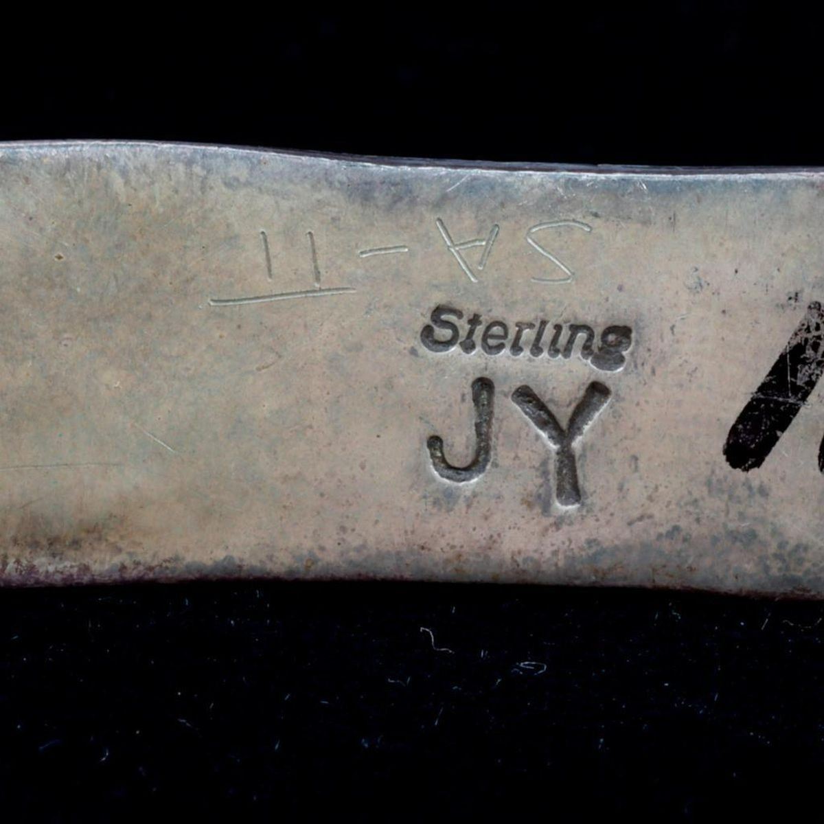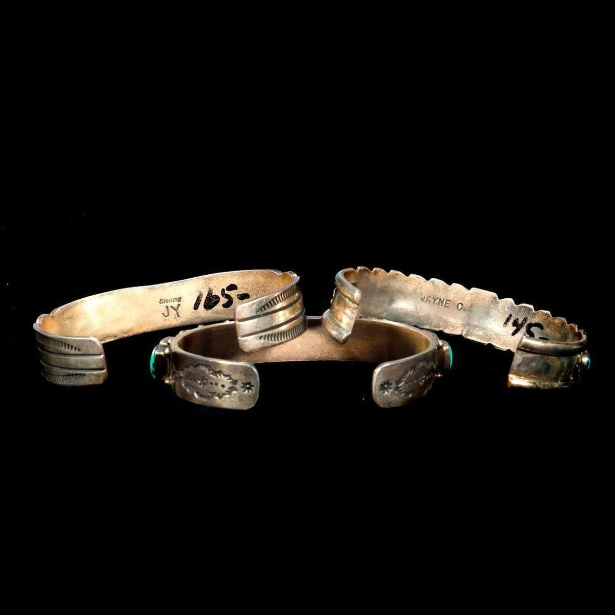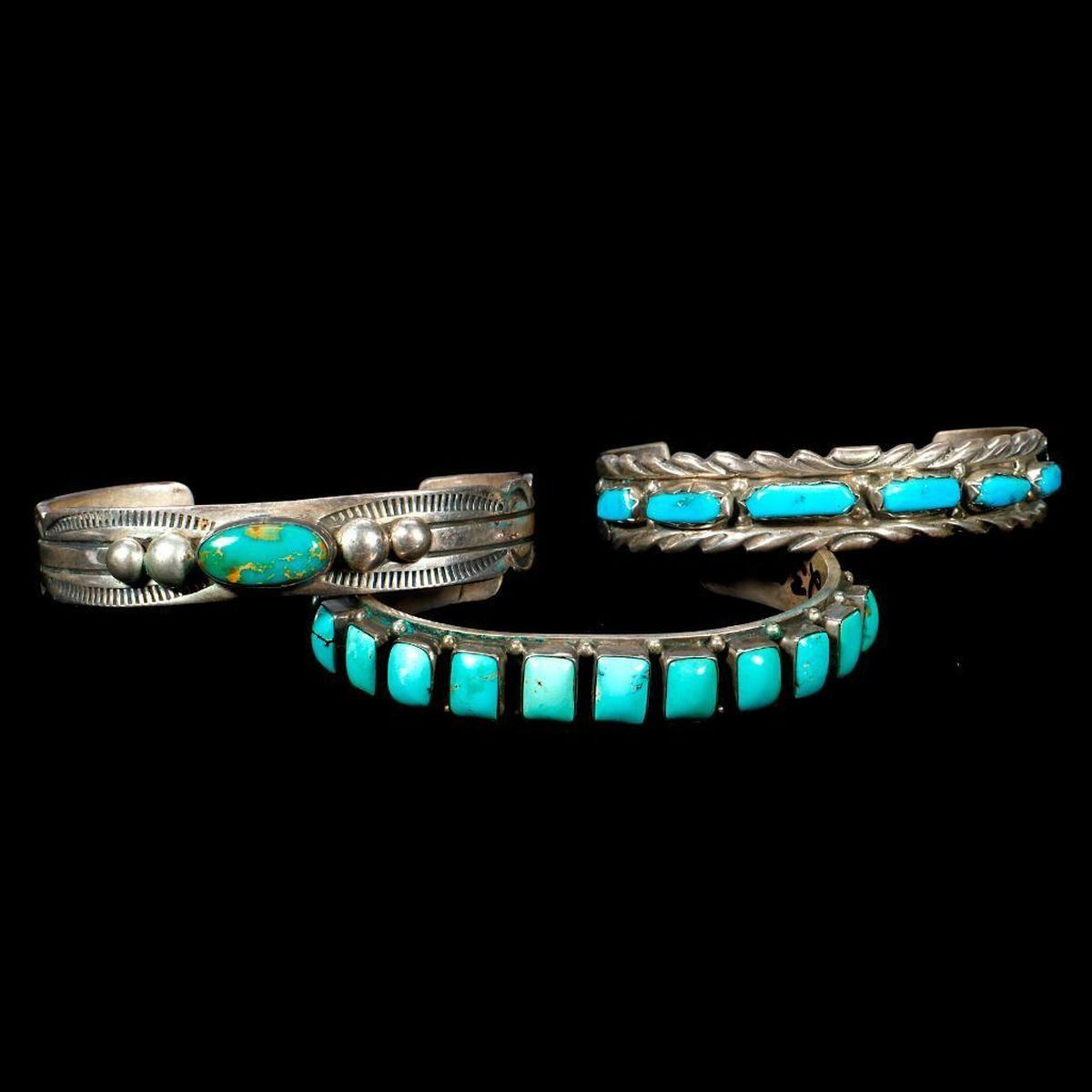 Three (3) old pawn turquoise and silver cuff bracelets. Largest example is approximately: 1 1/4 inches wide. Approximate size: 6 3/4 and 6 1/2 inches, which includes the additional wrist gap. Approximate total weight: 91 g. One with sterling mark, two with maker's mark.