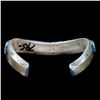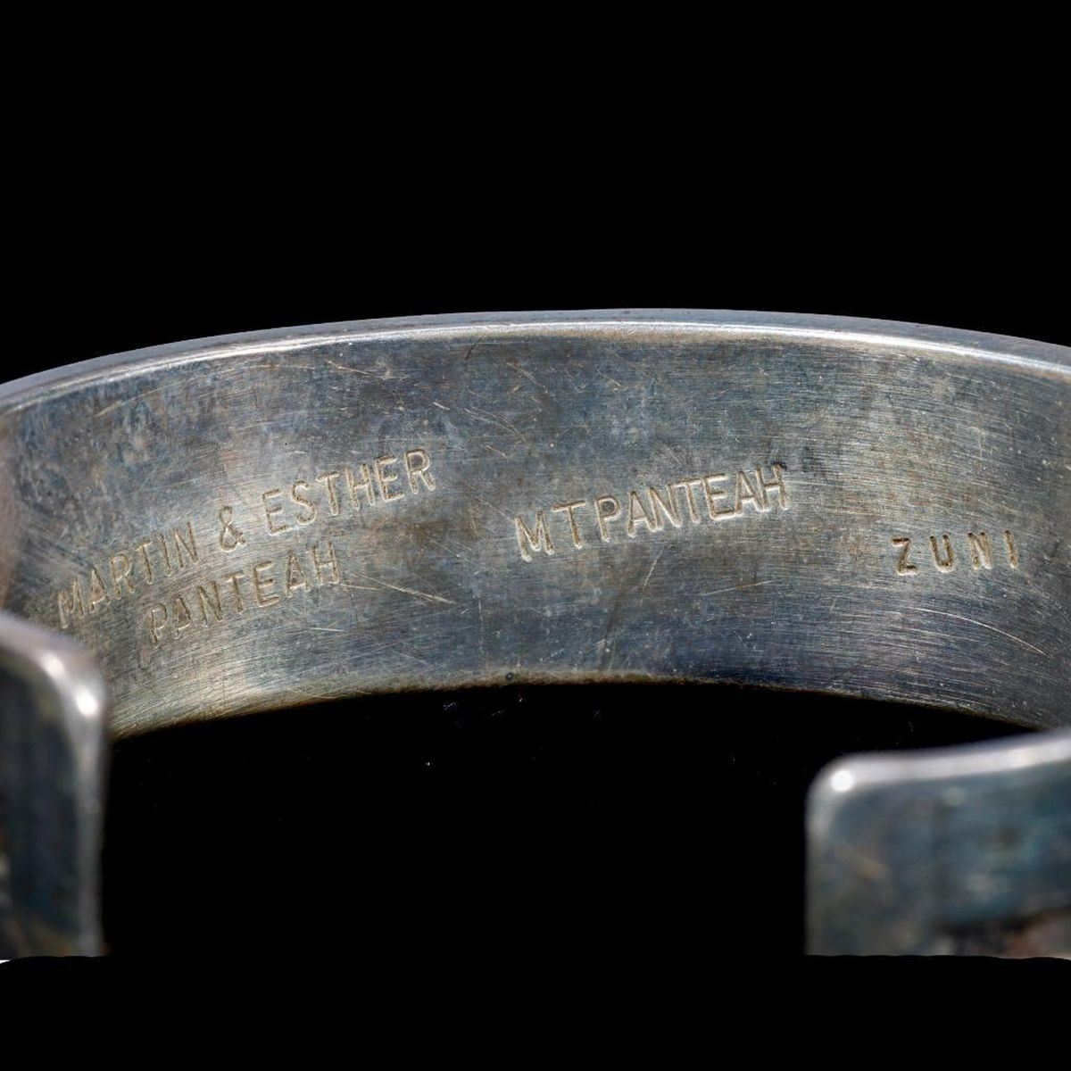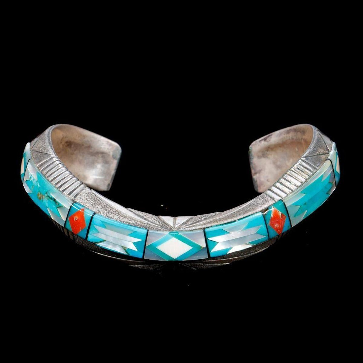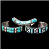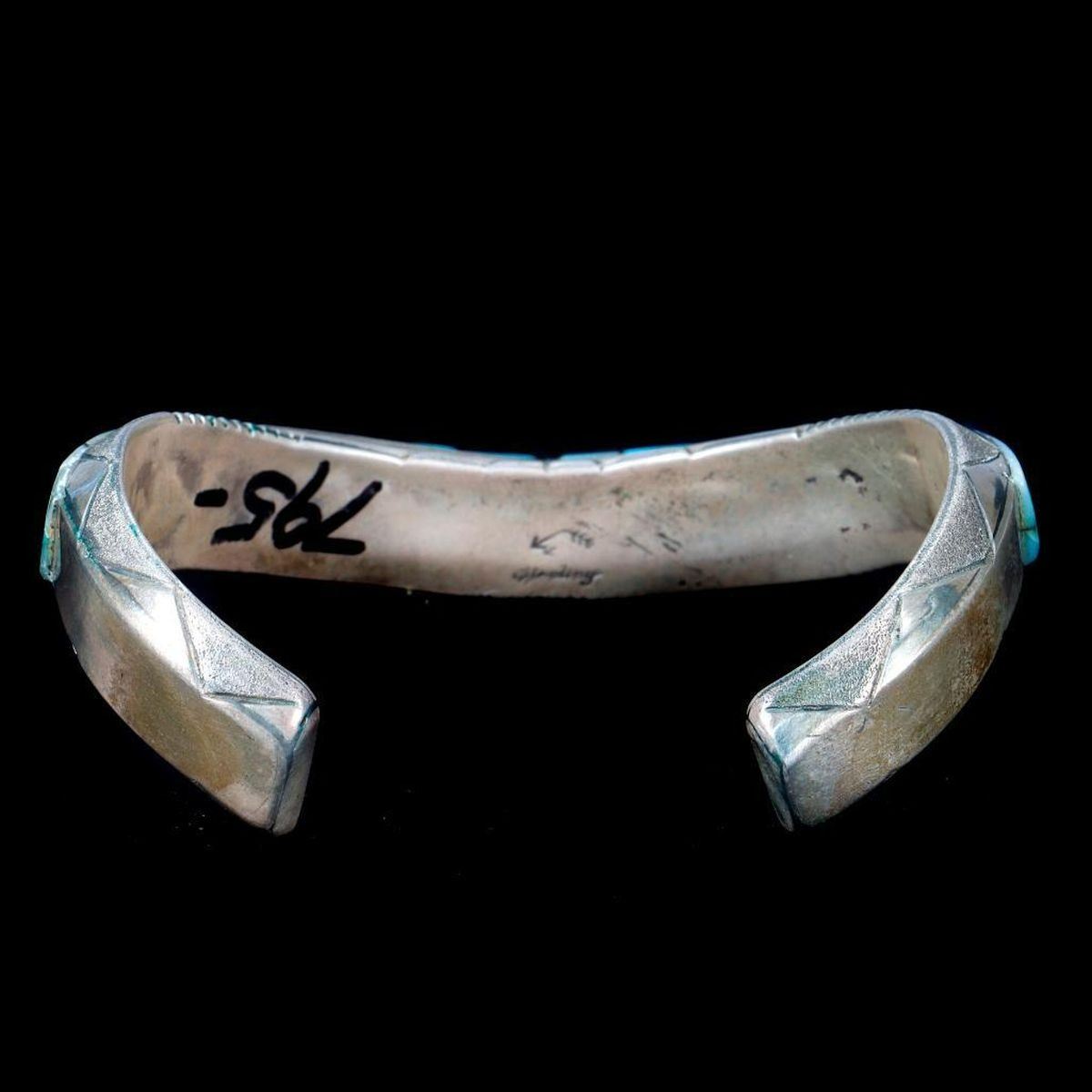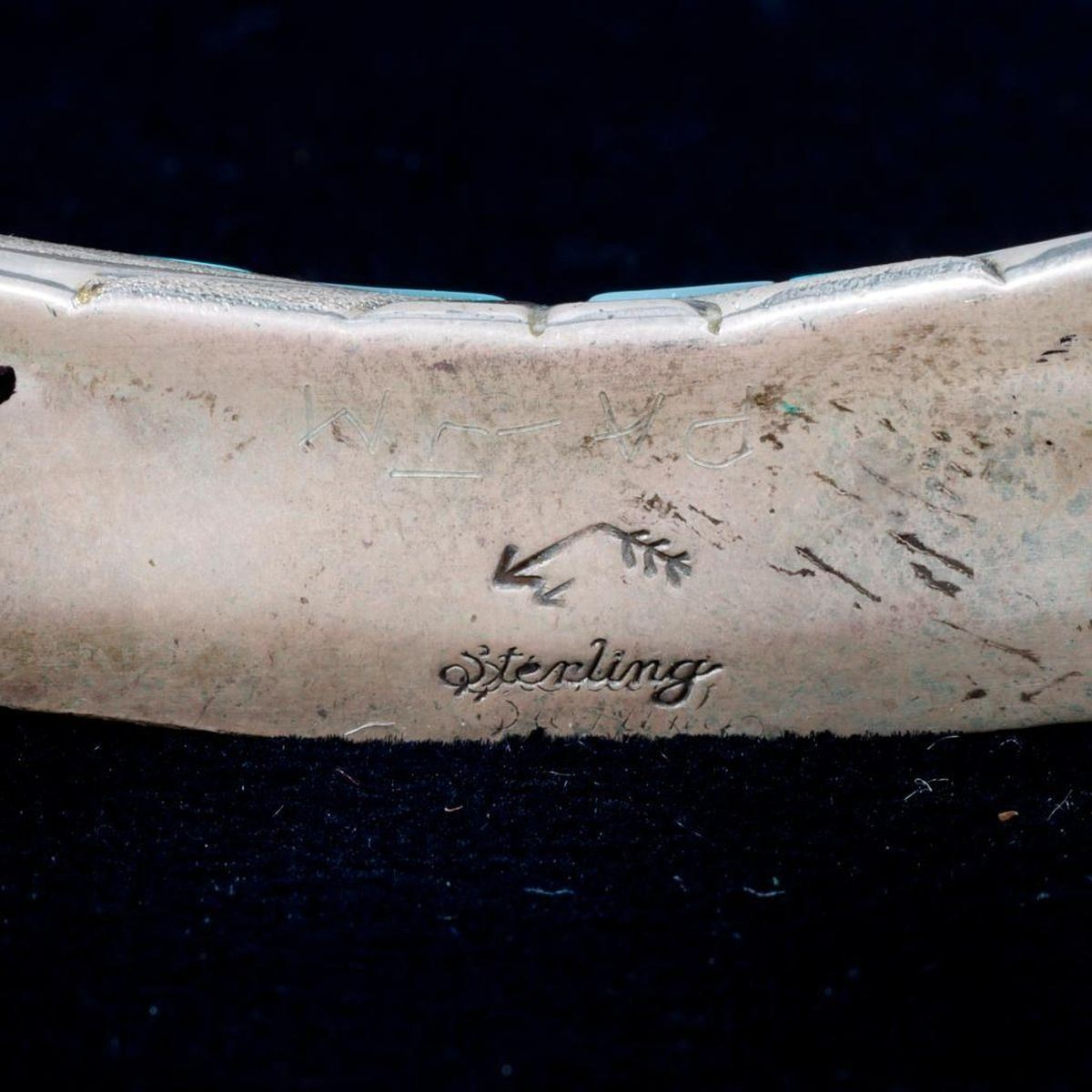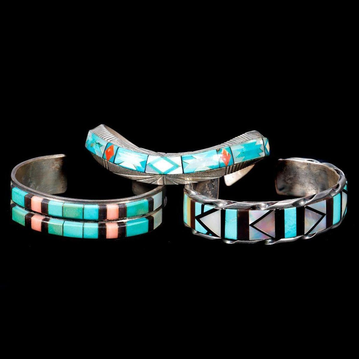Three old pawn turquoise, hard stone and silver cuff bracelets. Largest example is approximately: 1/2 inches wide. Approximate size: 7 and 6 1/2 inches, which includes the additional wrist gap. Approximate total weight: 106 g. Both with sterling mark, one with maker's mark. Note: small loss to one bracelet.
