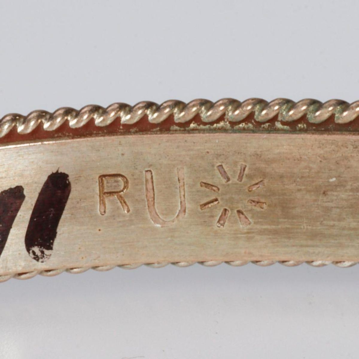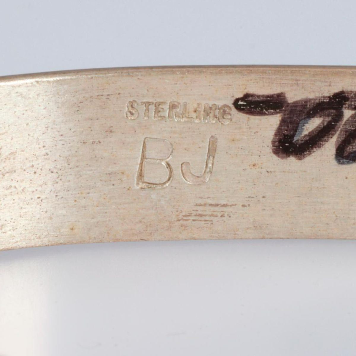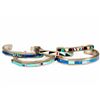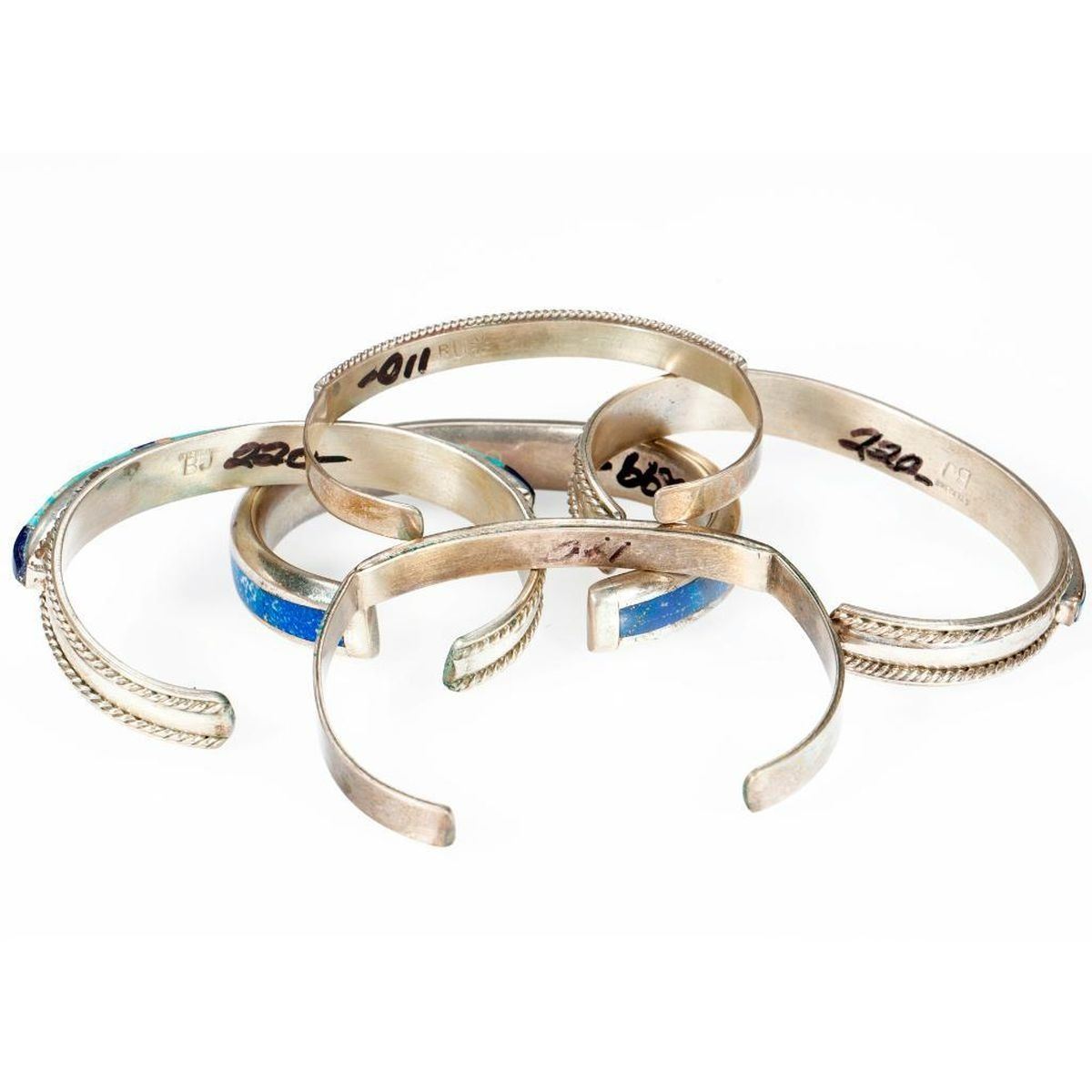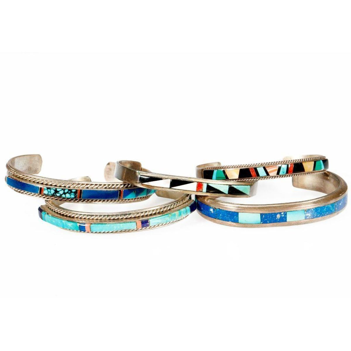 Five (5) old pawn turquoise, hard stone and silver cuff bracelets. Largest example is approximately: 1/4 inches wide. Approximate size: 7 and 6 3/4 inches, which includes the additional wrist gap. Approximate total weight: 101 g.