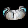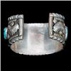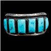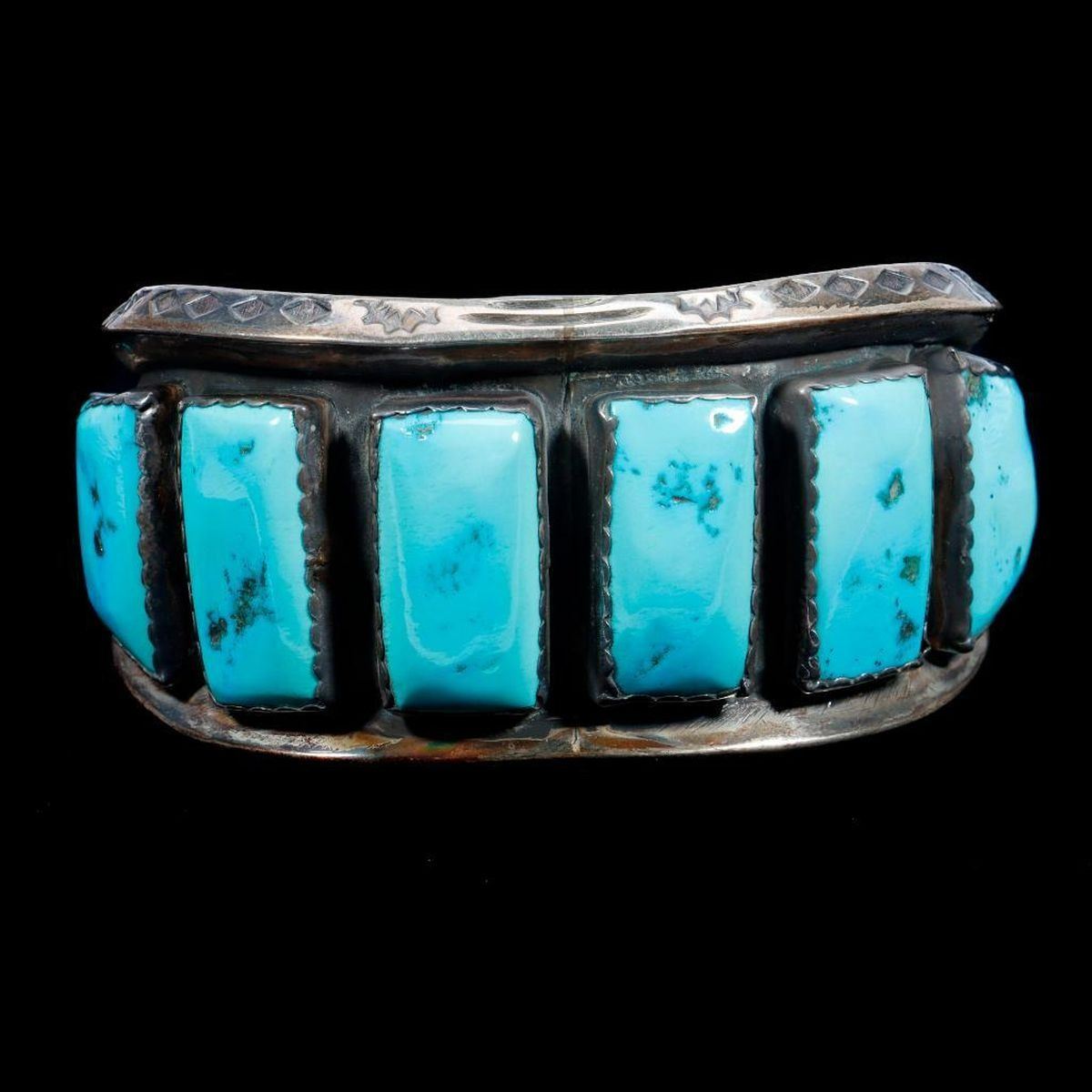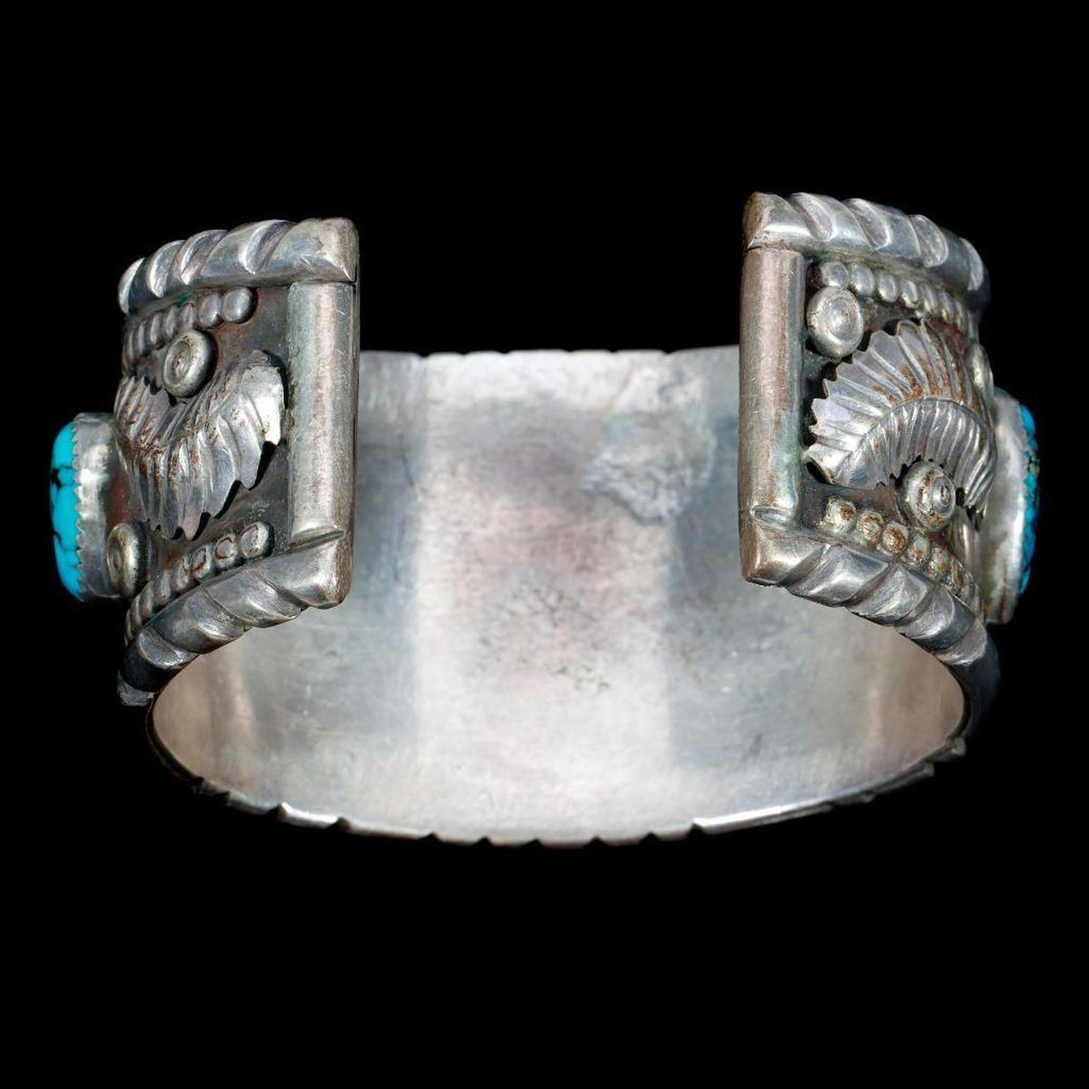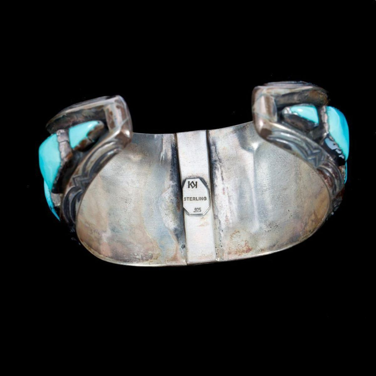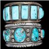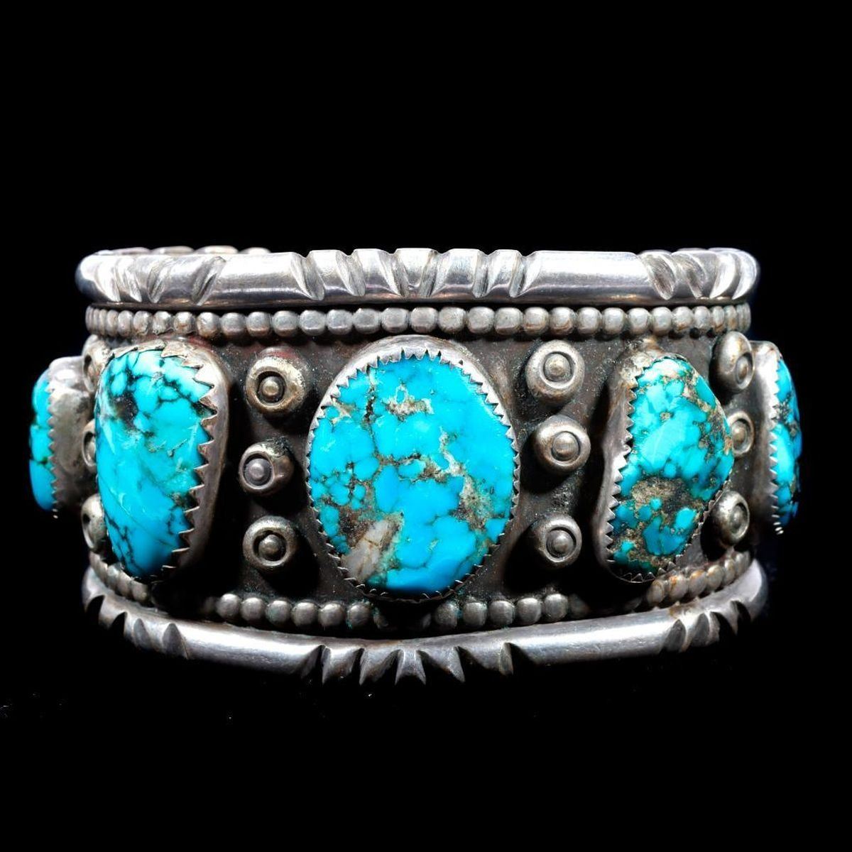 Two old pawn turquoise and silver cuff bracelets. Largest example is approximately: 1 1/2 inches wide. Approximate size: 6 3/4 inches, which includes the additional wrist gap. Approximate total weight: 154 g. One with sterling mark, one with maker's mark.
