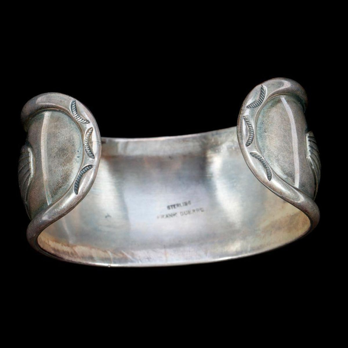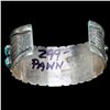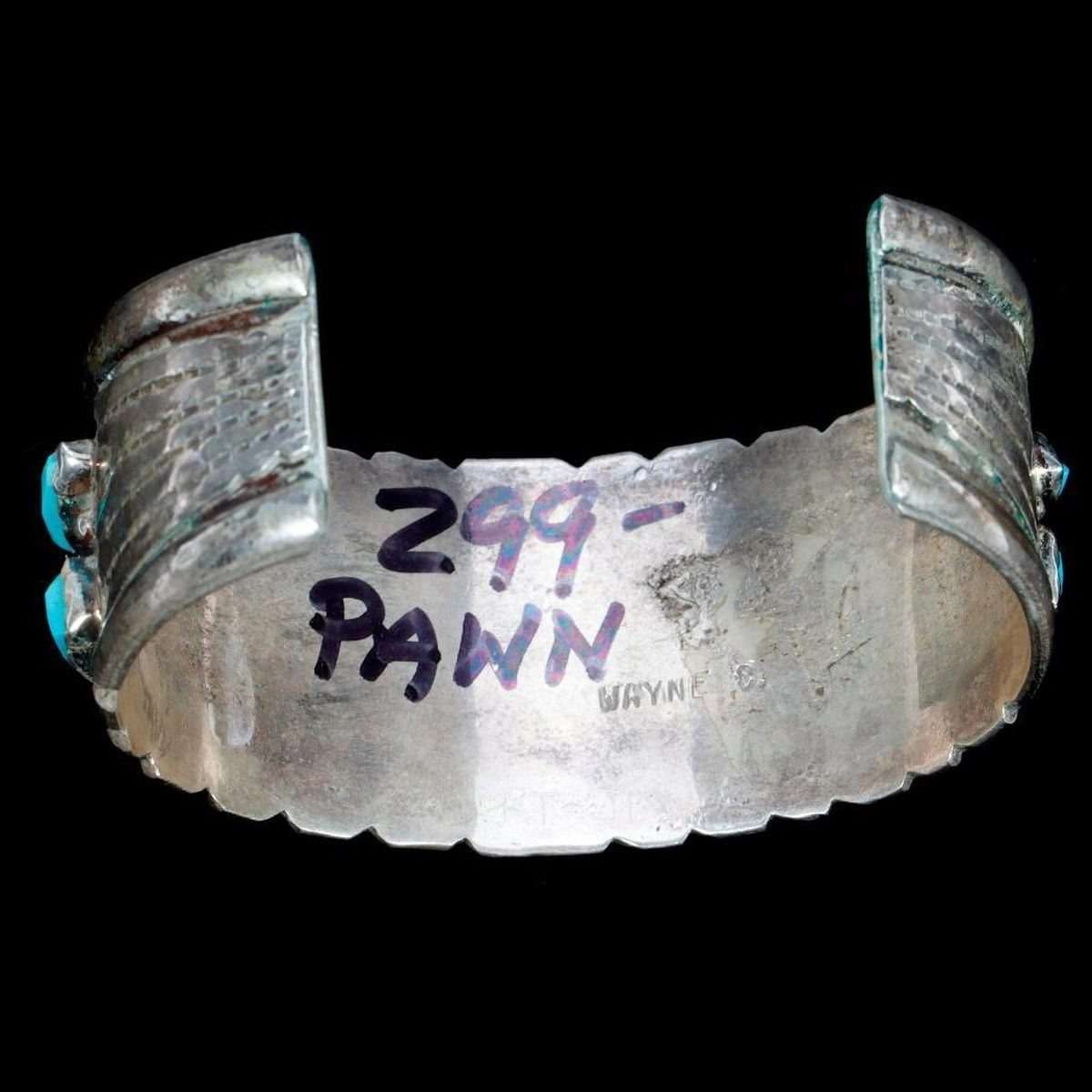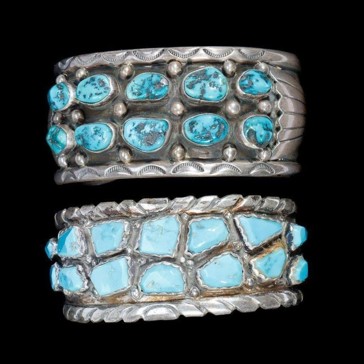 Two old pawn turquoise and silver cuff bracelets. Largest example is approximately: 1 1/4 inches wide. Approximate size: 6 1/2 inches, which includes the additional wrist gap. Approximate total weight: 109 g. One with sterling mark, both with maker's mark.