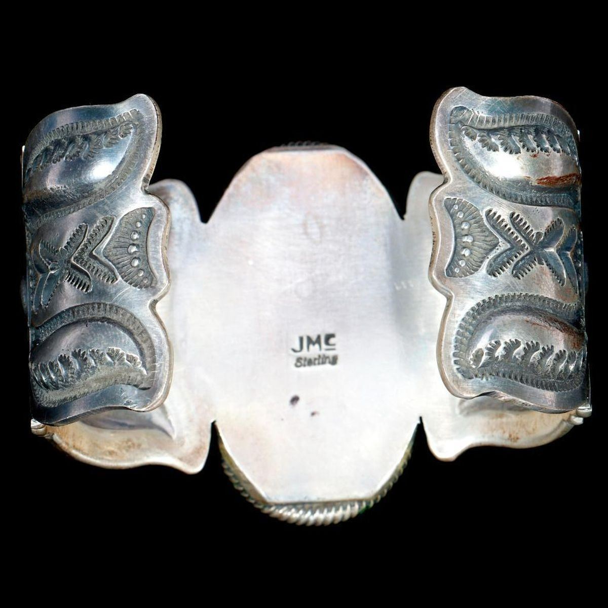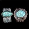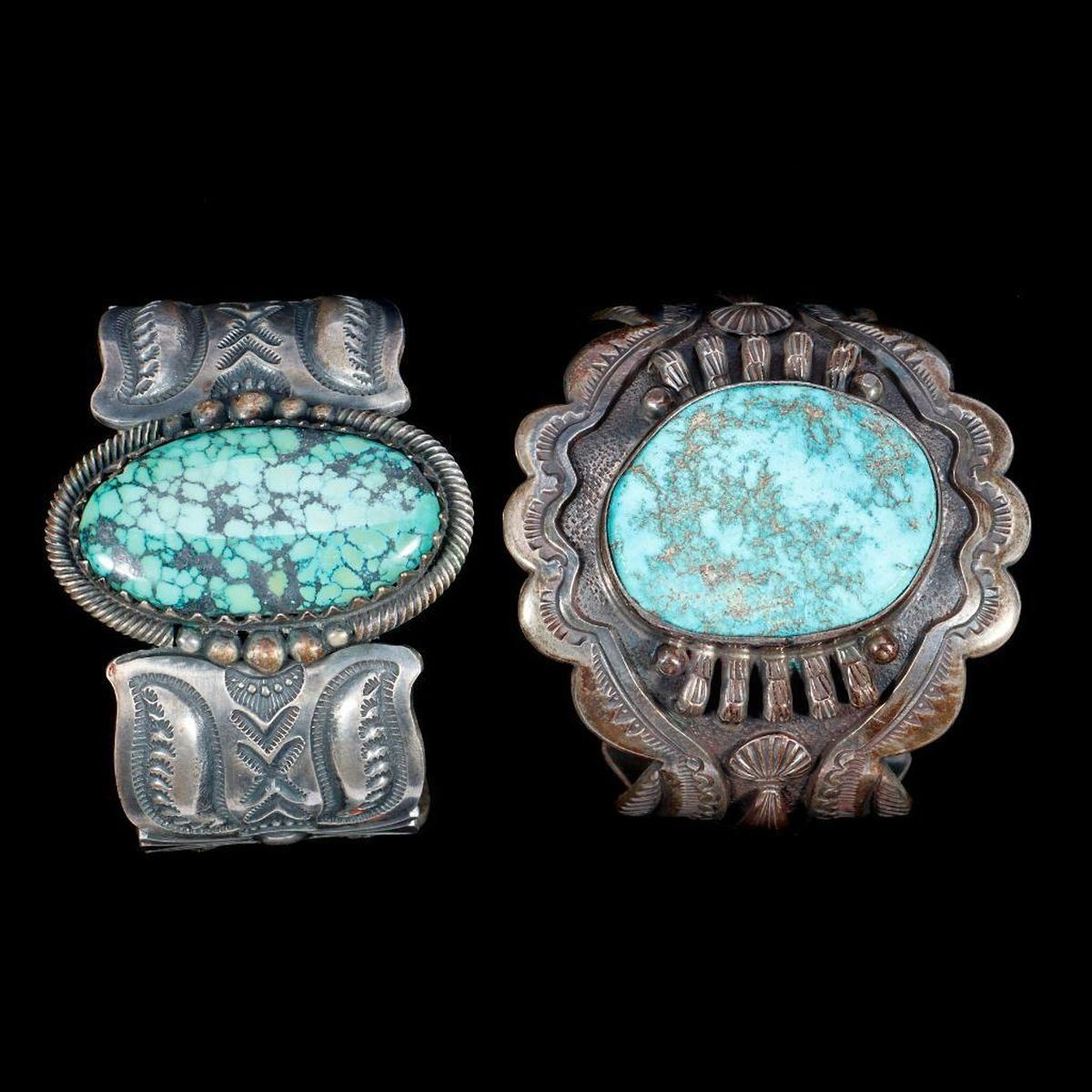Two old pawn turquoise and silver cuff bracelets. Largest example is approximate: 2 1/2 inches wide. Approximate size: 6 1/2 and 6 3/4 inches, which includes the additional wrist gap. Approximate total weight: 220 g. One with sterling mark, both with maker's mark.