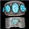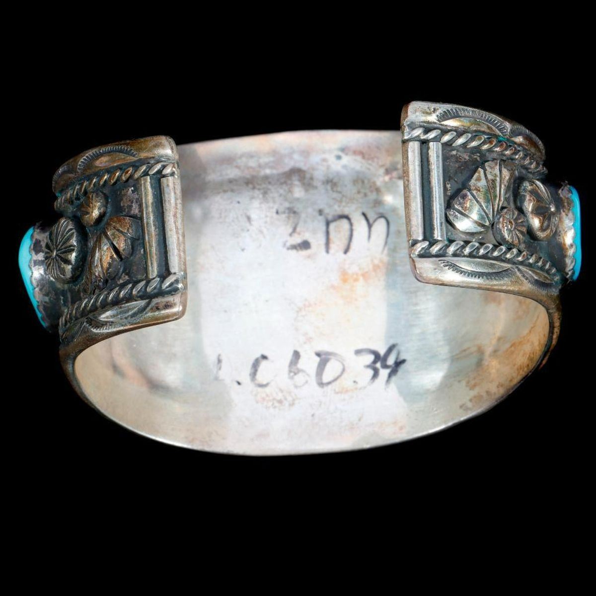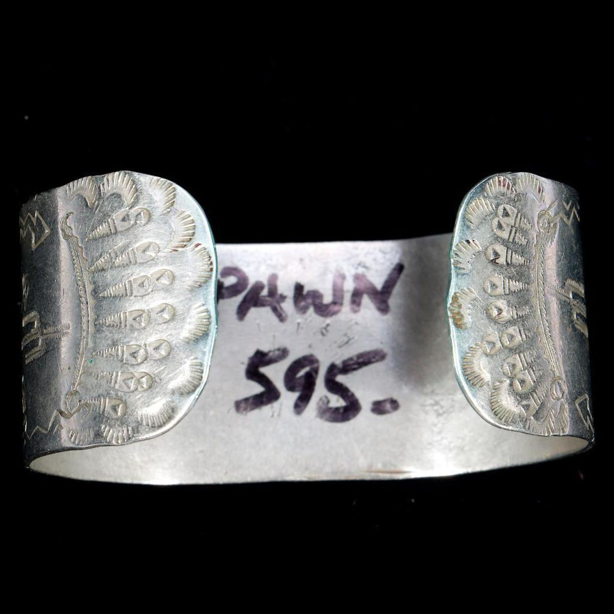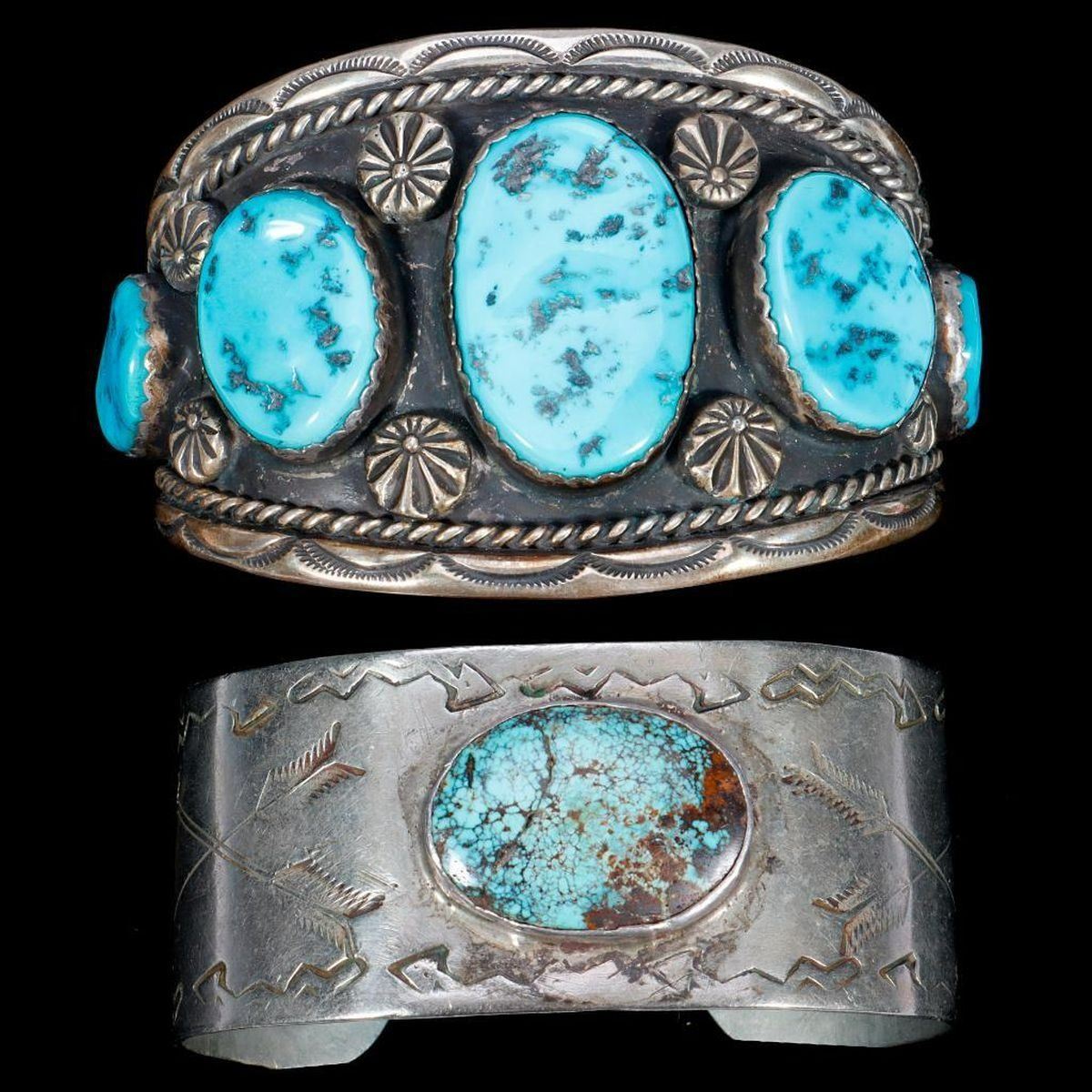 Two old pawn turquoise and silver cuff bracelets. Largest example is approximately: 2 inches wide. Approximate size: 7 and 6 3/4 inches, which includes the additional wrist gap. Approximate total weight: 129 g.