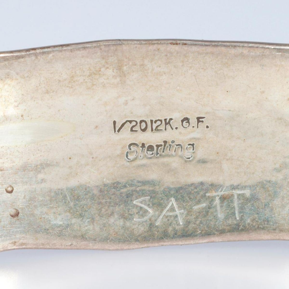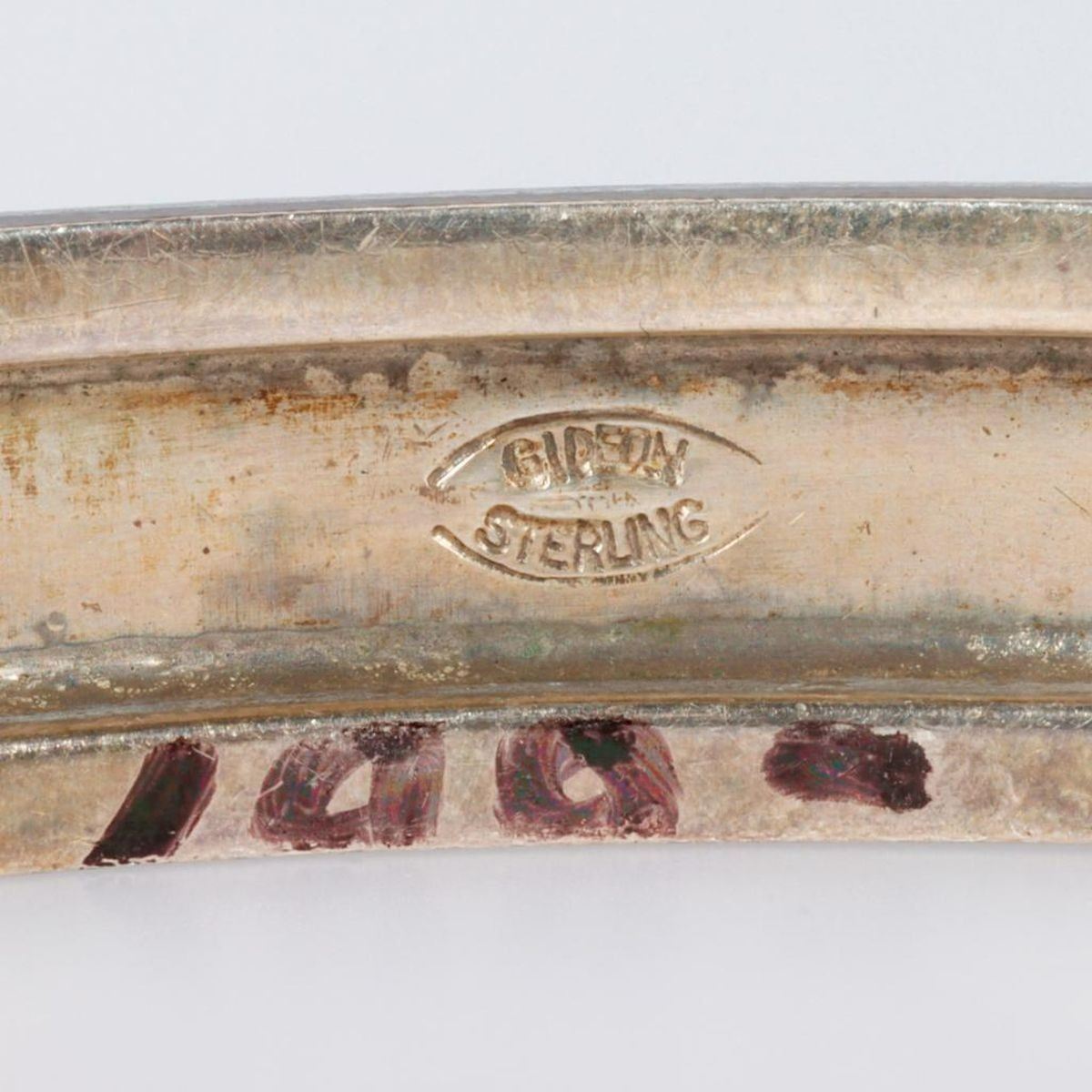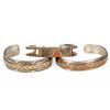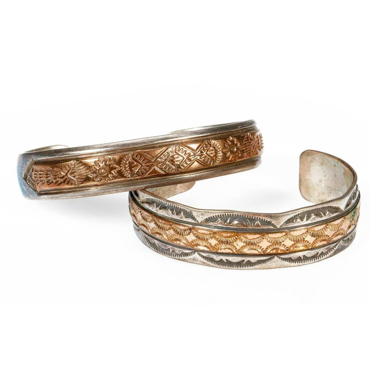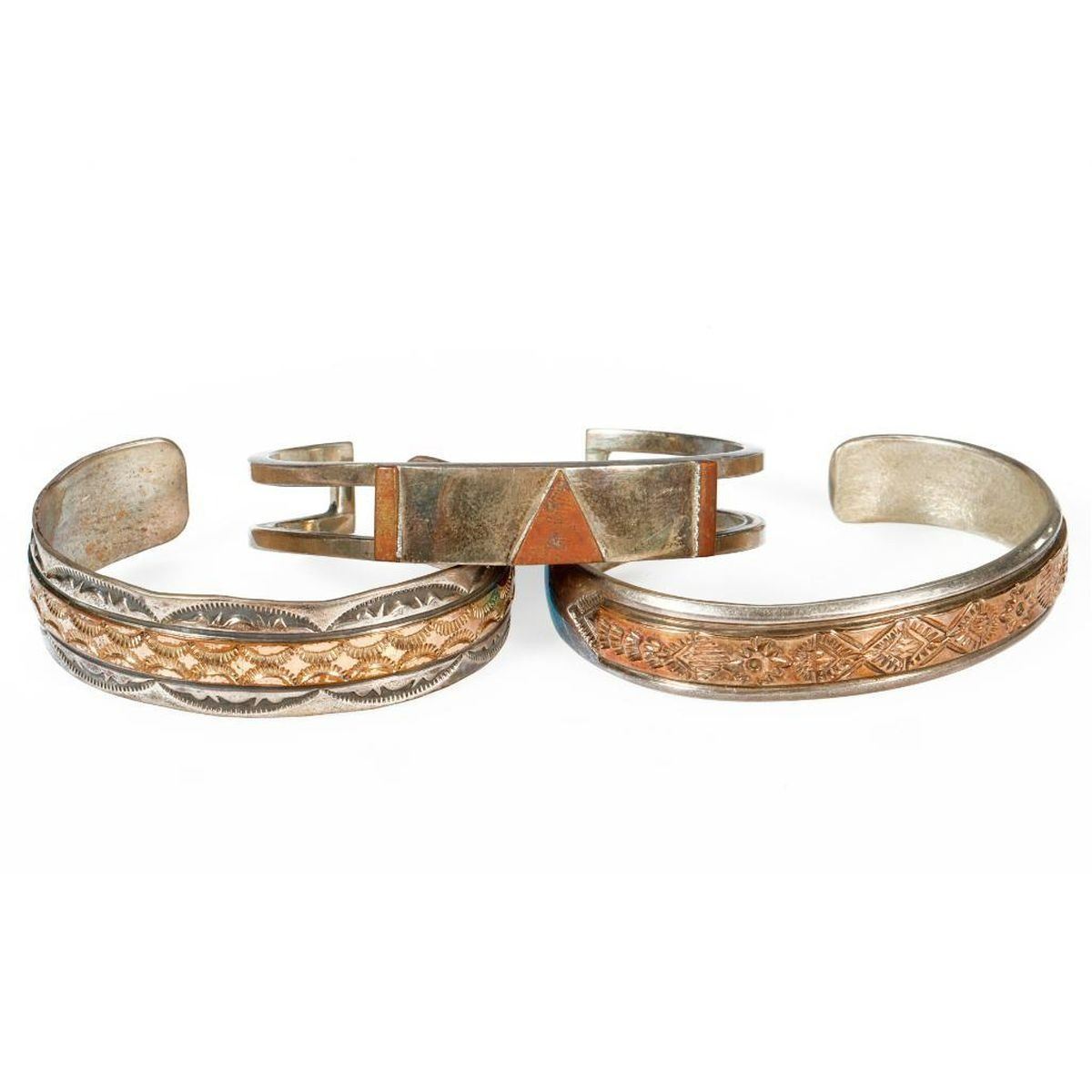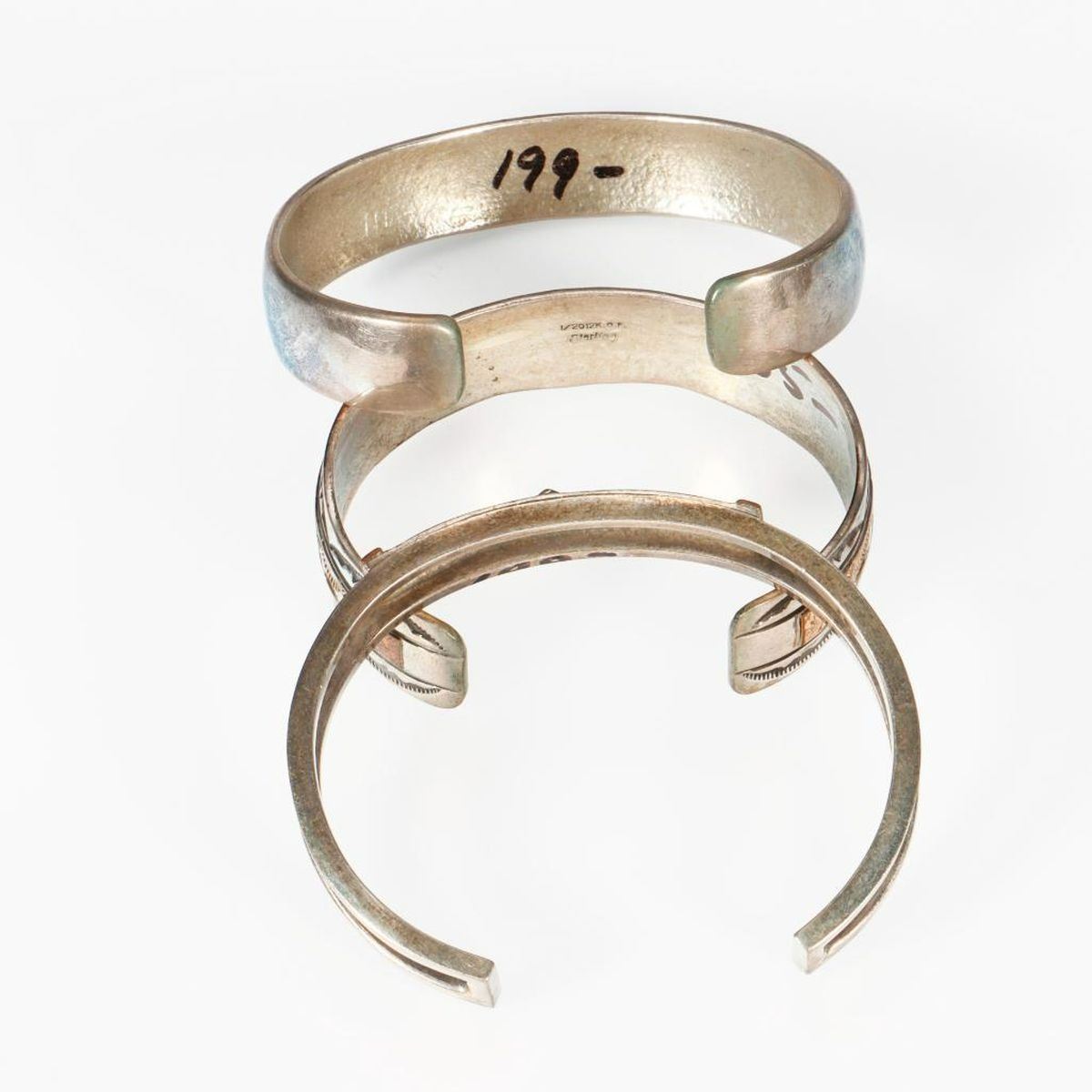 Three old pawn silver cuff bracelets. Largest example is approximately: 1/2 inches wide. Approximate size: 7 and 6 3/4 inches, which includes the additional wrist gap. Approximate total weight: 104 g. All with sterling mark and maker's mark.