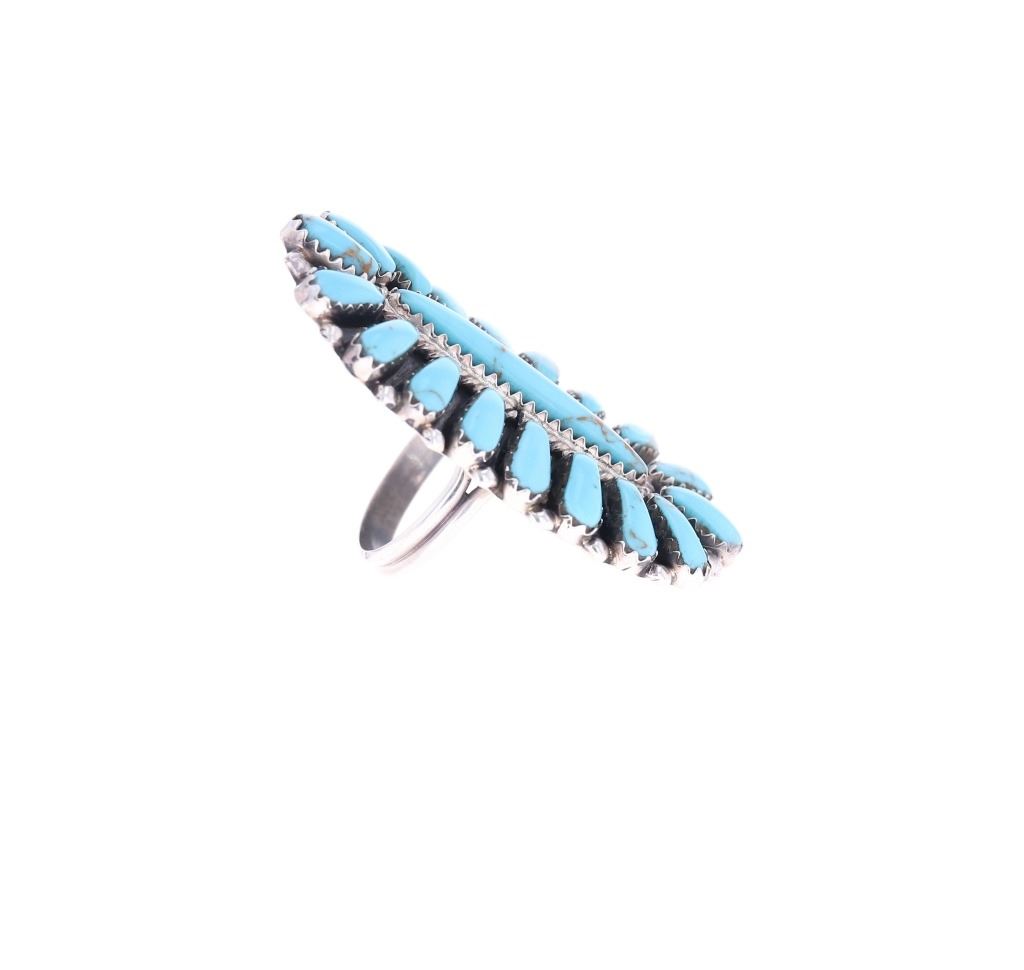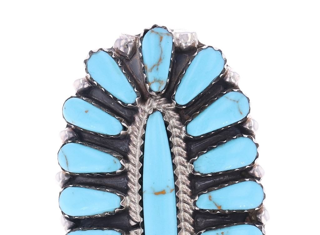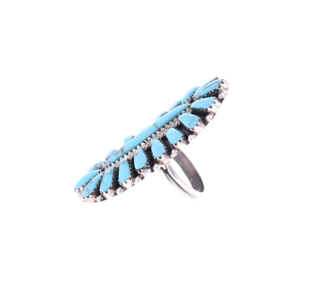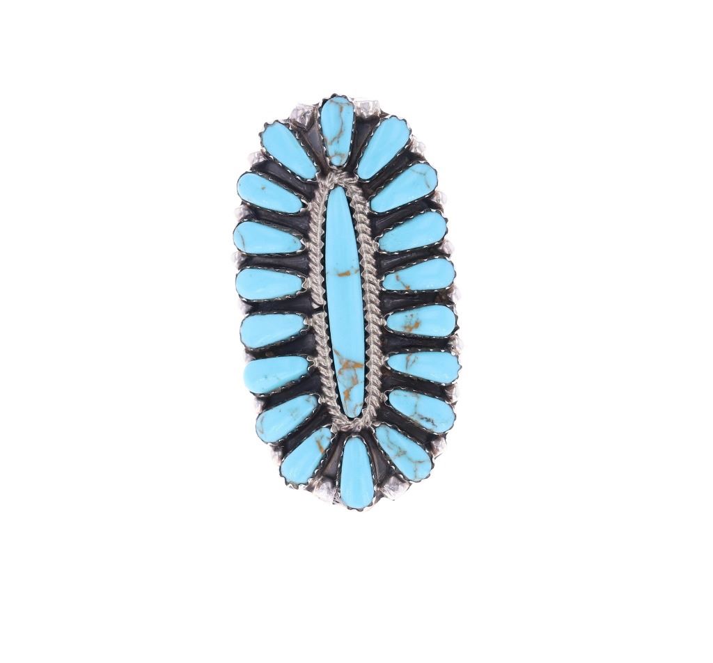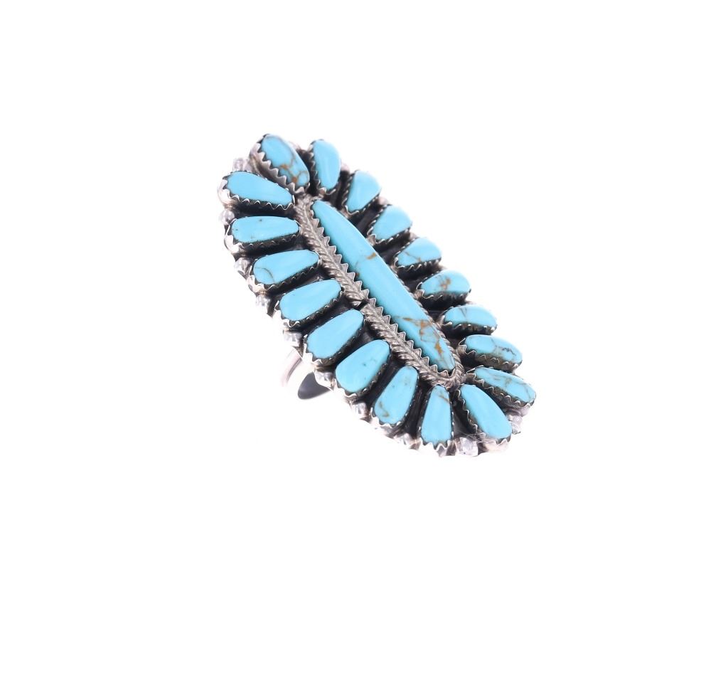Featured in this lot is this sterling silver and Cripple Creek Turquoise ring from Navajo artist Dean Brown. The ring features a wonderfully and professionally crafted sterling silver construction. The ring features a inlaid example of pear and oval cut Cripple Creek Turquoise cabochon set into the face of the ring. The ring is marked as follows: DB - Sterling. The condition of this Navajo ring is good with no obvious signs of damage and shows good overall condition. The measurements of this ring is 1 3/4" x 1" x 7/8" and the ring size is US 6. The collective weight of this ring is 9.2g.