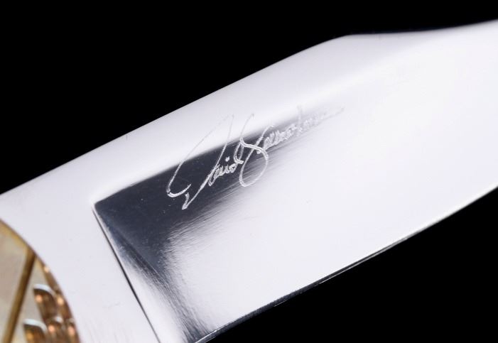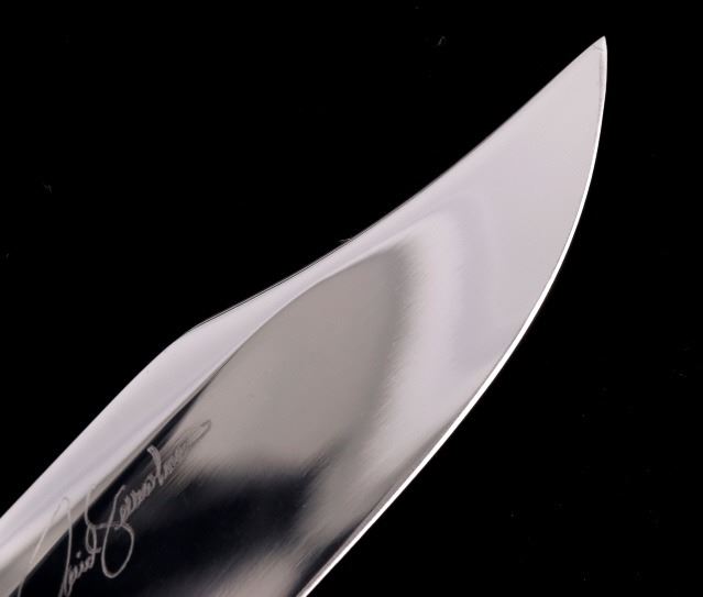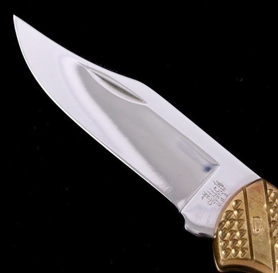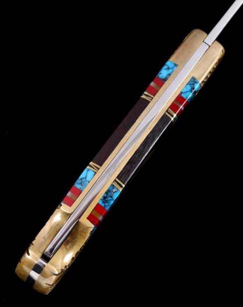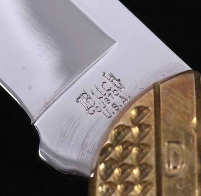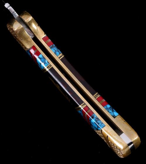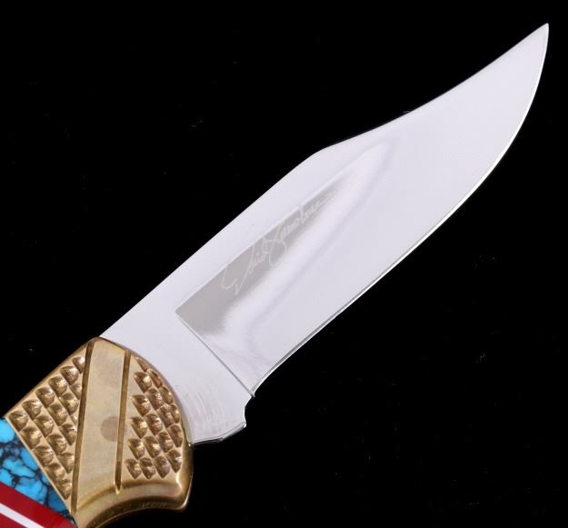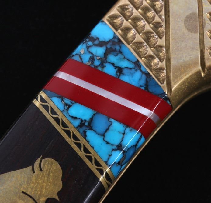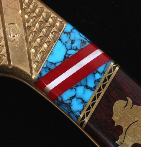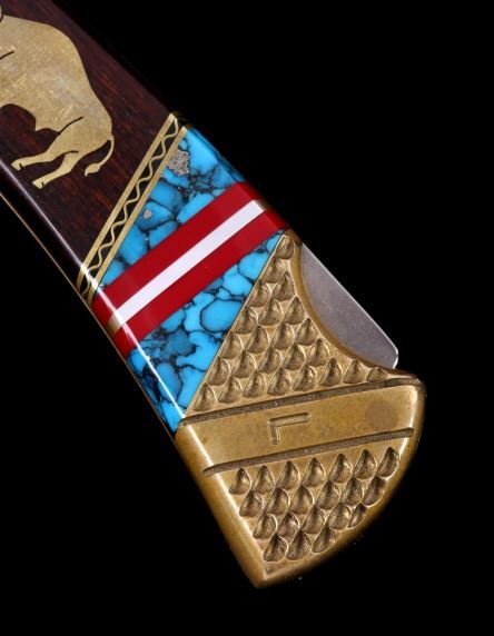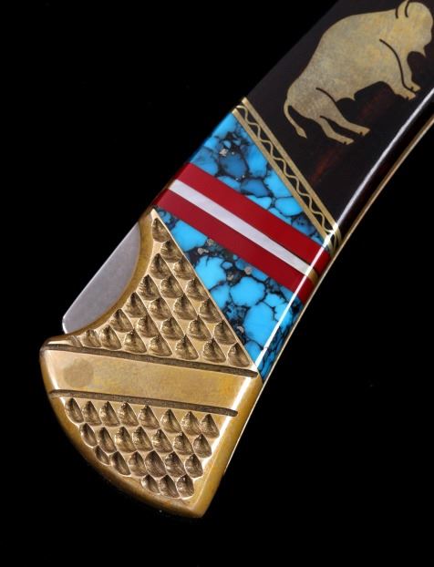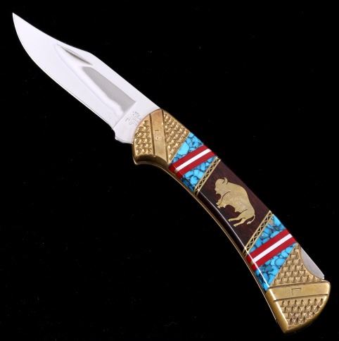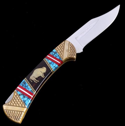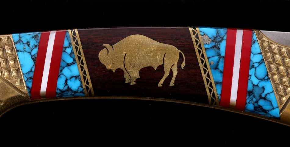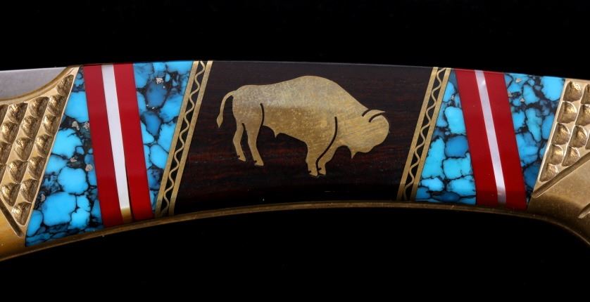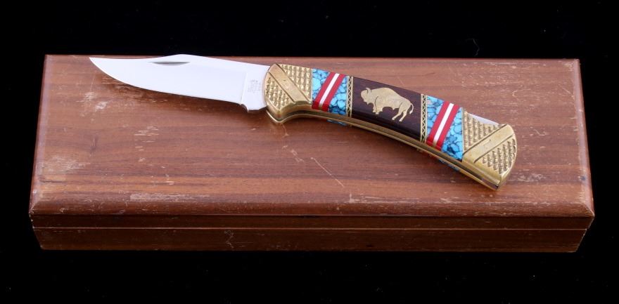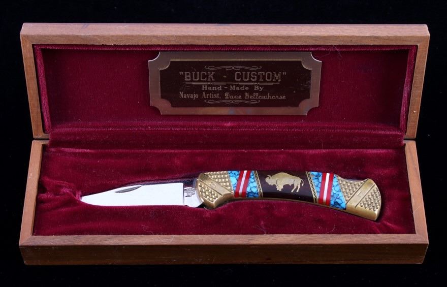 This is an original rare hand crafted Buck Custom knife from Navajo Native American Indian artist, Dave Yellowhorse. The knife utilizes an inlaid mosaic handle, boasting gem quality Kingman Spiderweb turquoise, oxblood coral, mother of pearl, and rosewood. Additionally, the knife is decorated with an inlaid brass Great American Buffalo, and finely etched brass accents. The drop-point, folding blade is hand etched with Dave Yellowhorses signature, and is also labeled "BUCK CUSTOM - U.S.A.". The fine knife is housed in a custom wooden box, lined with red velvet, and showing a presentation plaque, reading "BUCK - CUSTOM - Hand Made By - Navajo Artist, Dave Yellowhorse". Overall, the knife is in like-new condition, though the box shows some slight wear. The knife itself measures 7 1/8" long, with a 3" blade. The box measures 9 1/8" wide, 3" deep, and 1 5/8" thick.