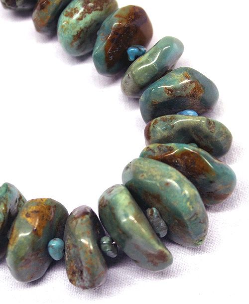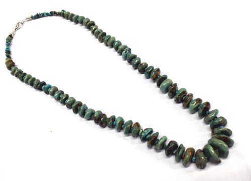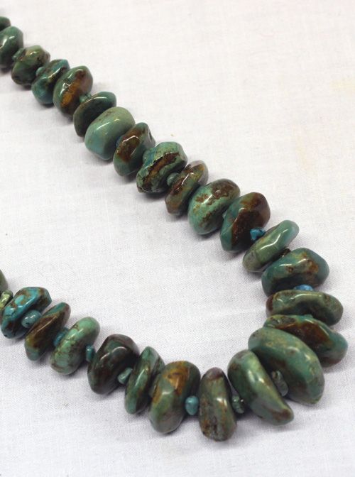 Navajo Dead Pawn Green Turquoise Nugget Necklace. Beautiful green blue turquoise with brown matrix, graduated nuggets. Necklace measures 26 1/2'' with the largest nugget measuring 1''. Nicely crafted with small chip nuggets between each stone.