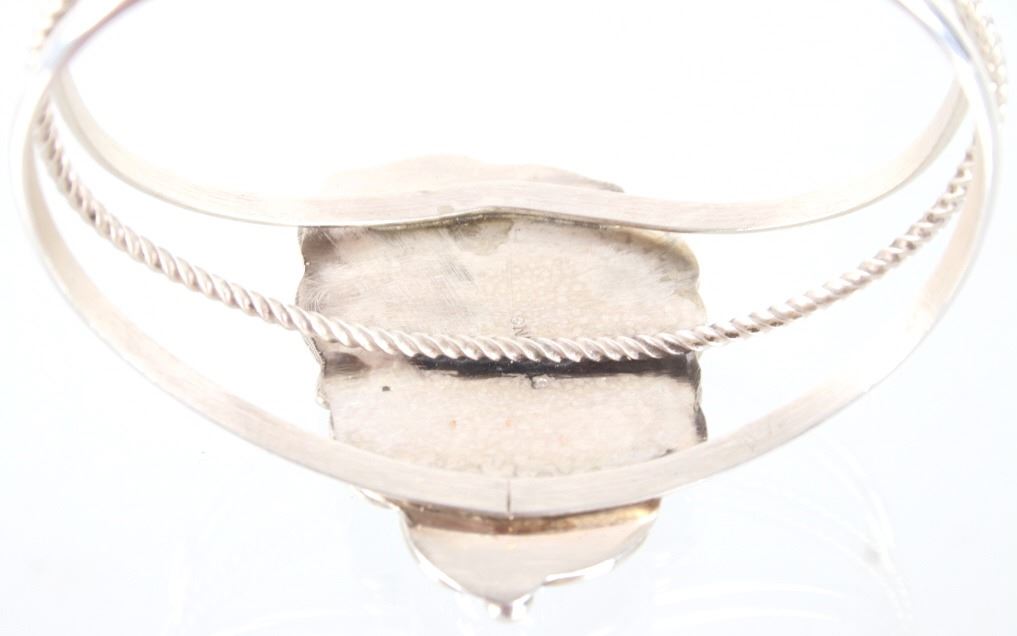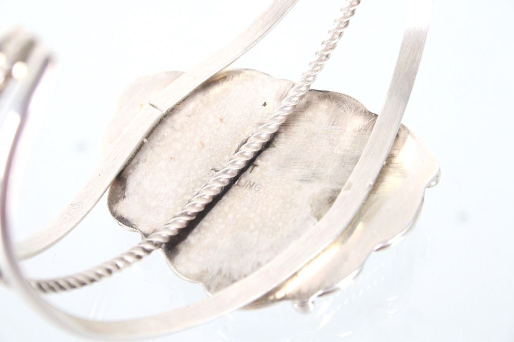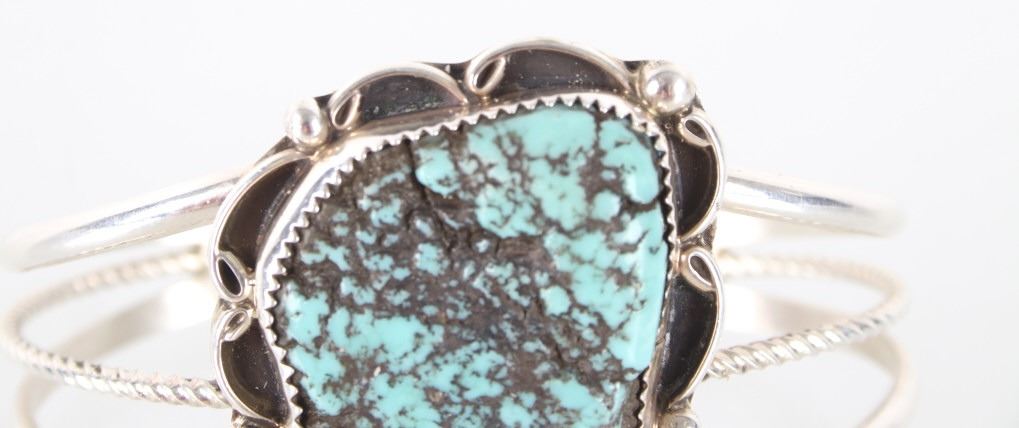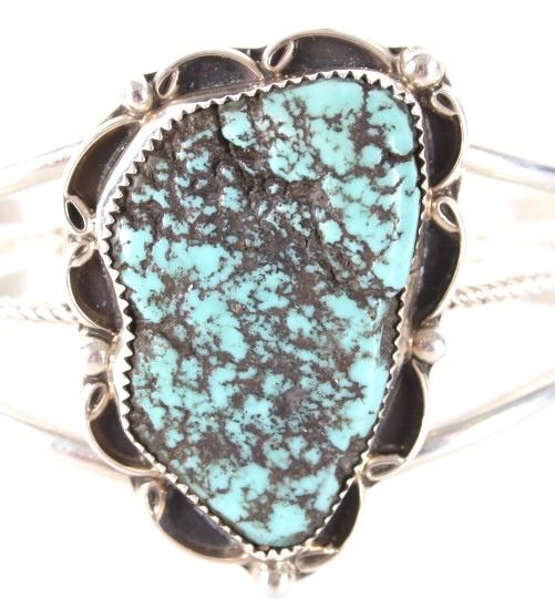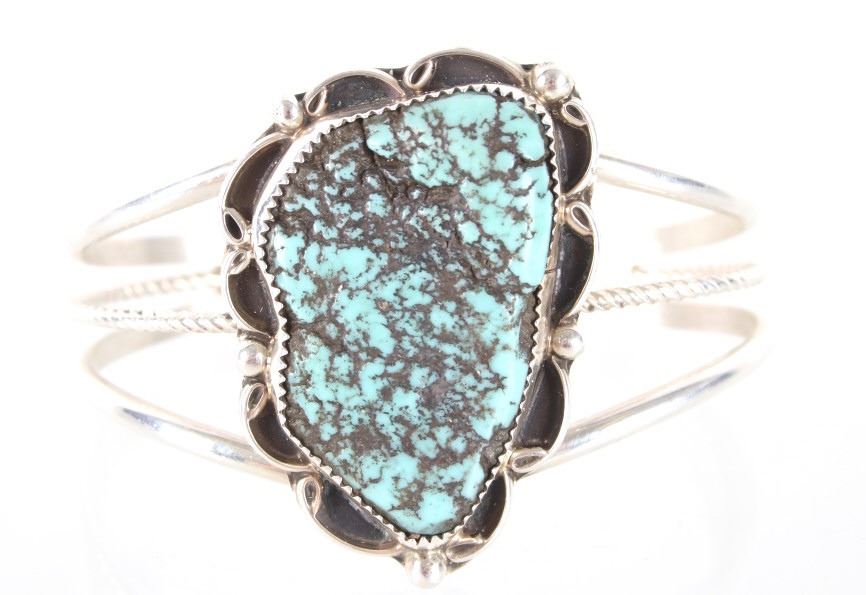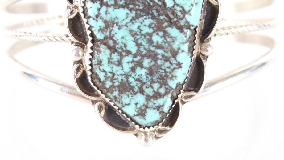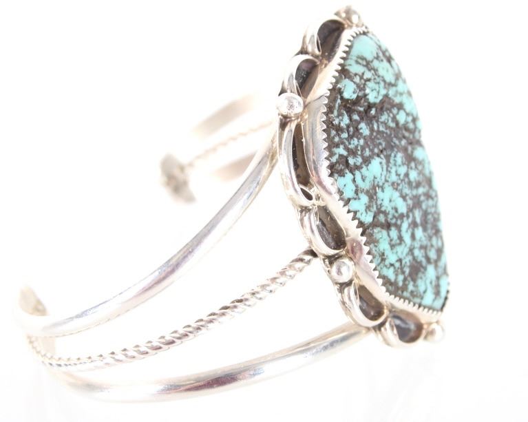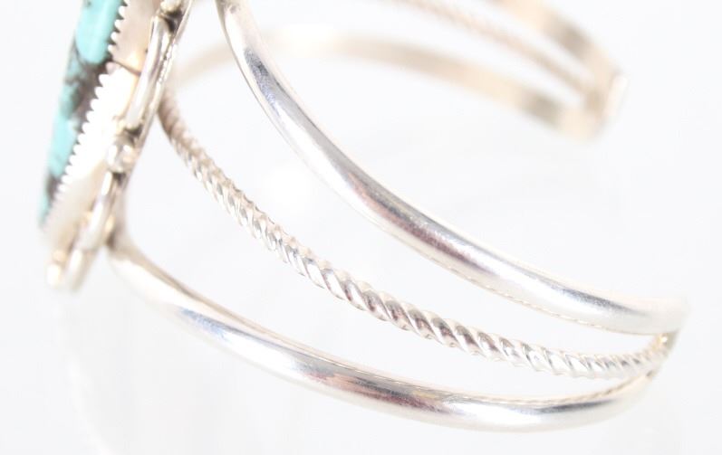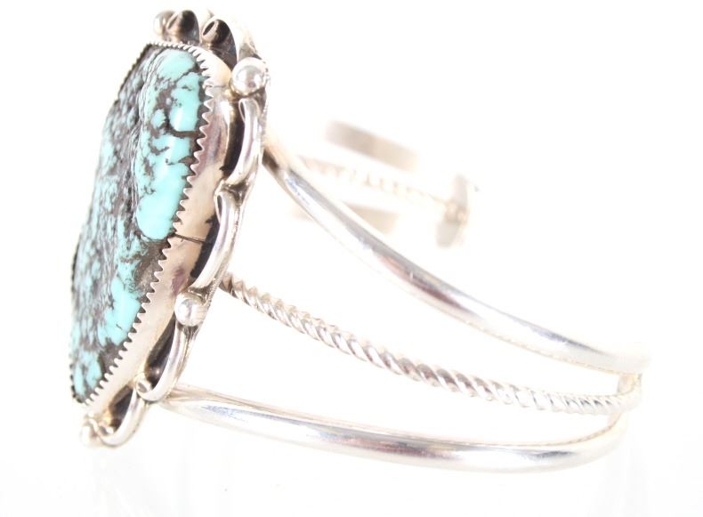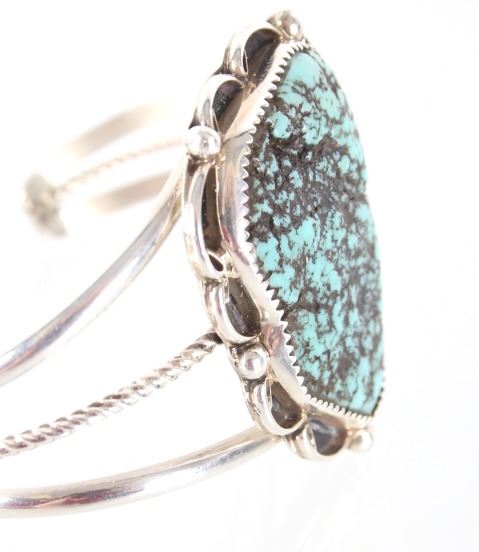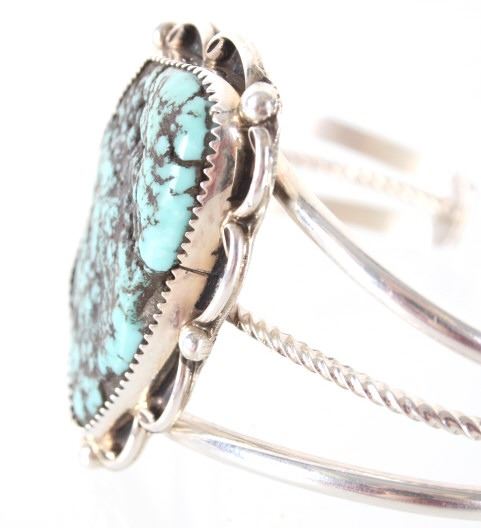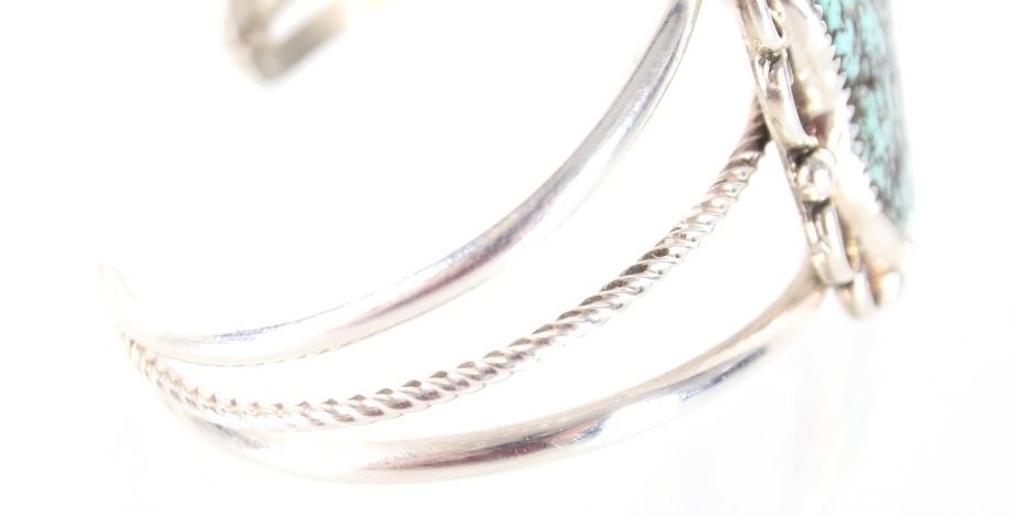 The lot features a beautiful sterling silver bracelet from Navajo Dinè Native American silversmith, Thomas Tso set with Kingman Turquoise with a spiderweb matrix. The piece is signed / stamped "TT / STERLING" and shows a polished nugget cabochon of turquoise from the Kingman Turquoise mine with a fantastic spider web matrix. The piece is in good condition. Measures 7"L inside circumference wrist size which includes the 1.5"W opening. Total weight of 36.5 grams.