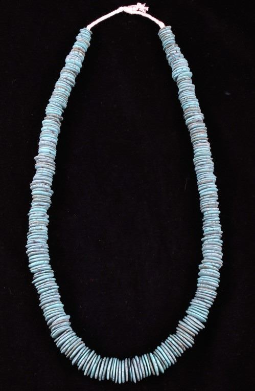 For your consideration is this Navajo Native American, discoidal, Royston turquoise necklace. This is a beautiful necklace, showing a large collection of discoidal Royston turquoise gemstones with a nylon core holding it together. The necklace shows a slight graduation from the woven and tied end to the center most strung gemstones. This large necklace measures 32" in circumference, with stones ranging from 1/2" in diameter to 1" in diameter.