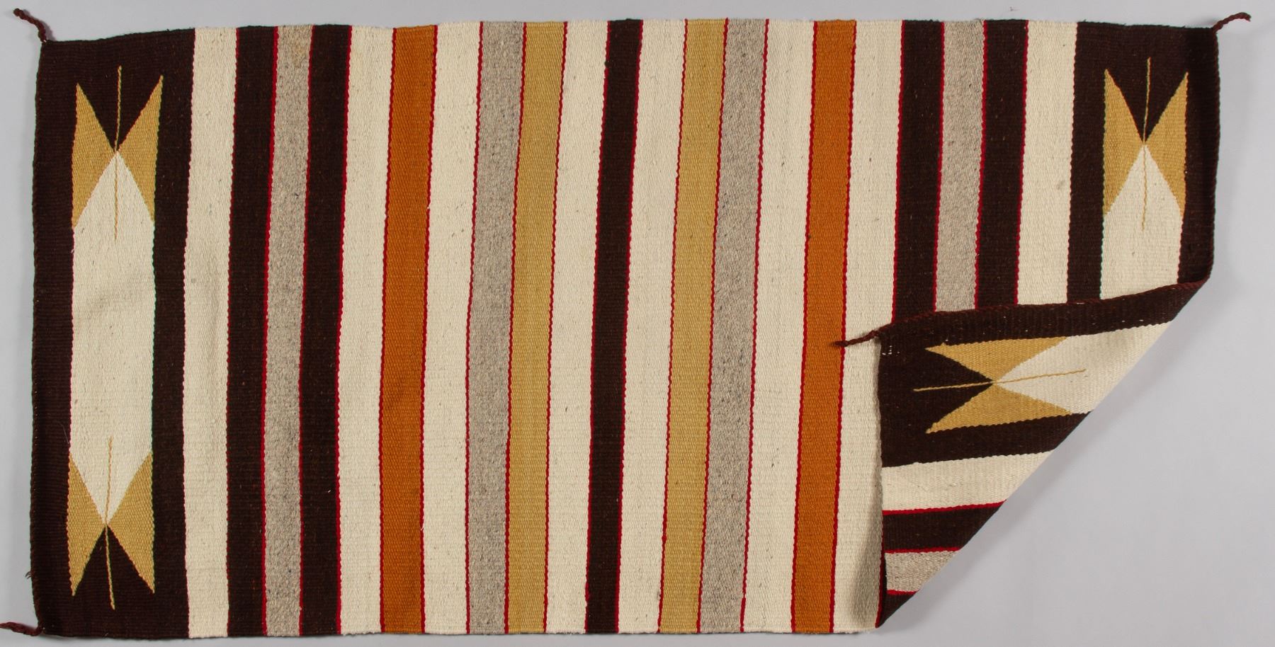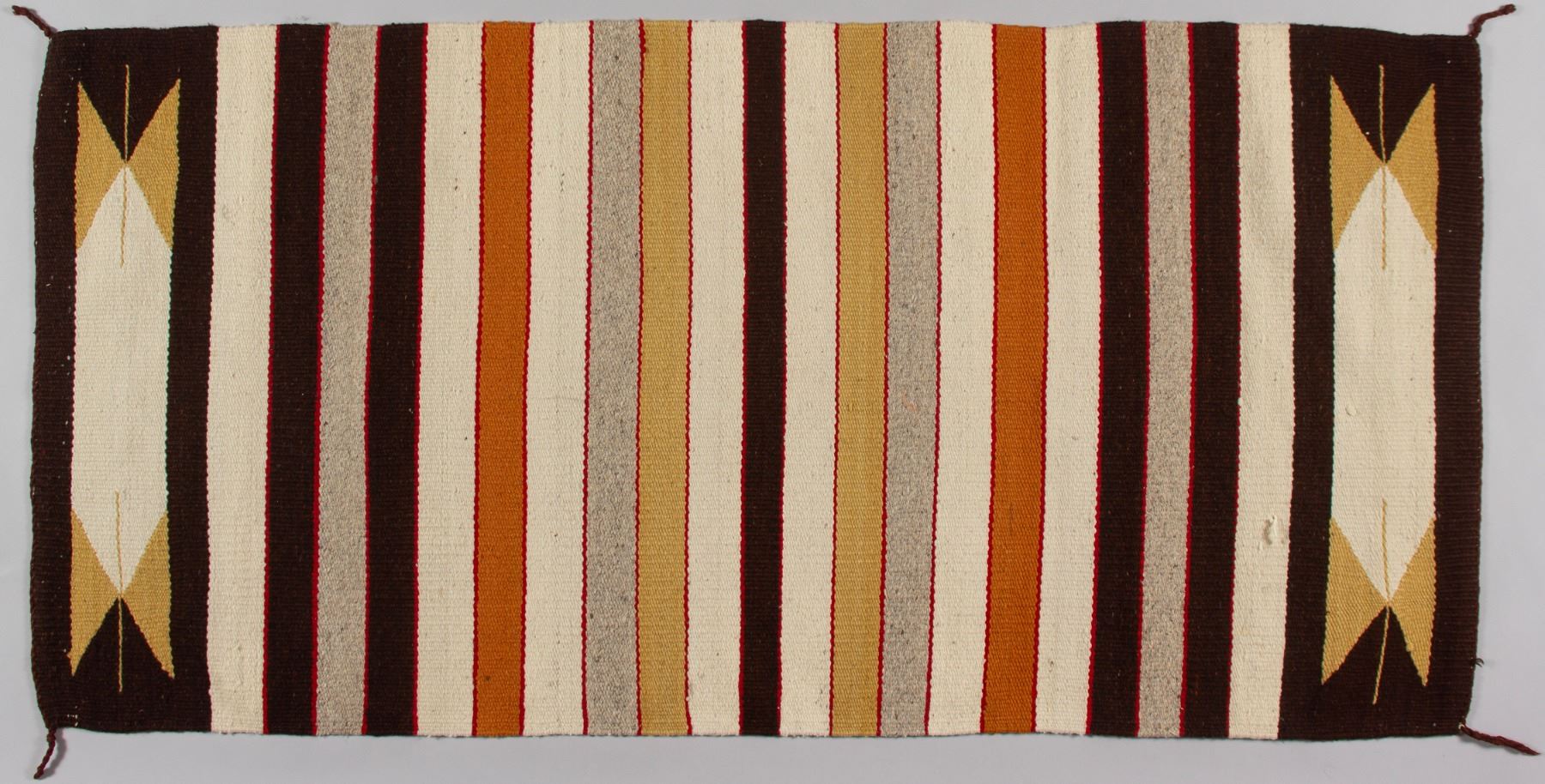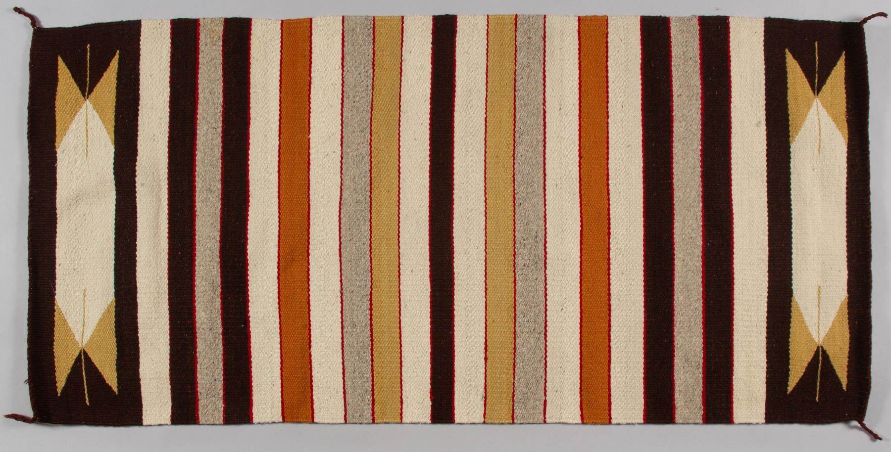 An authentic, finely woven Native American textile, identified as a Navajo (Diné) double saddle blanket, crafted from hand-spun wool and featuring a traditional striped design. This piece exhibits classic utilitarian form and striking aesthetic appeal. The central field features strong vertical banding in naturalistic and muted aniline-dyed hues, including cream, dark brown, orange-brown, and warm gray/tan. The blanket is framed by deep brown end panels featuring complex, stylized diamond motifs that represent traditional symbolism.