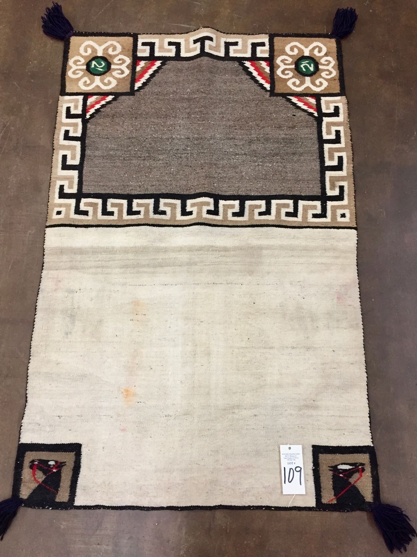 Description: For sale in this lot is a Navajo double saddle blanket with tassels. Features some unique designs and horses heads in the corners. Has browns, tans, whites, reds, and blacks woven in the designs. Maker: Unknown Navajo weaver. Approx. Age: Vintage. Size: 23-1/2”w x 54” long. Condition: Pretty good for its age, normal wear expected. Please look closely at the pictures - they are an important part of our description. Shipping: There will be a $5 handling / packaging fee for shipping this lot. The actual cost of postage will be added on top of that.