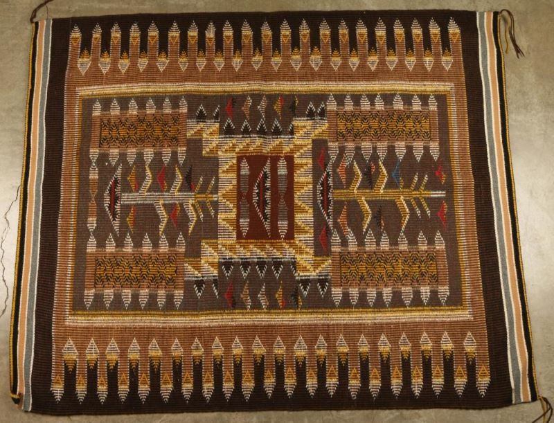 Brown, yellow, gray and black with touches of red in a geometric and corn design. Measures 57" x 46 1/2". Excellent condition.