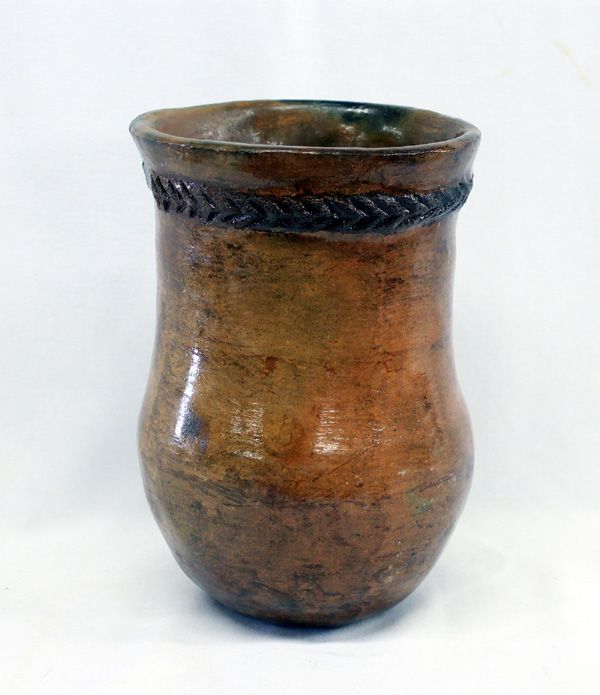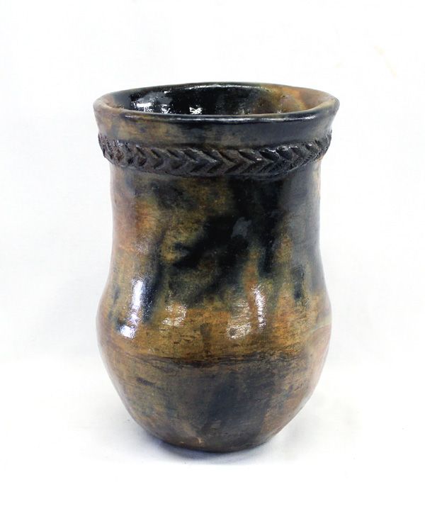 Native American Navajo Drum Pot. Deep reddish brown and black pottery drum pot. Braid design around rim. Measures 7''Hx4.5''W.