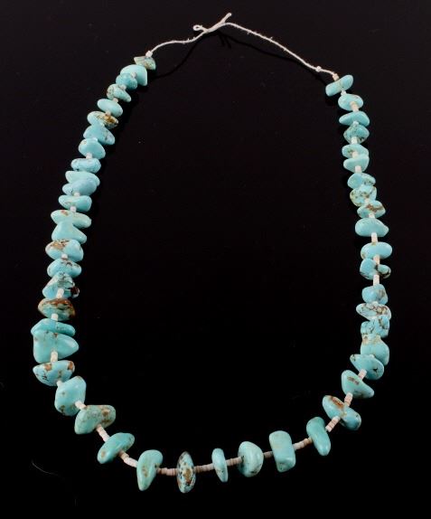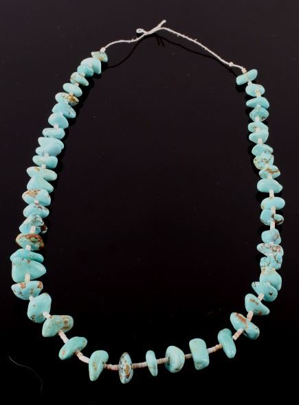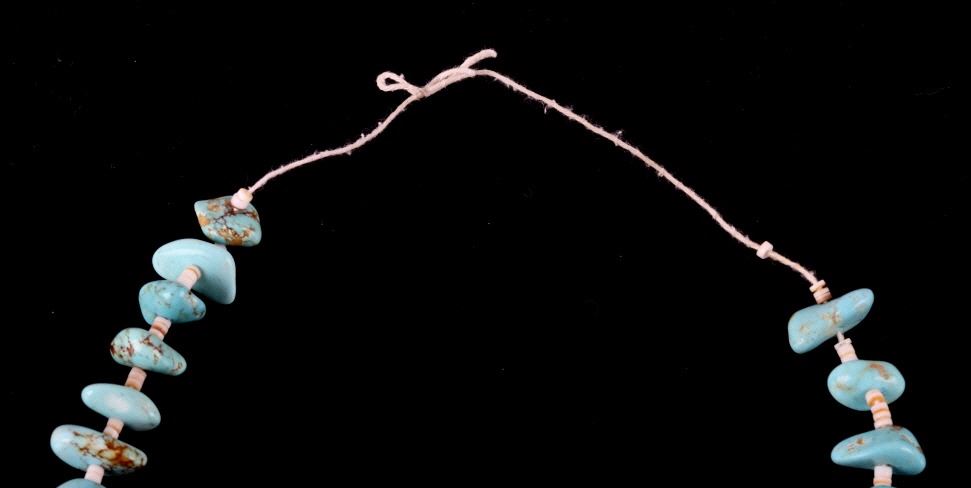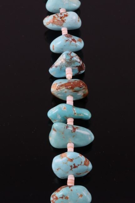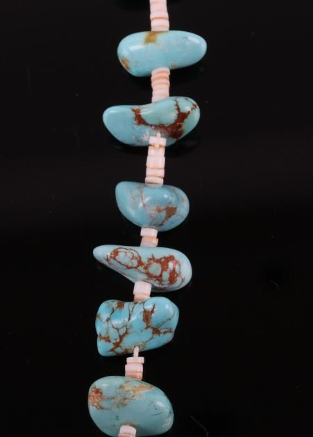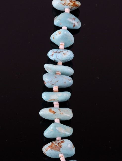 For your consideration, a Navajo Turquoise and heishe shell necklace circa 1900's. This 24" necklace has 49 gemstones of Dry Creek Turquoise, with heishe shell carved disks between the stones. Dry Creek turquoise is found in the same area as the Godber-Burnham turquoise. With it's very distinct color this turquoise is a light blue color with beautiful spider webbing. Dry Creek Turquoise comes from a small turquoise mine outside of Austin, Nevada in Lander County. Dry Creek Turquoise has gained much popularity over the years with its creamy pale blue coloring and golden to cocoa brown matrix. The color is a pastel blue much like the color of Larimar, only high grade Dry Creek Turquoise has beautiful light brown, golden yellow or orange webbed matrix. After the owner's passing several years ago, material from the Dry Creek turquoise mine became scarce due to family disputes. This braided necklace measures 24" tied.