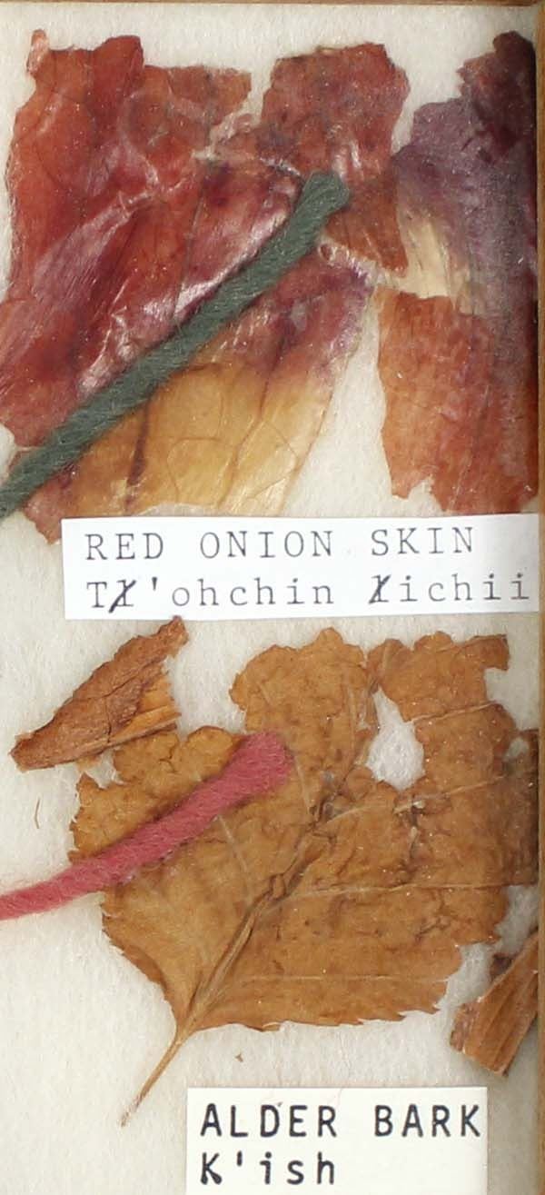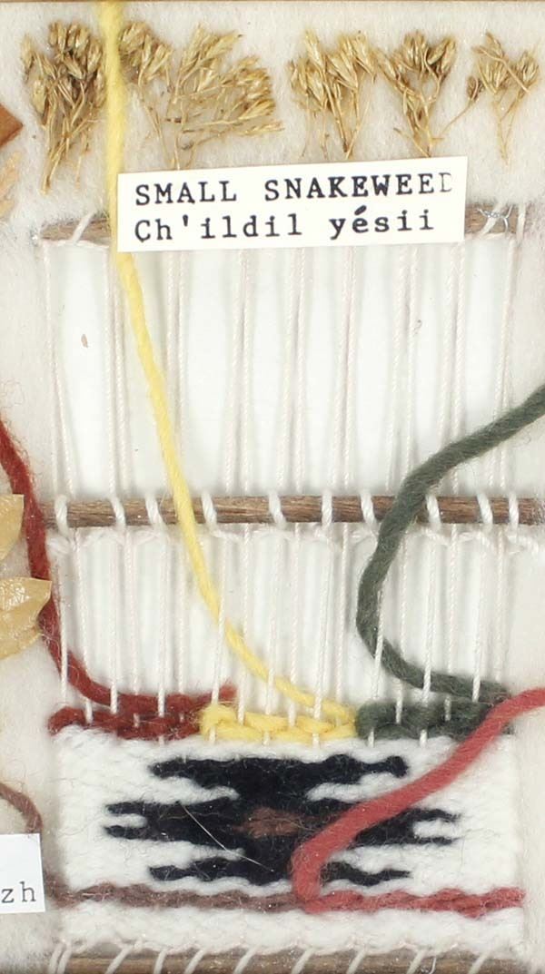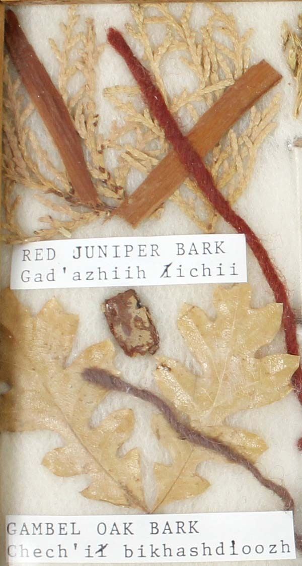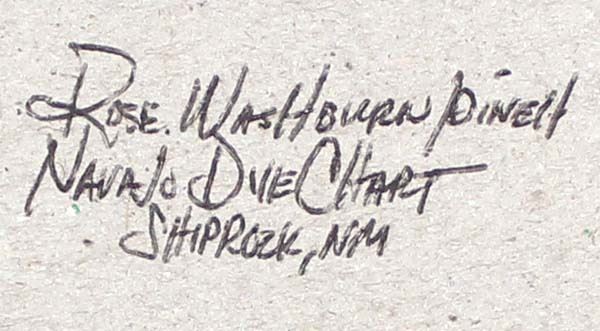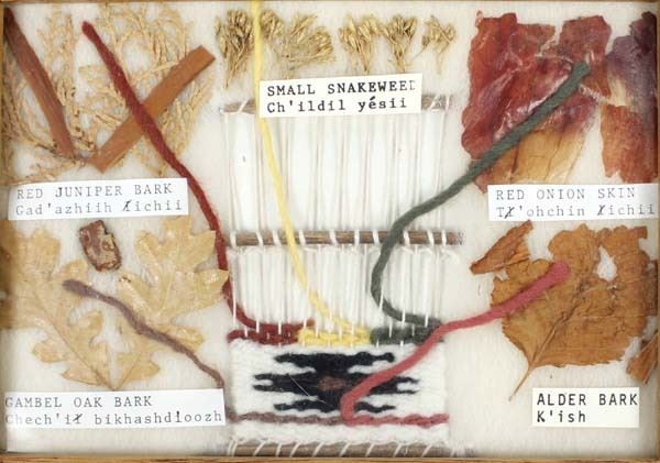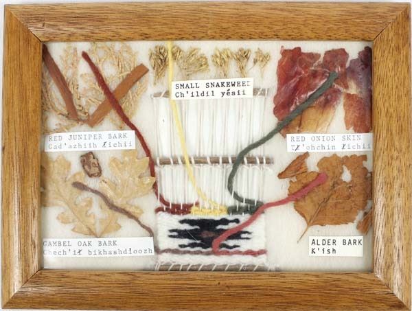 Native American Navajo Dye Chart by Rose Washburn of Shiprock NM, framed and under glass, total framed measurement of 6'' x 8'', signed on the back, features a partial sampler wool textile