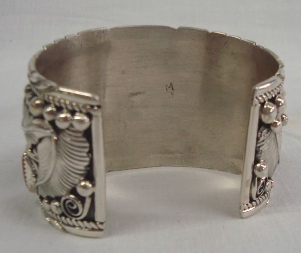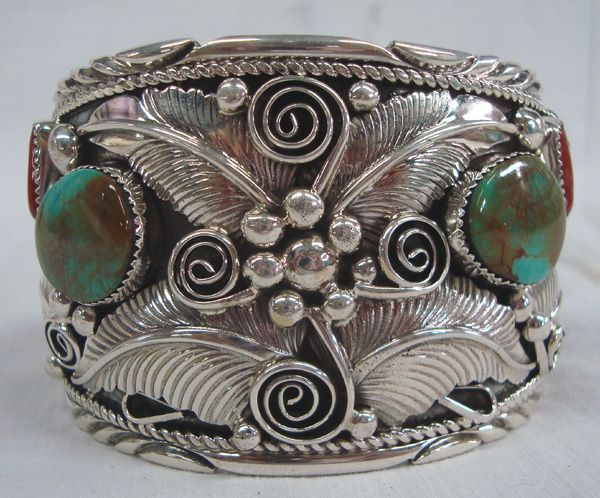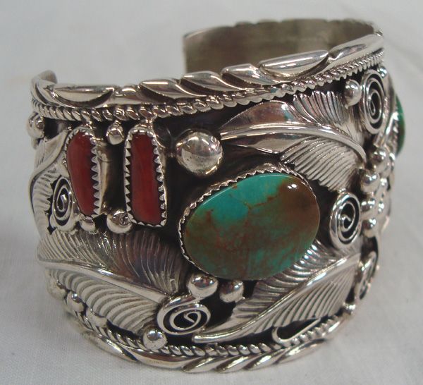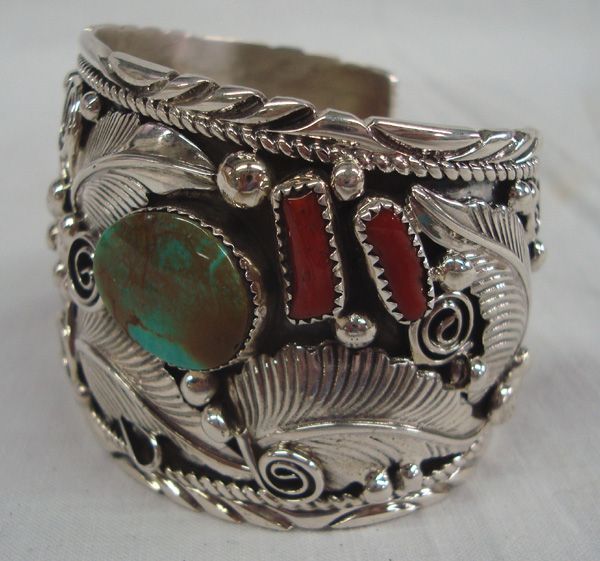Navajo Sterling Turquoise & Coral Bracelet, Signed. Exquisite overlaid silver work on this large cuff bracelet. Large leaves with curlicues of silver wire and beads. Two horizontally placed polished turquoise cabochons; a nice green color with heavy brown matrix. On each side of the turquoise cabs are 2 dark red branch coral pieces. It measures 7 1/4'', including the opening and is a generous 2'' wide! Stamped ''Sterling'' and ''M'' for the silversmith, ''M. Arviso''. This is a show-stopper!!
