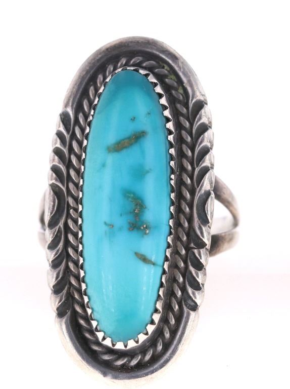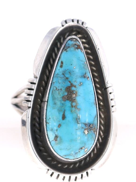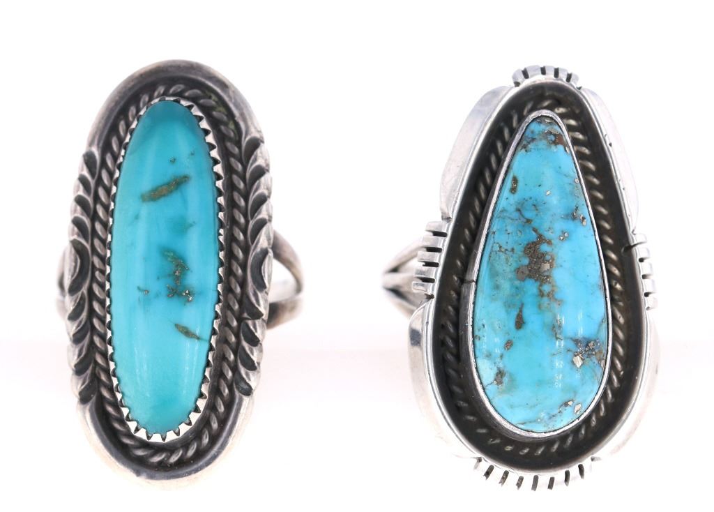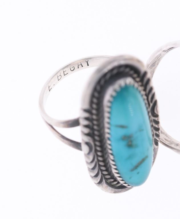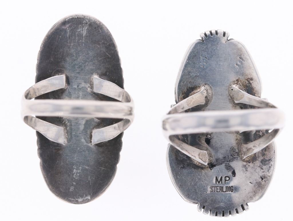 Featured in this lot is this pair of Navajo sterling silver and turquoise rings signed MP Sterling and E. Begay. There are two rings in this collection. The first is a wonderfully and professionally crafted sterling silver construction with a pear cut Kingman turquoise cabochon set into the center of the ring face with tooled and stamped decoration tot he face of the ring; The artist hallmark can be seen on the underside of the ring with a 'sterling' stamp underneath the hallmark. The second ring features a wonderfully and professionally crafted sterling silver and shows a oval cut blue gem turquoise cabochon set into the ring face and shows a beautifully stamped and tooled decoration to the face of the ring. The condition of this pair of rings is good with no obvious signs of damage and in good overall condition. The measurements of these rings are 1 1/4" x 3/4" x 1 1/4" and shows a ring size of US 9; and 1" x 3/4" x 1 1/4" for the second ring and a ring size of US 7. The collective weight of these rings are 19.3g.