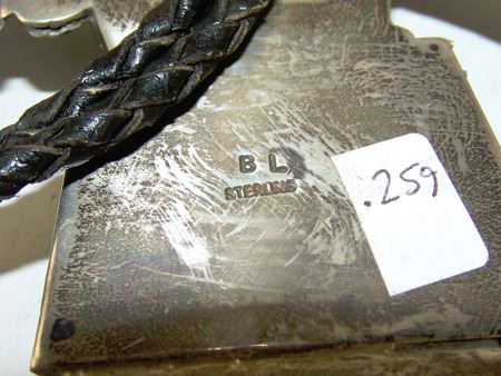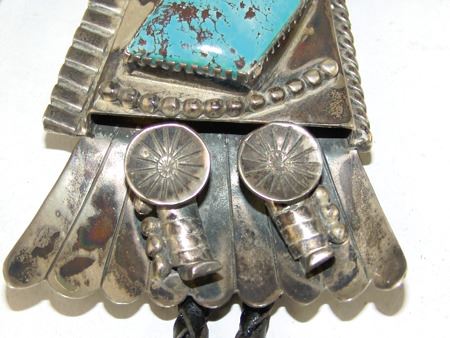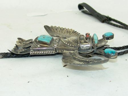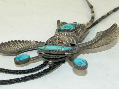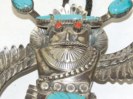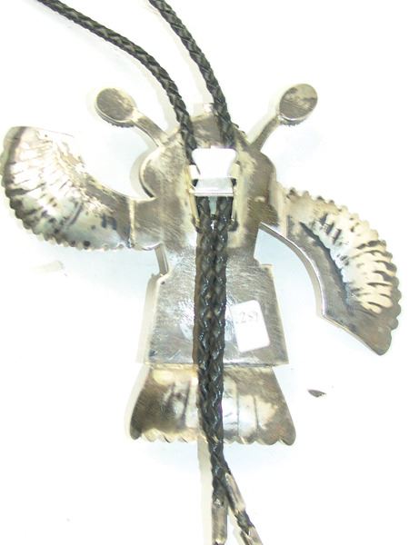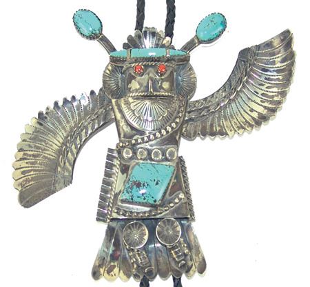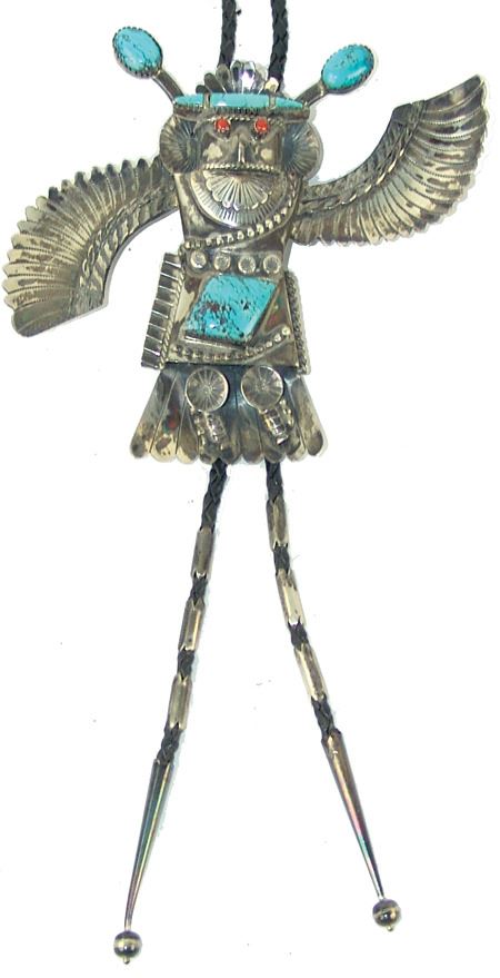 Ca. 1980s, Impressive hand wrought original design all-silver bolo tie depicting an eagle dancer with outstretched wings, intricate detailing, and turquoise stones. Very good condition, signed "BL." Bolo 5-1/4" x 6-1/2"