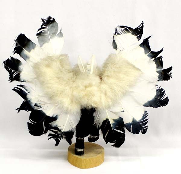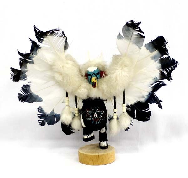 Native American Navajo Eagle Kachina by Virginia Martinez, measures 15'' x 12'' x 3'' which includes the feathers, signed on the bottom, embellished with feathers, leather, rabbit fur, and pony beads