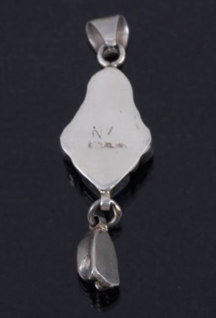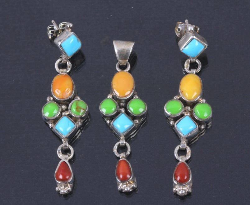 In this lot we have a set of Navajo Native American jewelry consisting of a pair of earrings and a matching pendant. The pieces are constructed out of sterling silver inlayed with turquoise, coral, gaspeite, and orange coral. The set is well made and is marked "N I - Sterling". The piece measures 2" long by 1/2" wide.