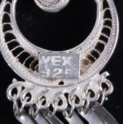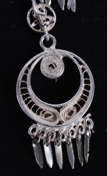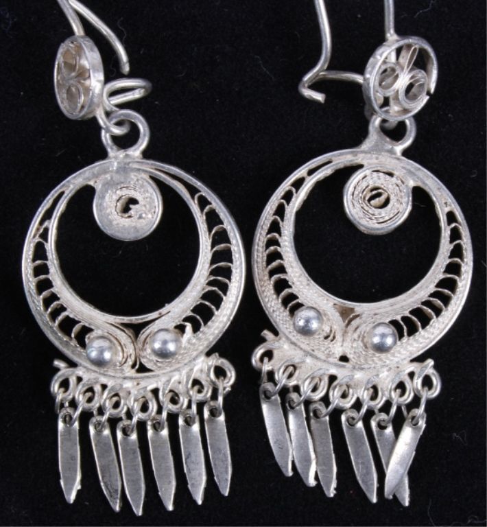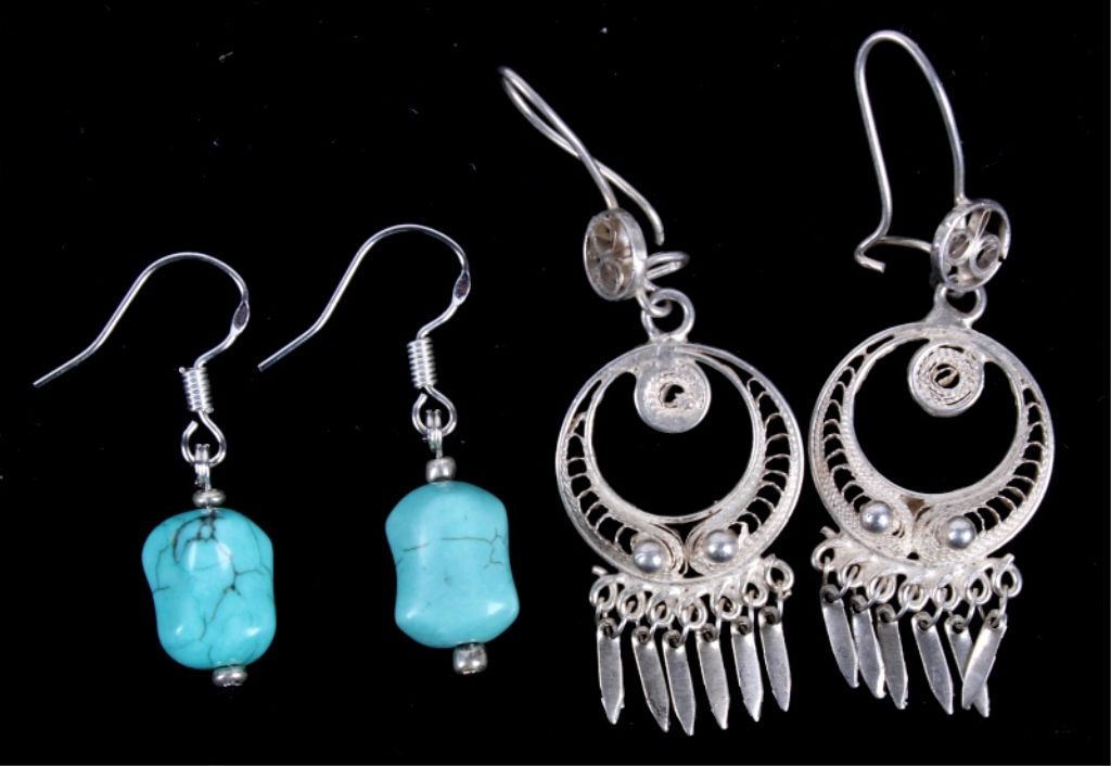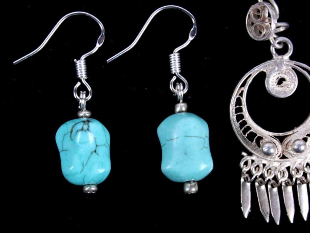 The earrings features a set of turquoise and silver and also a worked Mexican Indian Silver (marked .925) earrings, both with a vintage age.