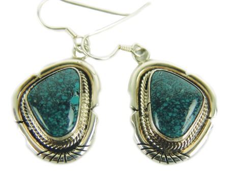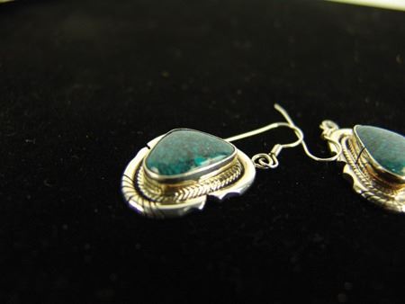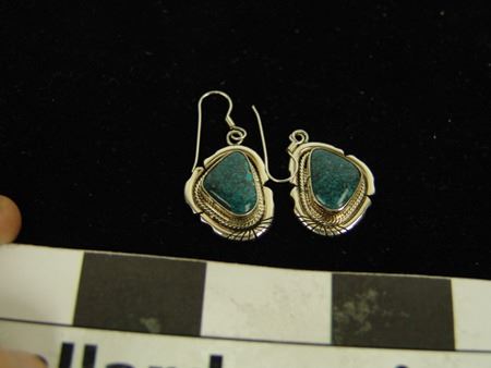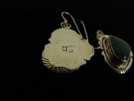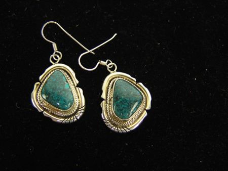 Early 2000s, Fine traditional pair of hand wrought all-silver earrings with single turquoise stones. Excellent condition. 1"