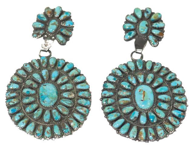Circa 1980s, Pair of large hand wrought silver and turquoise cluster drop earrings with 106 hand cut Kingman turquoise cabochons. 2" x 3-1/2"