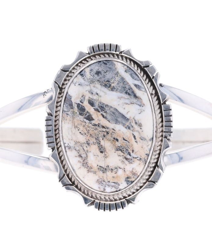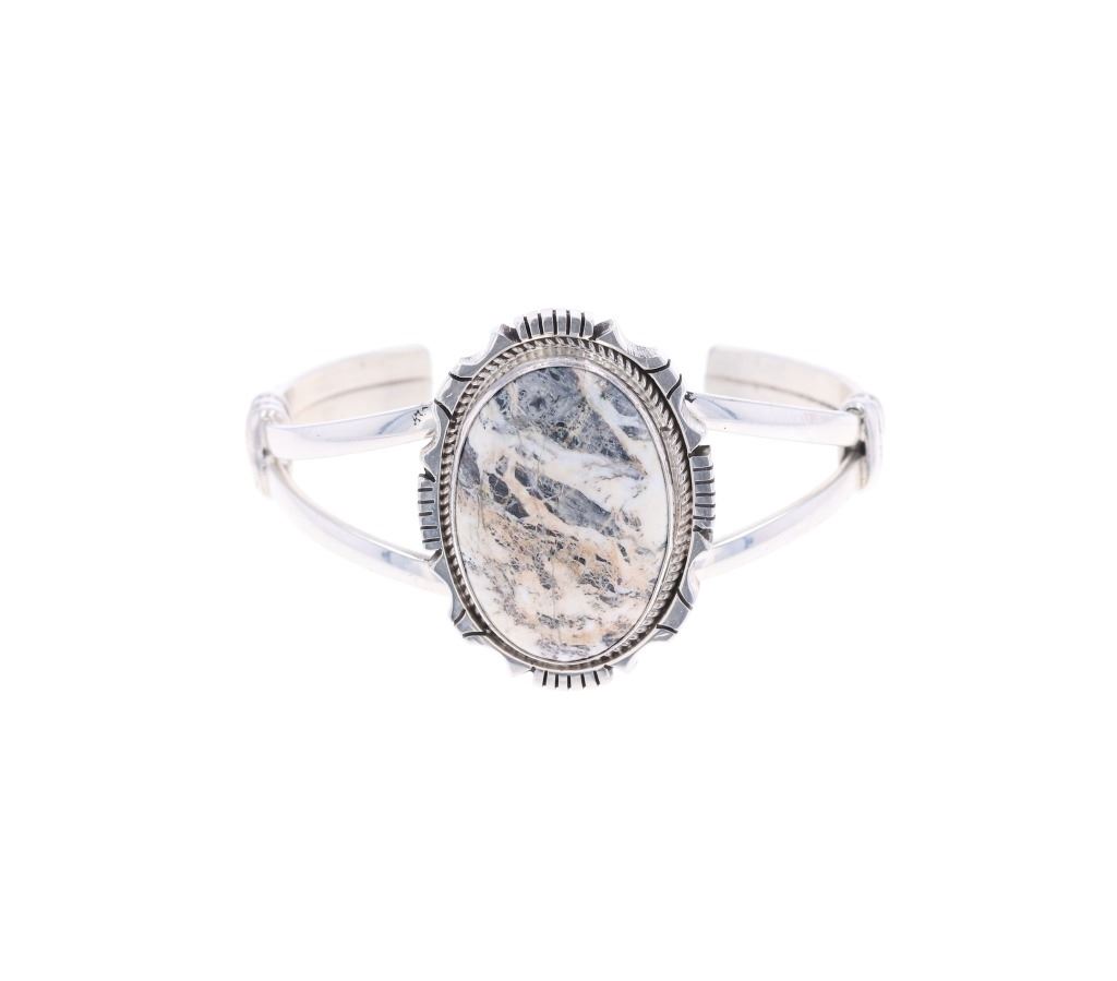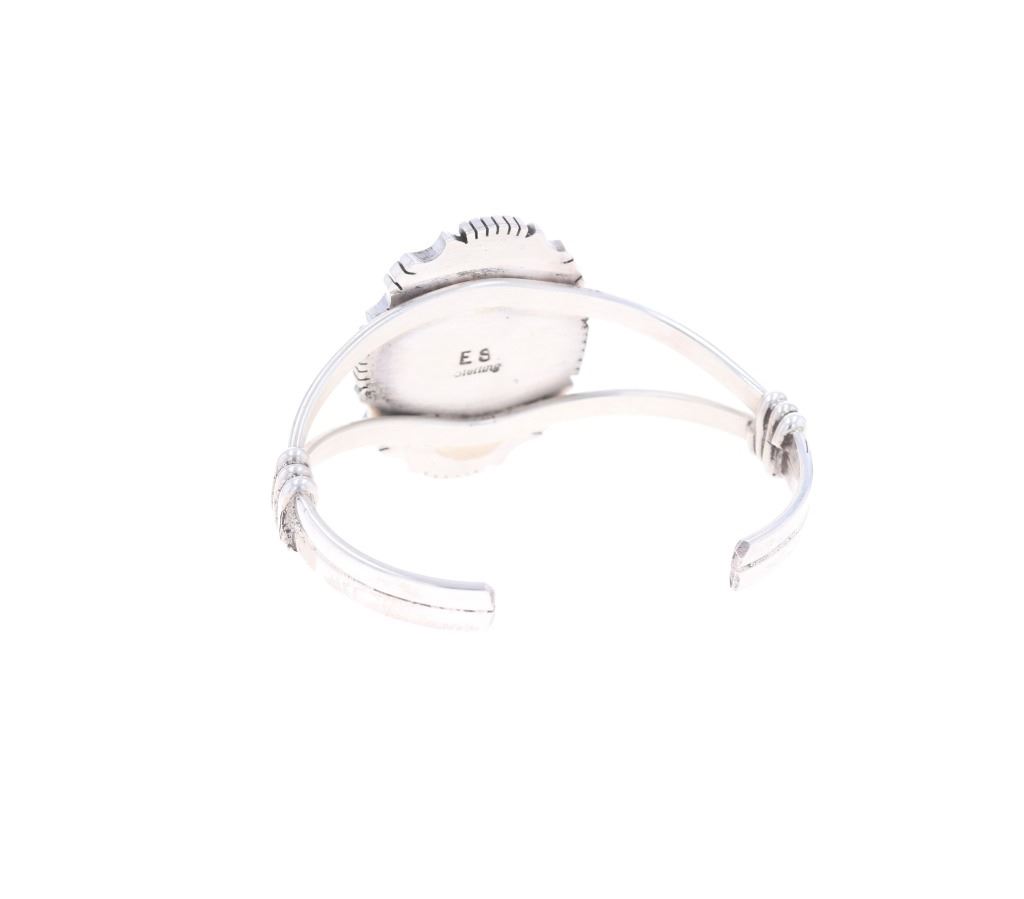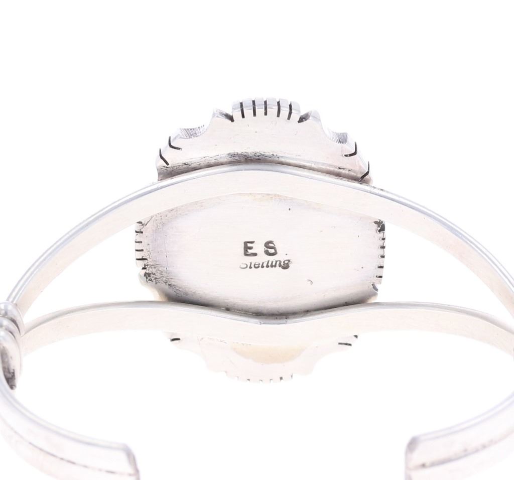 Featured in this lot is an Original Navajo Eddie Secatero Sacred Buffalo Turquoise Sterling Cuff Bracelet. The lack of any specific color consistency makes this stone distinctive and unique from other turquoises. Because this turquoise is as rare as the sacred buffalo, the Indians call it “Sacred Buffalo” Turquoise. This stunning cuff bracelet features a large Sacred Buffalo cabochon mounted in a classic bezel cup sitting on a modern stlzed base, silver beads lining the interior rim of the base. Impressive split shoulder shank, hallmark "ES" and "Sterling" stamped on reverse. This beautiful cuff bracelet is in very nice condition. Box measurement is 1.75"H x 1.375"W x 2.25"L, cuff is 5.75" which includes 1" opening, combined weight is 28.5 grams.