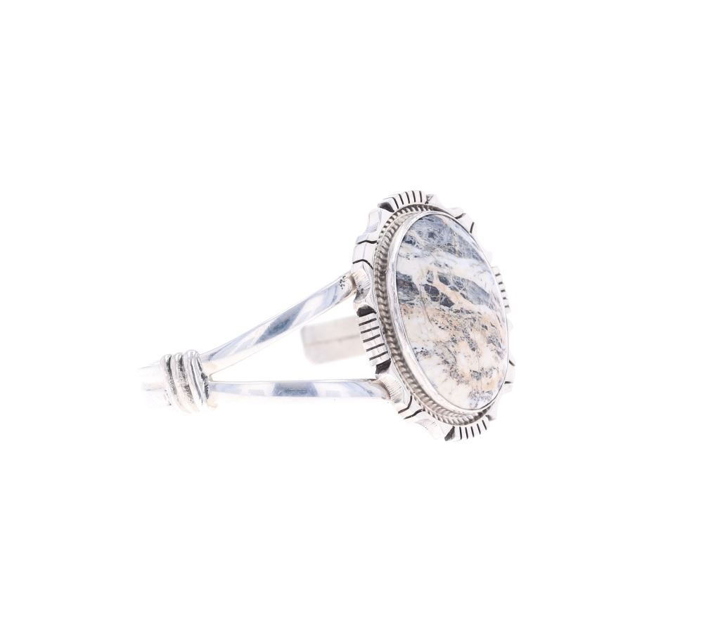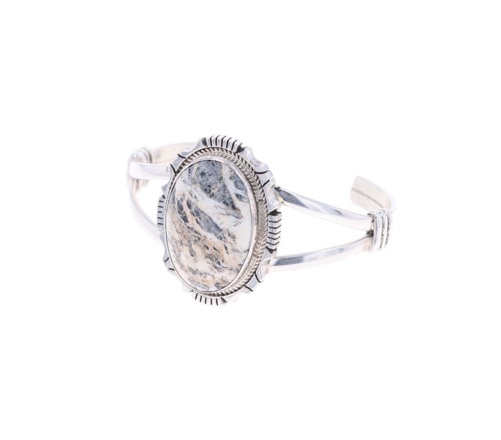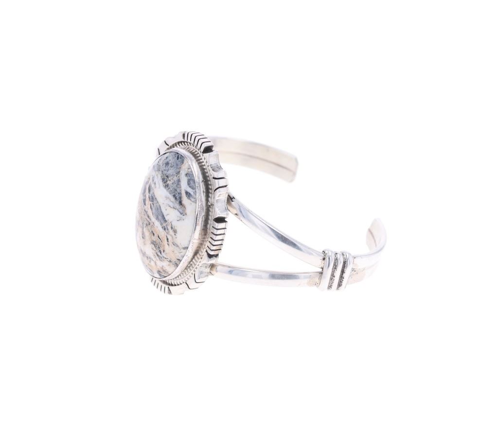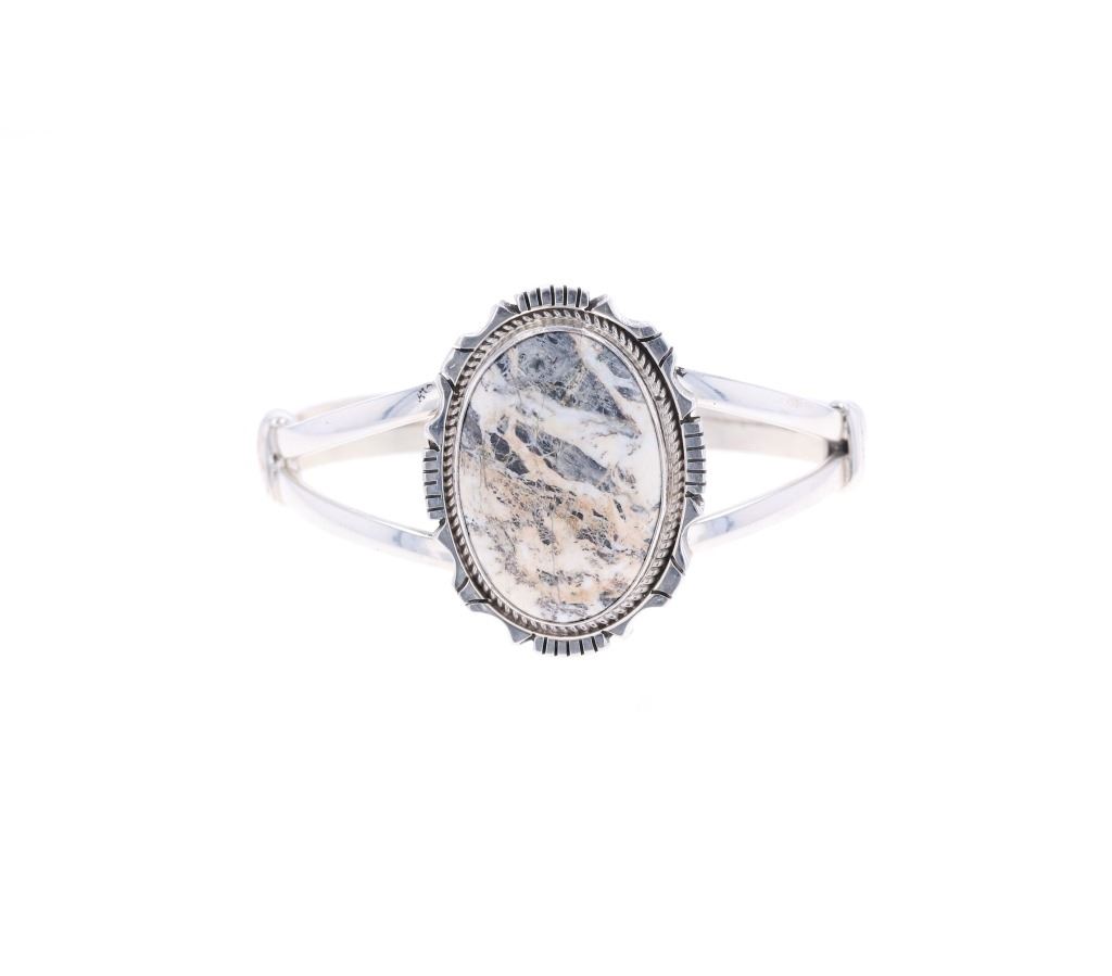 Featured in this lot is an Original Navajo Eddie Secatero Sacred Buffalo Turquoise Sterling Cuff Bracelet. The lack of any specific color consistency makes this stone distinctive and unique from other turquoises. Because this turquoise is as rare as the sacred buffalo, the Indians call it “Sacred Buffalo” Turquoise. This stunning cuff bracelet features a large Sacred Buffalo cabochon mounted in a classic bezel cup sitting on a modern stlzed base, silver beads lining the interior rim of the base. Impressive split shoulder shank, hallmark "ES" and "Sterling" stamped on reverse. This beautiful cuff bracelet is in very nice condition. Box measurement is 1.75"H x 1.375"W x 2.25"L, cuff is 5.75" which includes 1" opening, combined weight is 28.5 grams.