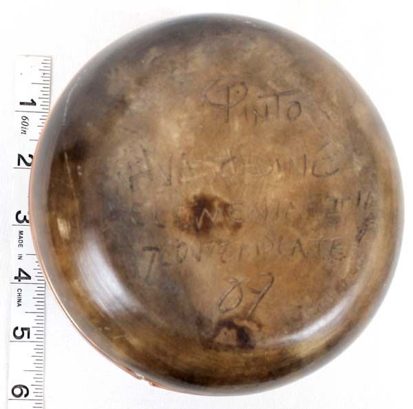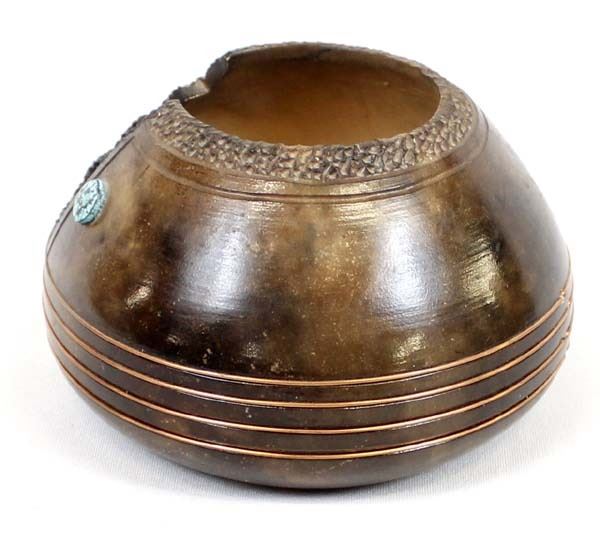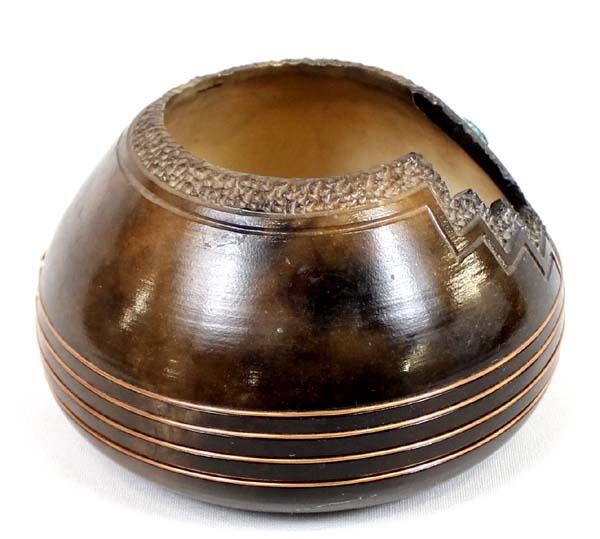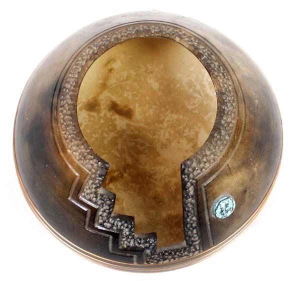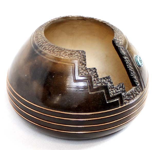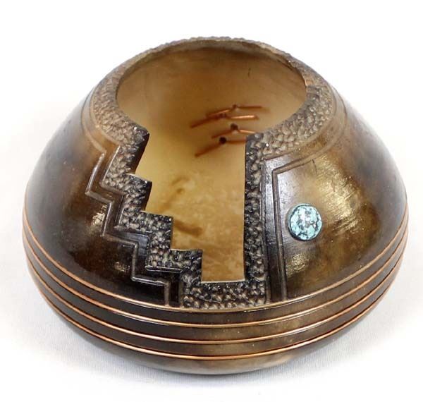 Native American Navajo ''Elemental II'' Pottery Bowl by Gerald Pinto of Vanderwagon, NM, measures 4'' x 5'' and is embellished with a Kingman Turquoise cabochon and copper wire, signed on the bottom and comes with provenance, features a cutaway stairstep rim and side, made of a base of white gypsum clay, armored with an iron oxide slip and pit-fired with cedar, stunning piece