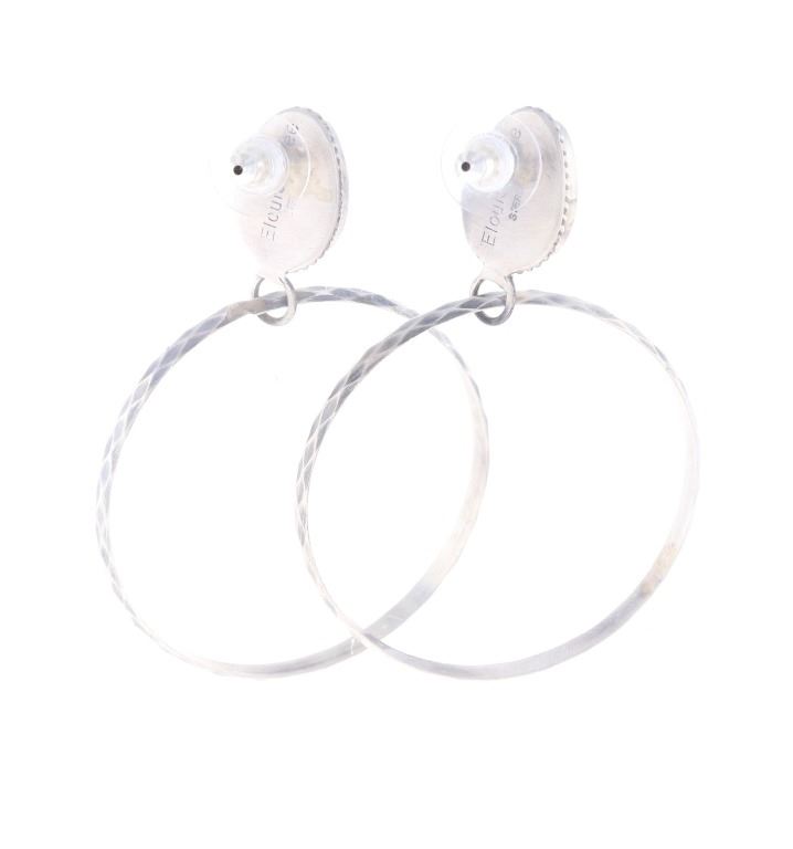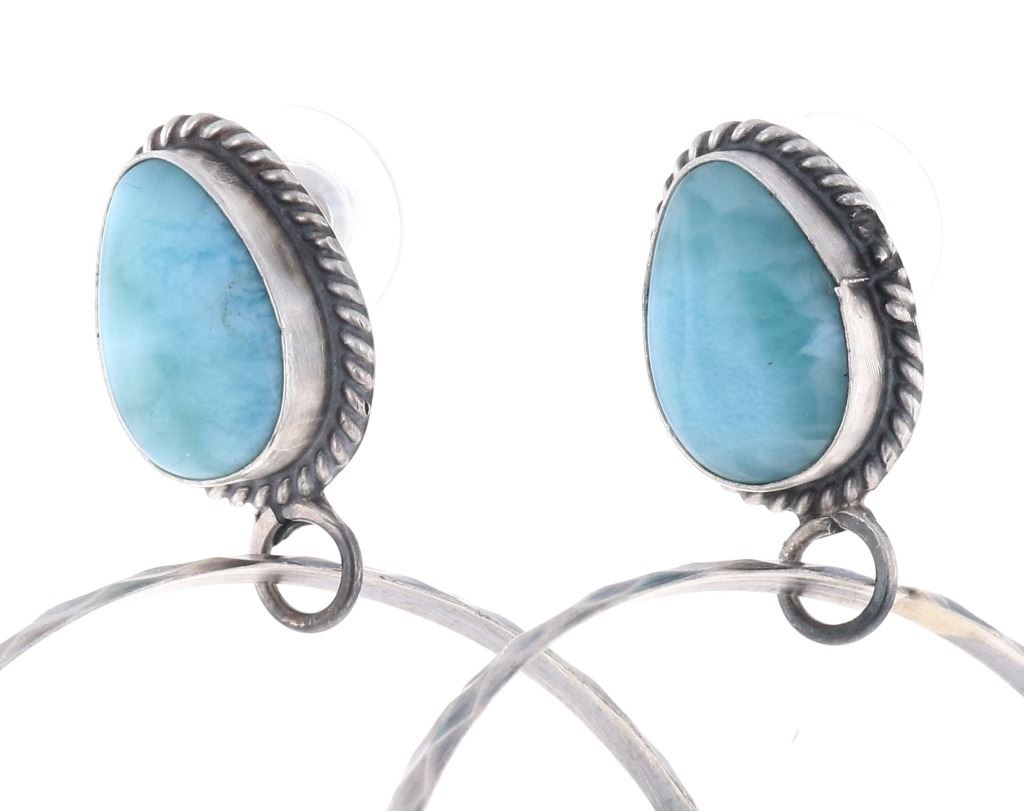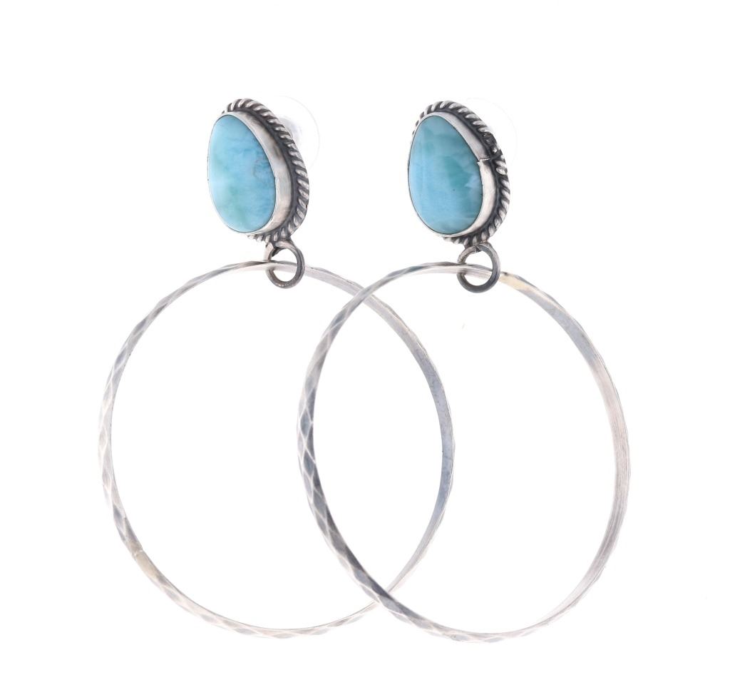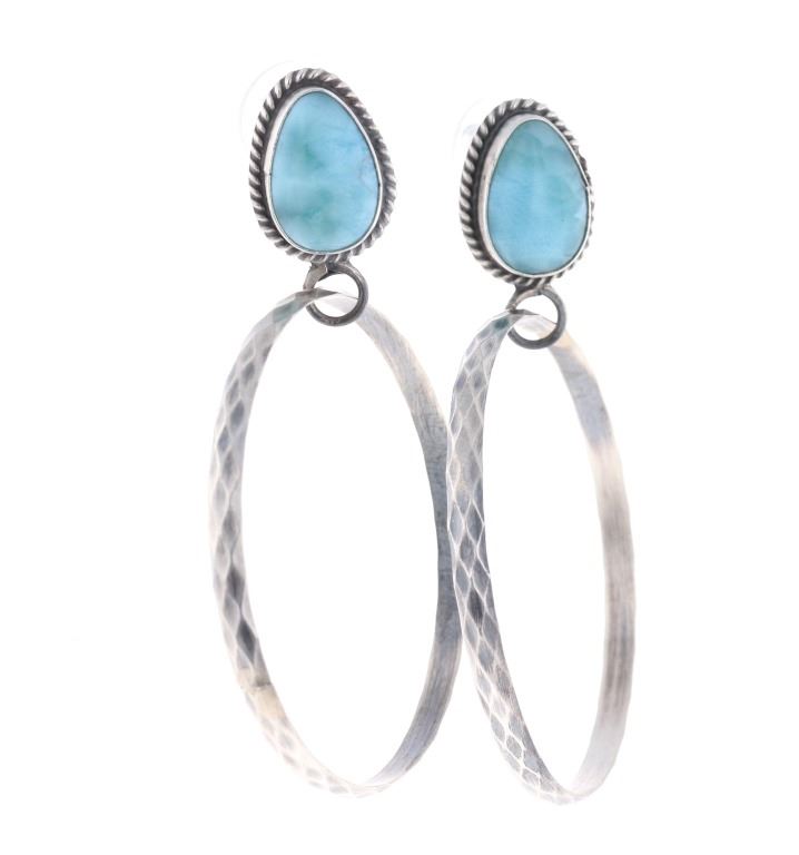Featured in this lot is this pair of sterling silver and larimar hoop earrings from Navajo artist Elouise Kee. The earrings feature beautifully and professionally crafted sterling silver hoop design with semi rounded pear shape larimar cabochons set into the stud portion of the earrings. The artist’s hallmark can be seen above a 'sterling' stamp. The condition of this pair of earrings is good, with no obvious signs of damage. The measurements of these earrings are 2 3/4" x 1/2" x 2". The overall weight of these earrings is 15g.