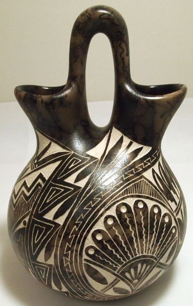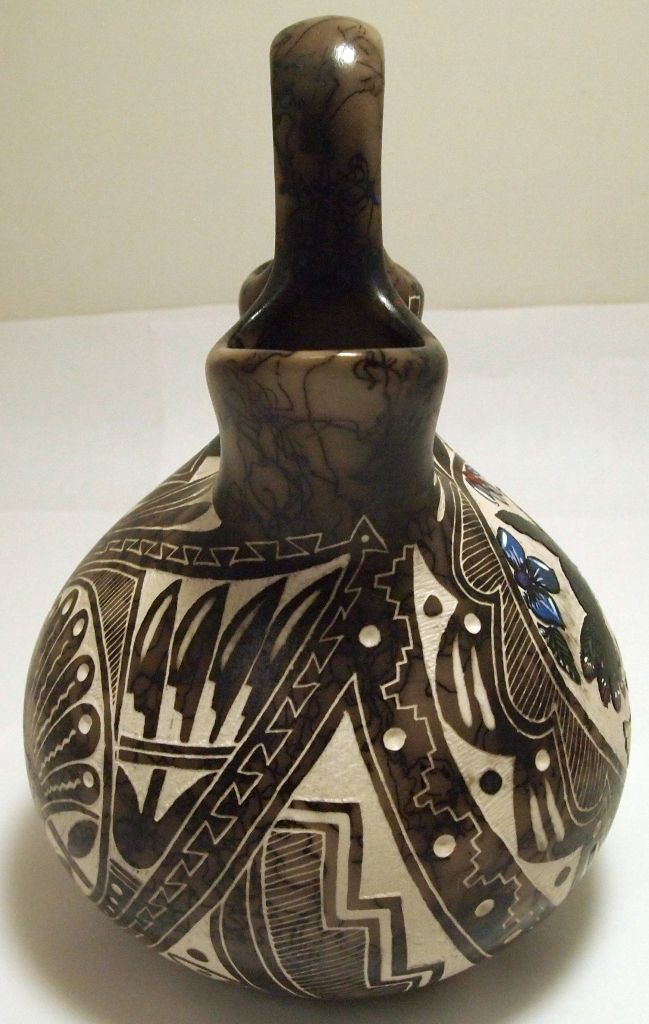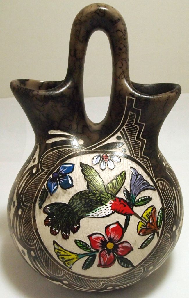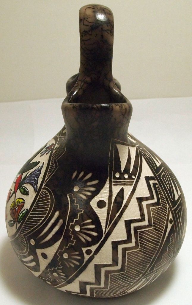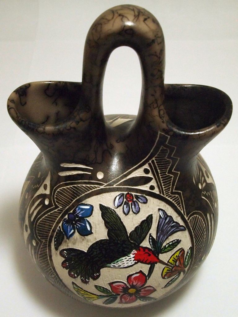 Navajo Etched & Hand-Painted Double-Fluted Hummingbird Pottery - Everson Whitegoat