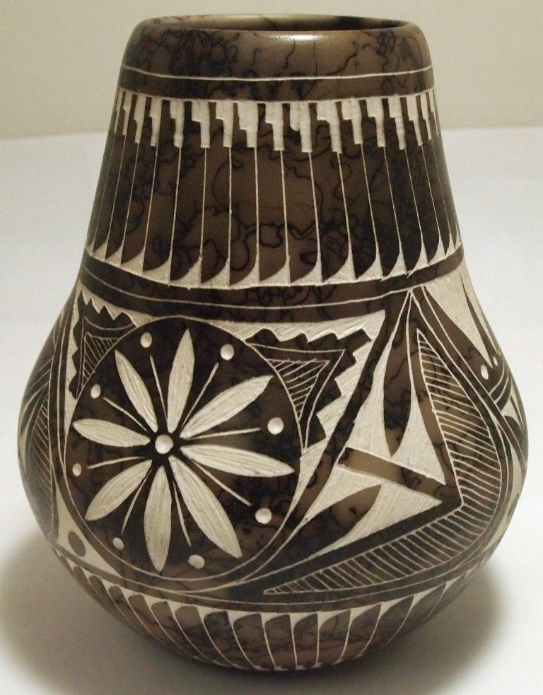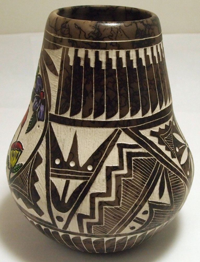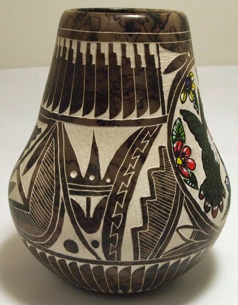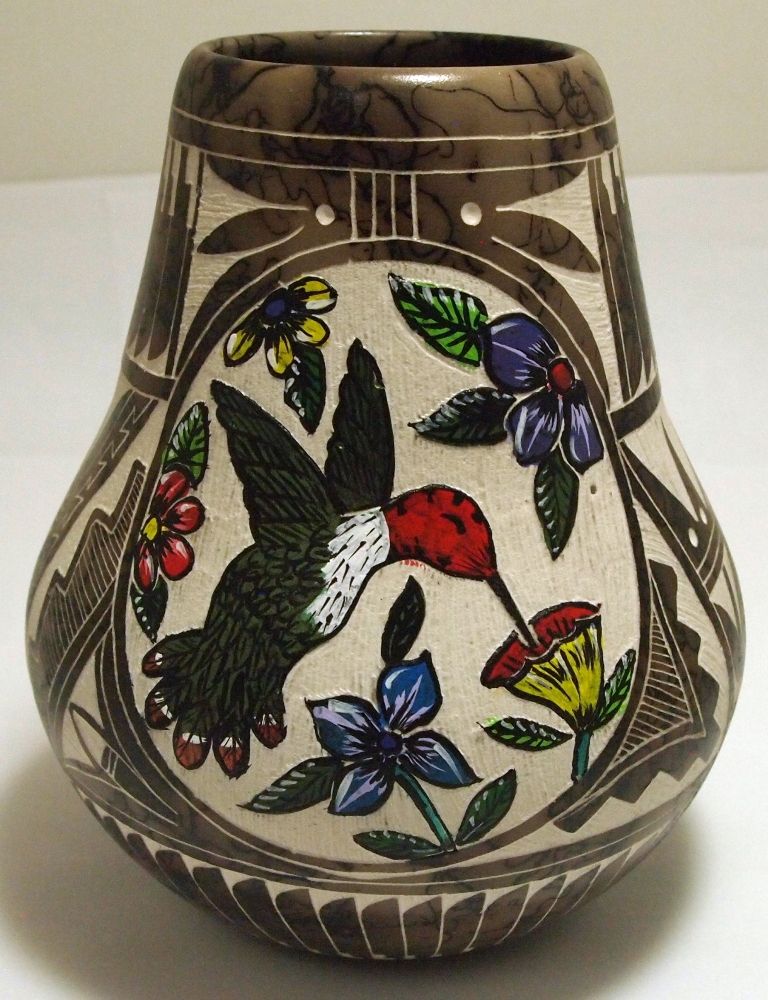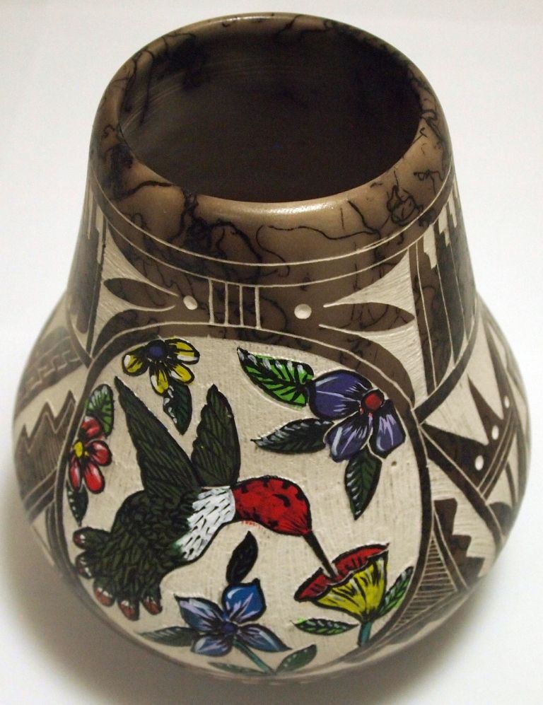 Navajo Etched & Hand-Painted Hummingbird Pottery - Everson Whitegoat