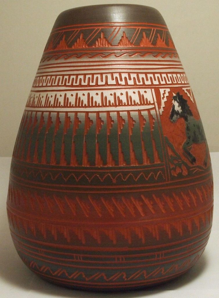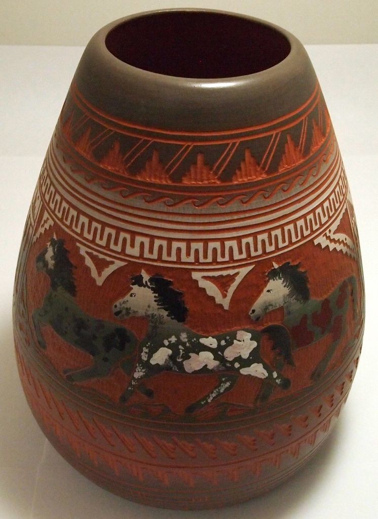 Navajo Etched & Painted Horses Pottery - Aaron Watchman