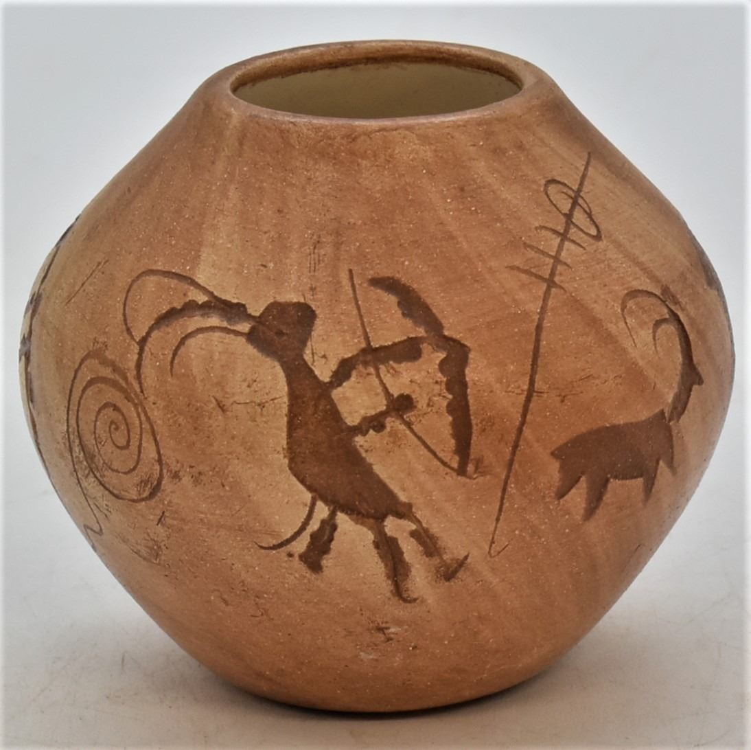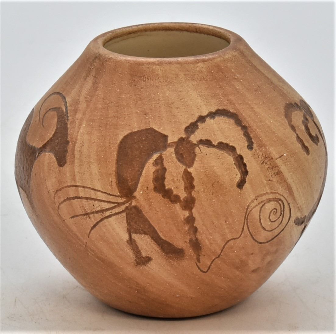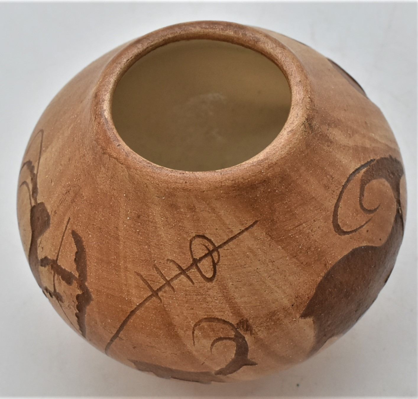 Native American Navajo Etched Petroglyph Pottery Jar by Binisht'aa (AKA Julia Blackhorse), measures 3'' x 3.5'' and is signed on the bottom, features kokopelli, hunter, and deer (antelope)