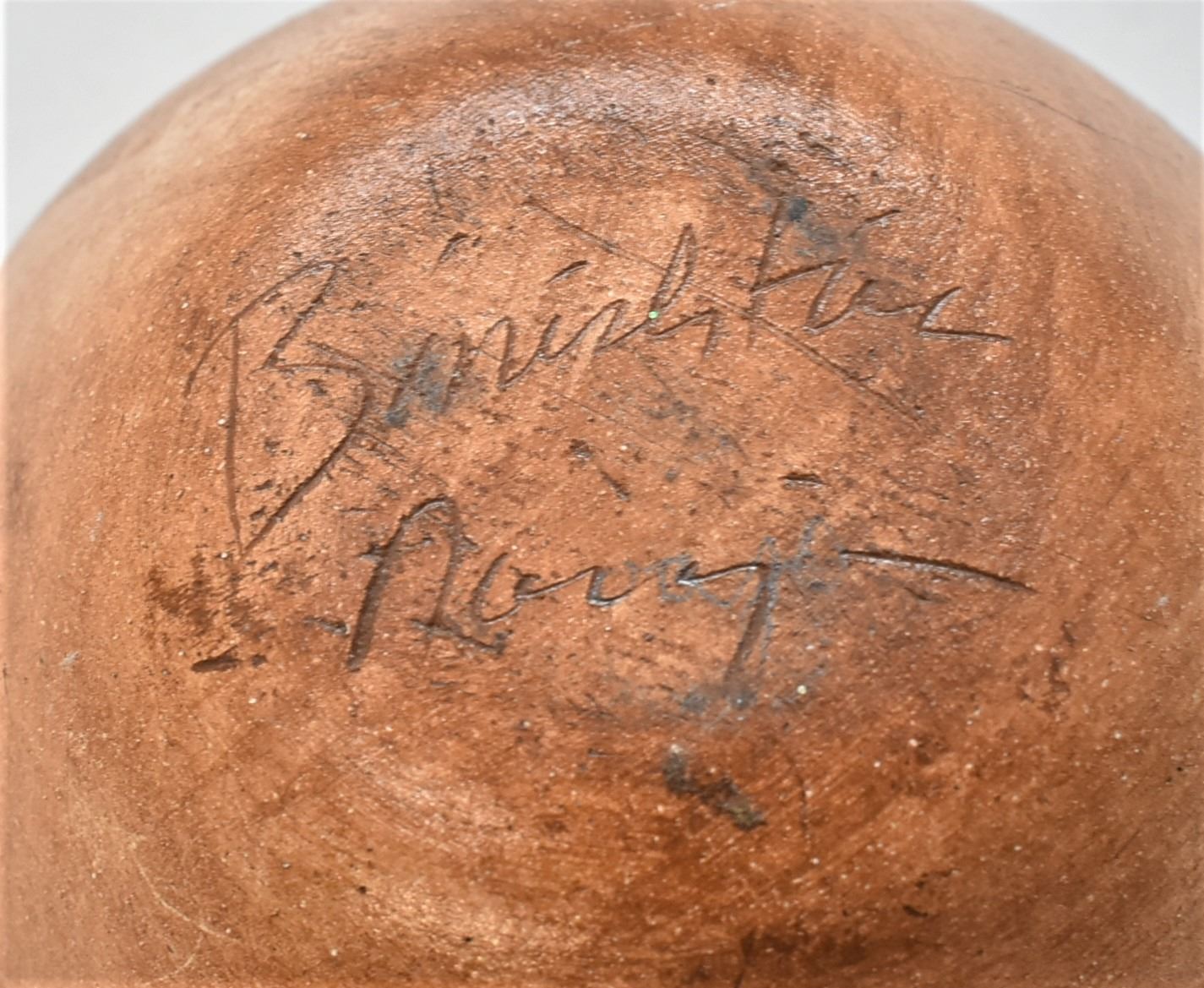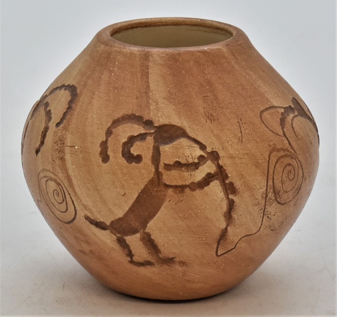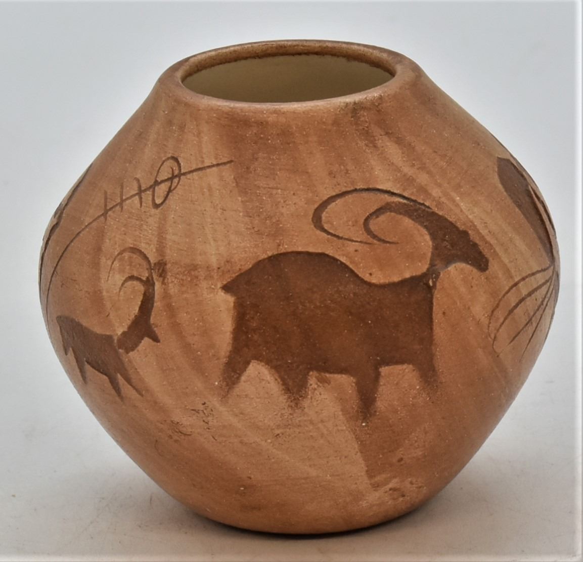 Native American Navajo Etched Petroglyph Pottery Jar by Binisht'aa (AKA Julia Blackhorse), measures 3'' x 3.5'' and is signed on the bottom, features kokopelli, hunter, and deer (antelope)