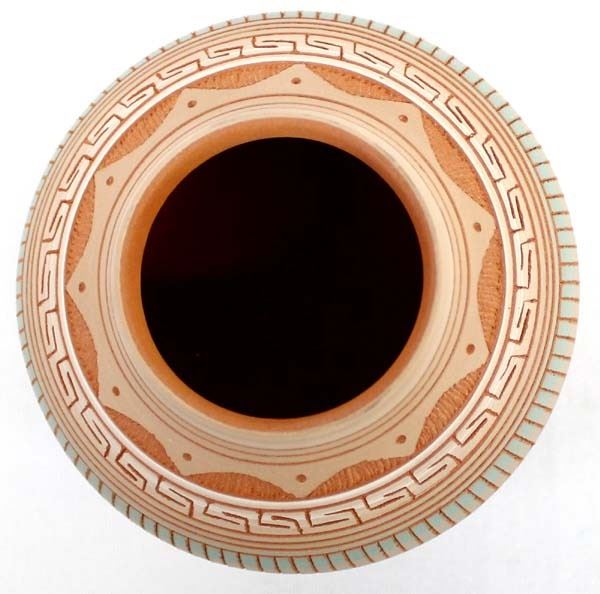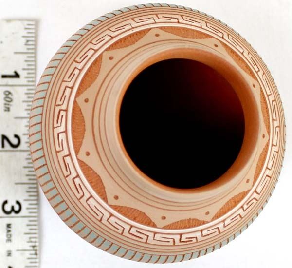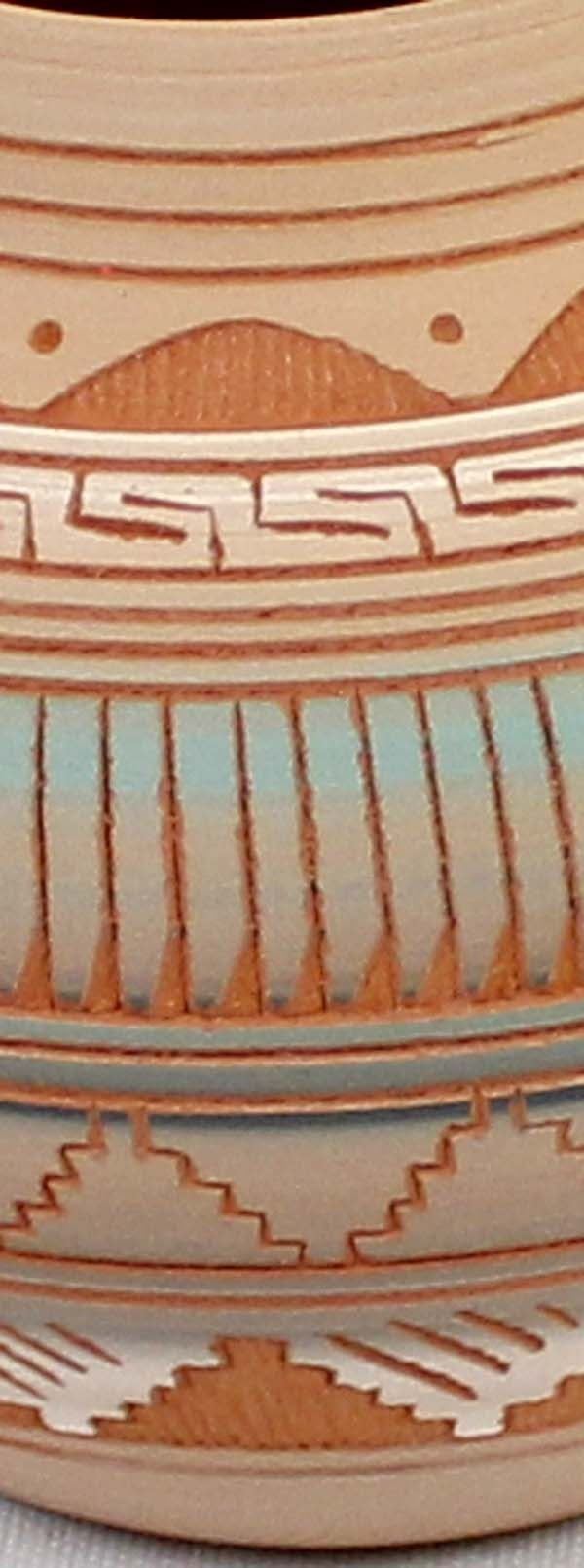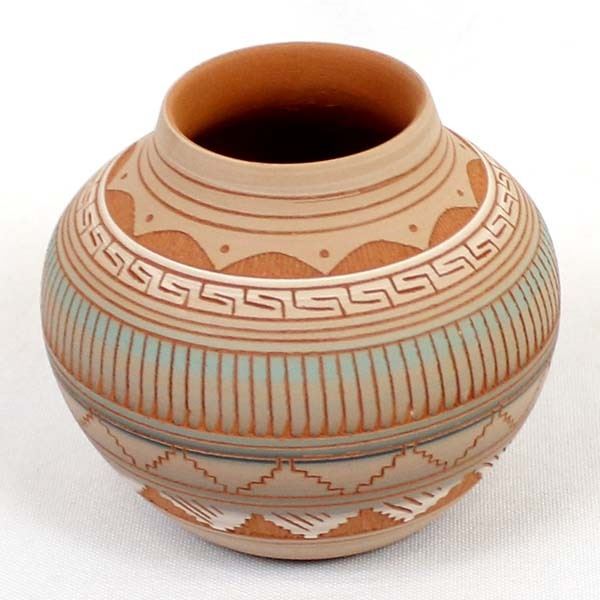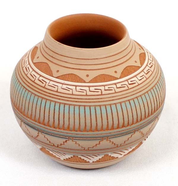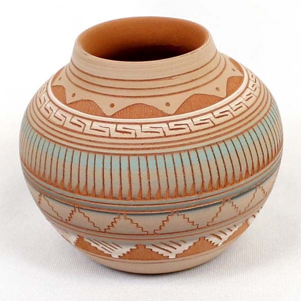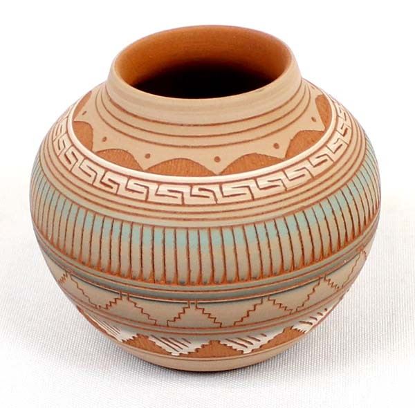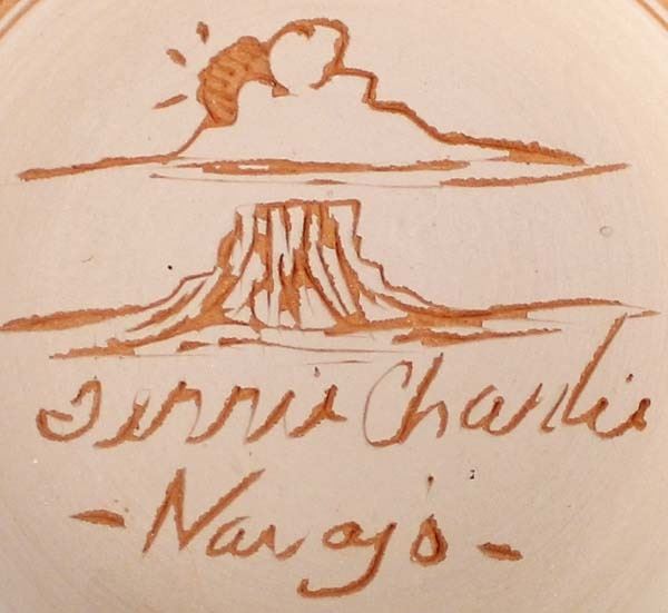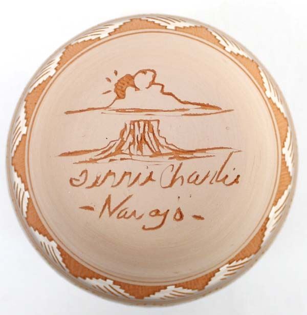 Native American Navajo Etched Pottery Jar by Terrie Charlie, measures 3'' x 4'' and is signed on the bottom, beautiful colors