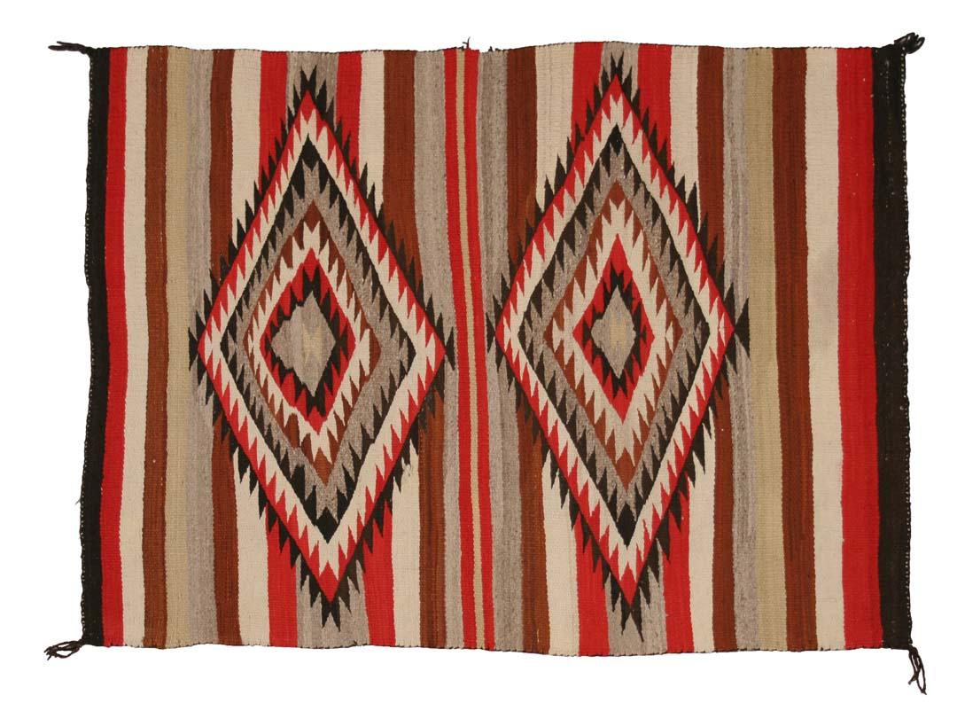 Navajo Weaving. 66" x 50". Eye dazzler design. Circa 1930s-1940s. (est $600-900). For condition reports please visit: www.auctioninsantafe.com/cr2011.pdf