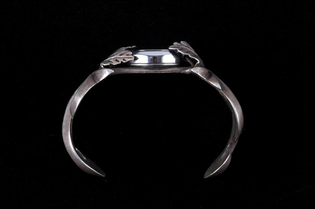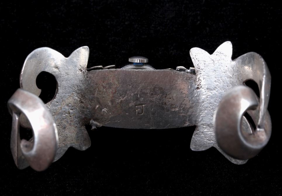 For consideration is this Navajo sand cast sterling silver watchband from Navajo artist Frances Jones. The watchband shows iconic sand cast silver construction with designs and decorum consistent with Navajo silverwork. Sand Casting uses a special type of sand that has a clay-like consistency to create a mold into which molten silver is poured. The watch inside is a petite Timex watch. The condition of this bracelet is good and shows good overall display condition. The measurements of this watchband 2" x 2 3/4" x 1 1/4". The collective weight of this watchband is 61.6g.