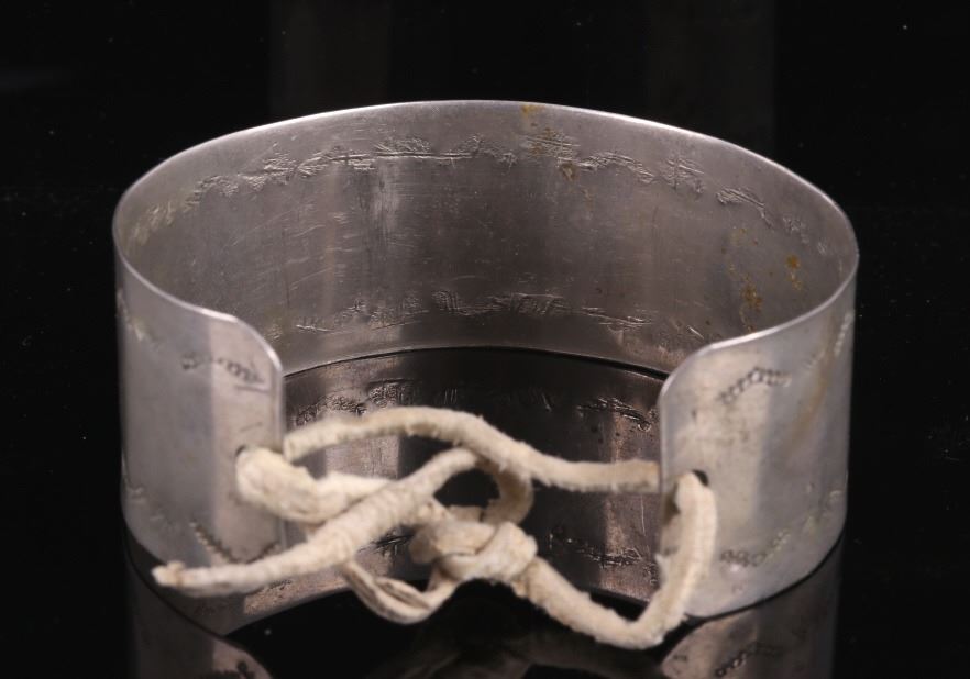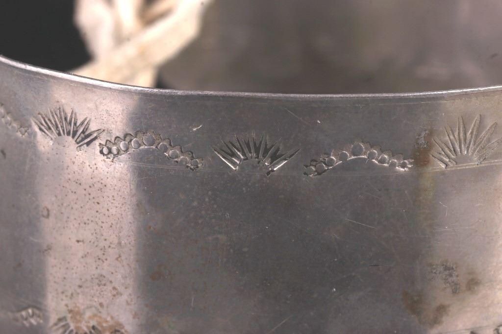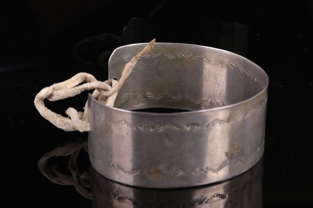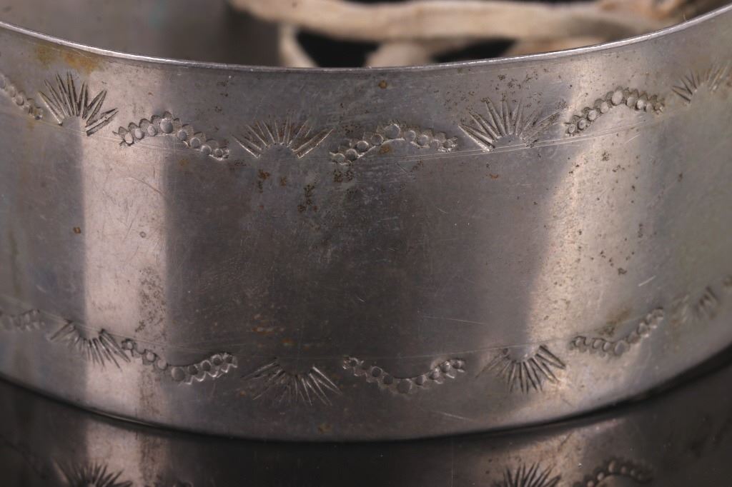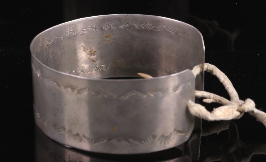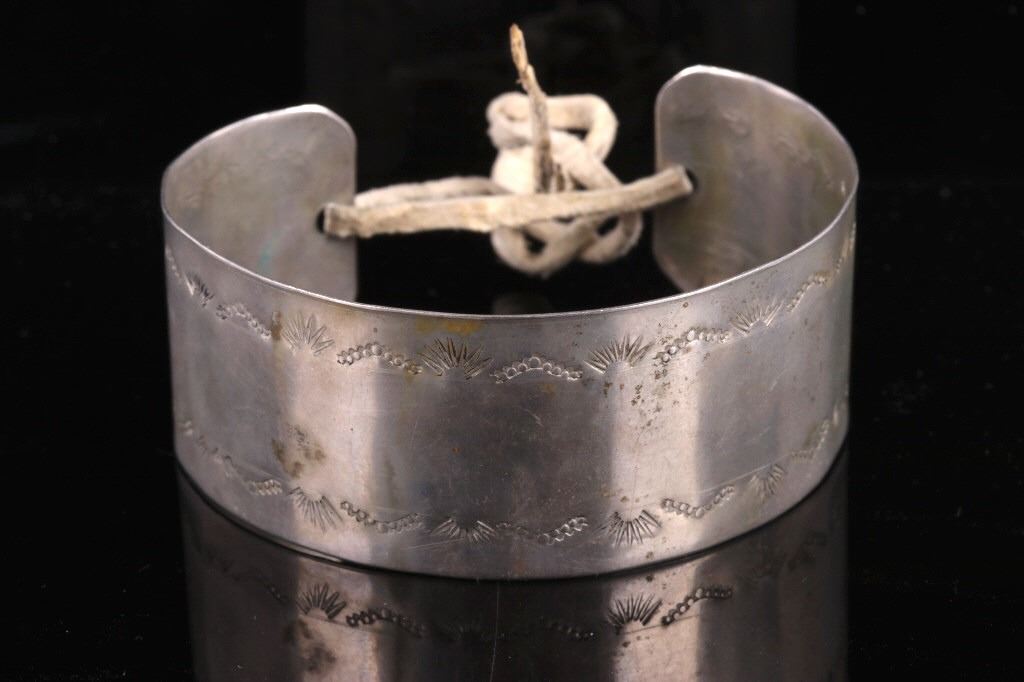 This is an excellent historic Navajo Native American Indian First Phase Silver bracelet dating to the 19th Century. The 1st Phase trade silver bracelet features a large size with wide cuff and hand stamped worked design. The end shows two punctured holes with a bit of Indian tanned hide. The bracelet shows a faint hand-written museum collection inventory number on the inside of the cuff. The bracelet shows a more basic design with thin trade silver and is believed to be of the first phase era. Early silver pieces such as these are exceedingly rare. Provenance: From the renowned Sundog Fine Art Bozeman, Montana collection and collected by Bruce VanLandingham. Bruce VanLandingham was a pillar in the American Indian collecting community and a respected expert. Along with being an avid collector Bruce also was the sole owner of Sundog Fine Art in Bozeman which was both part museum and gallery. The bracelet measures 3 3/8” across by 3” from wrist opening to top of bracelet by 1.25”W across the top. The inside of the bracelet including the opening shows a 9.25” circumference wrist size.