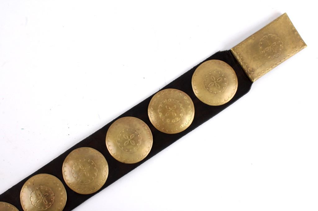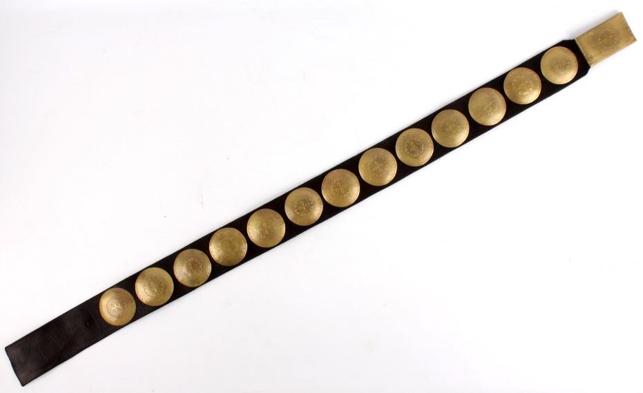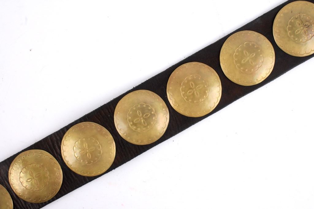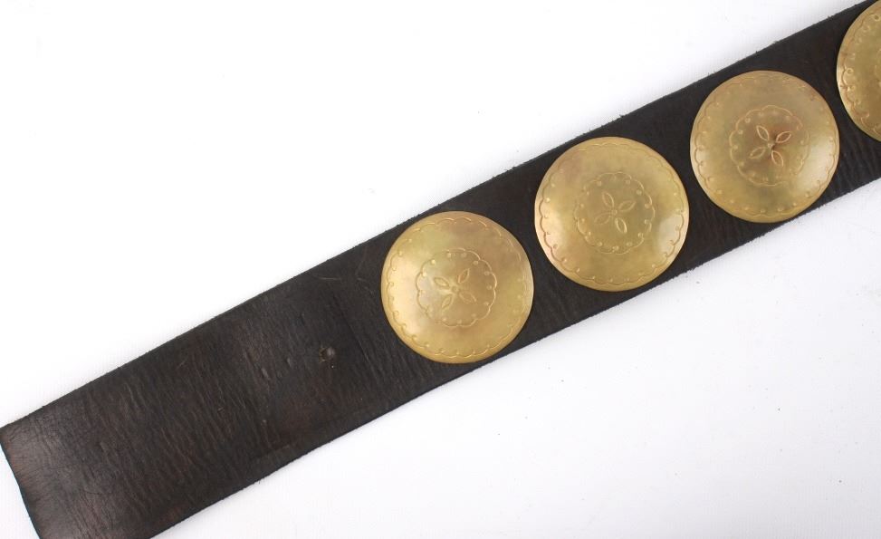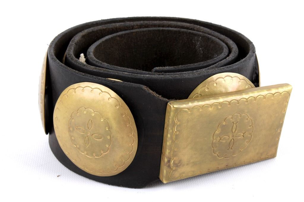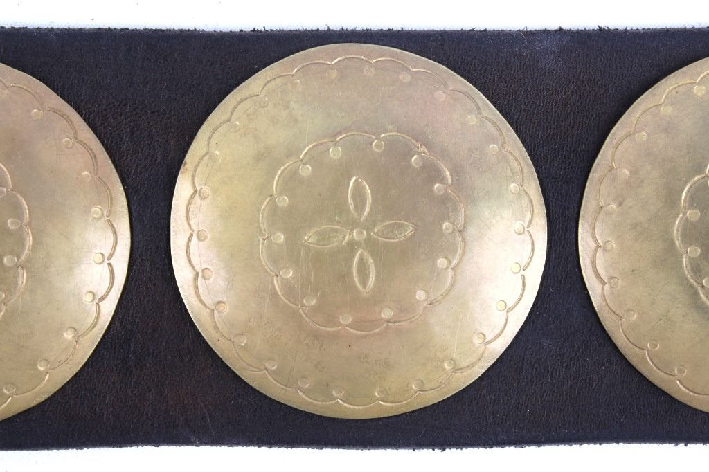 For your consideration is a Navajo Native American first phase style silver concho belt. This first phase style belt showcases thirteen large conchos, strung on a black leather belt. Each of the conchos is handmade and shows beautiful hand tooled and stamped accents. These thirteen conchos measure 2 3/8” in diameter and the buckle measures 3 ½” x 2”. These conchos show an amber patina and are tied to the leather belt with a thin leather rope along the back of the belt. The leather belt measures 2 ½” wide and 41 ¼” long. The conchos were scratch tested as sterling but content is possibly brass.
